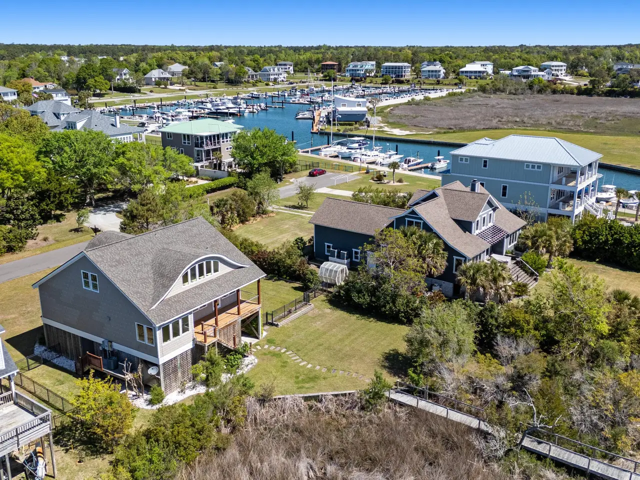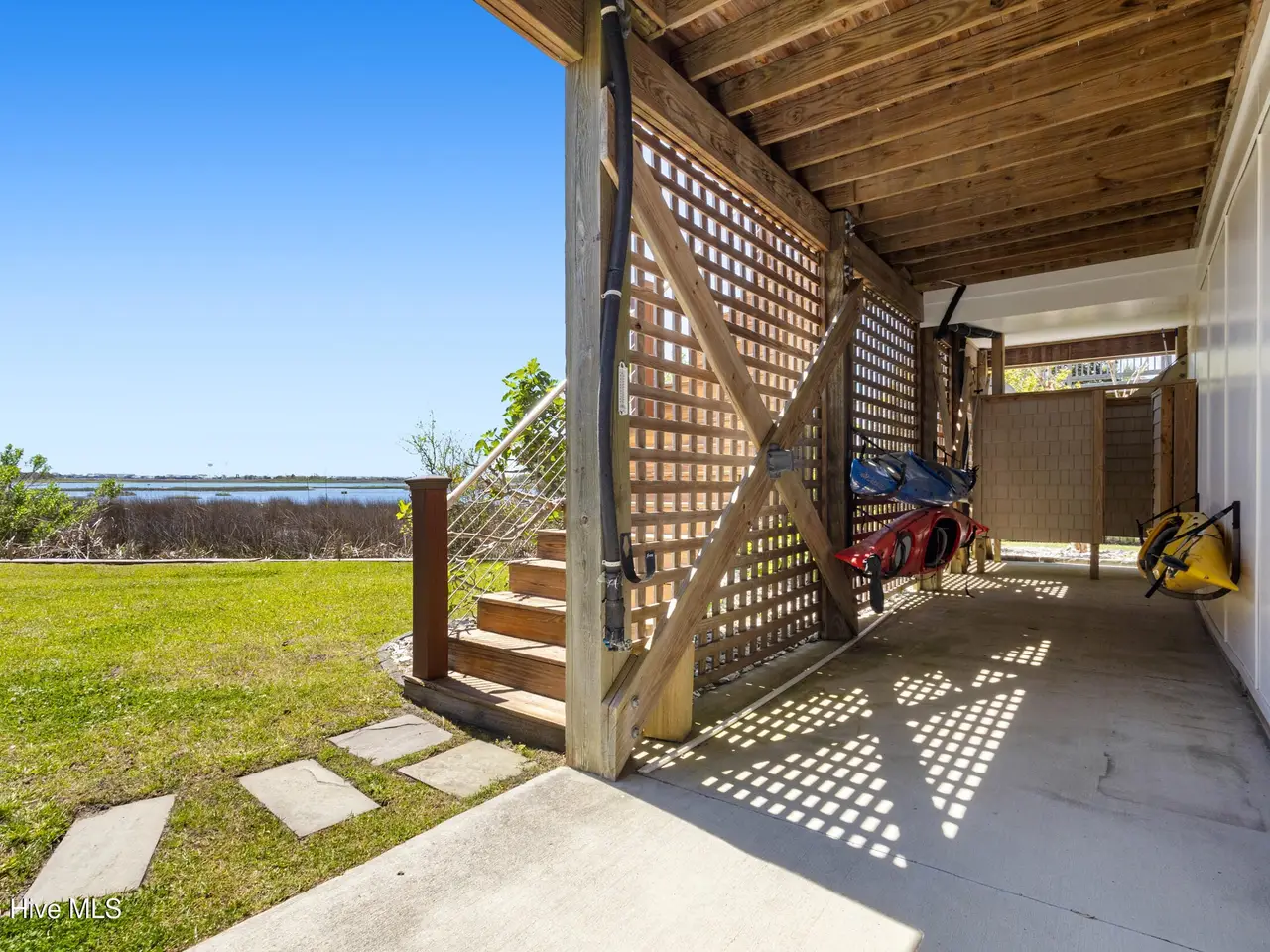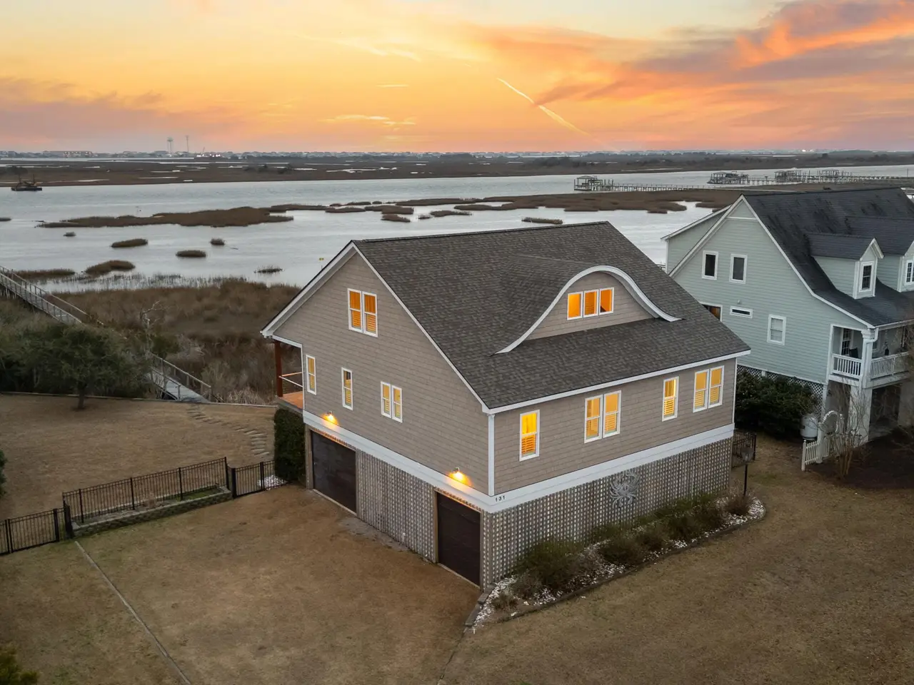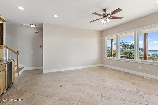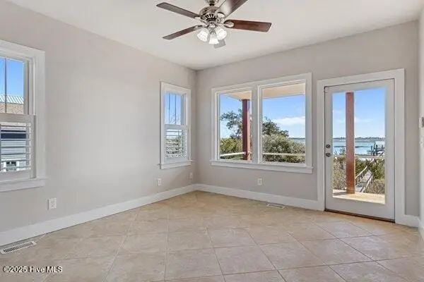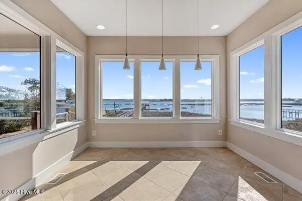 Nestled along 100 feet of pristine waterfront, this exceptional 3 bedroom, 4.5 home (plus two additional upstairs flex rooms with closets) is the perfect blend of thoughtful craftsmanship with the serenity of coastal living! The monolithic slab construction and Zip-Wall System ensure lasting strength, while the new architectural shingled roof (installed 11/2024) and impact-resistant windows provide peace of mind. Step inside, and you'll be greeted by luxurious 20x20 Spanish stone tile flooring, featuring a compass rose, setting the stage for a home that is both refined and inviting. The custom KraftMaid maple cabinetry offers soft-close dovetail drawers throughout, while the built-in wet barfeaturing a one-of-a-kind sea turtle tile backsplashcreates the ideal space for entertaining. With an elevator-shaft, a whole-house water filtration and softener system, and a cedar-lined storage window seat in the spacious upstairs Family Bonus Room, every detail has been carefully curated for comfort and convenience. Freshly painted inside and out (12/2024), this meticulously maintained home also includes a garage workshop wired for 20A service, ample space for a small boat on a trailer, and three Carolina Perception kayaks with ruddersready for new owners to explore the beauty of the coast. Outside you will find where the expansive covered porch with Cypress decking and sleek cable railing invites you to unwind with beautiful unobstructed ICW views. Venture down to your oversized dock, featuring built-in seating, a full roof, a kayak launch, a fish-cleaning station, and drive-on boat docking for a flat bottom boat or jet skis; a dream setup for avid boaters and fishermen alike. The Harbour Village Marina and Topsail Inlet are just moments away, ensuring effortless access to the best coastal waters. This is more than a home; it's a legacy of waterfront living, where crabbing with a string, fishing and watching sunsets ensure memories to last a lifetime!