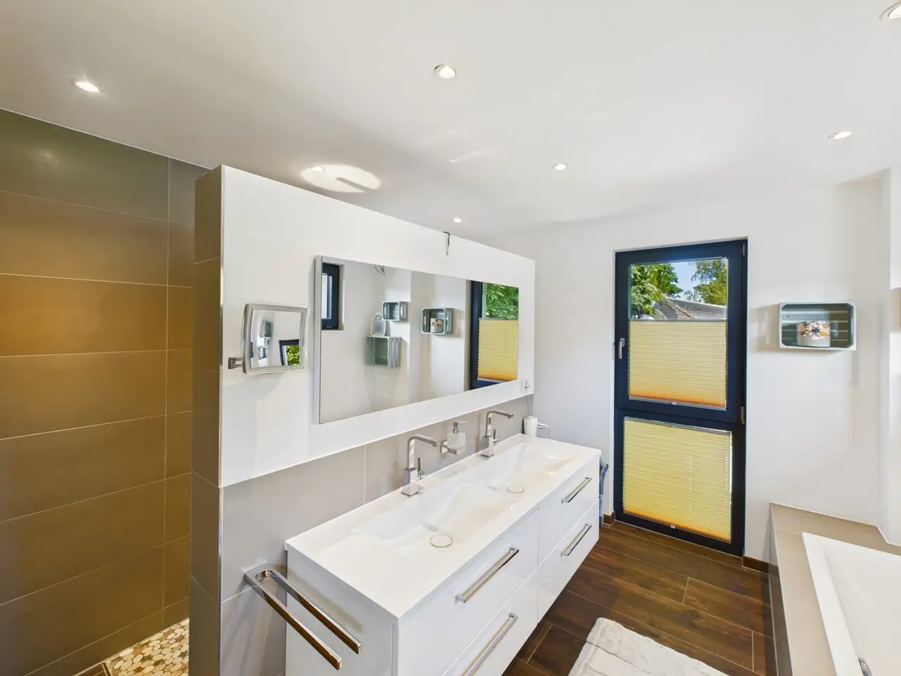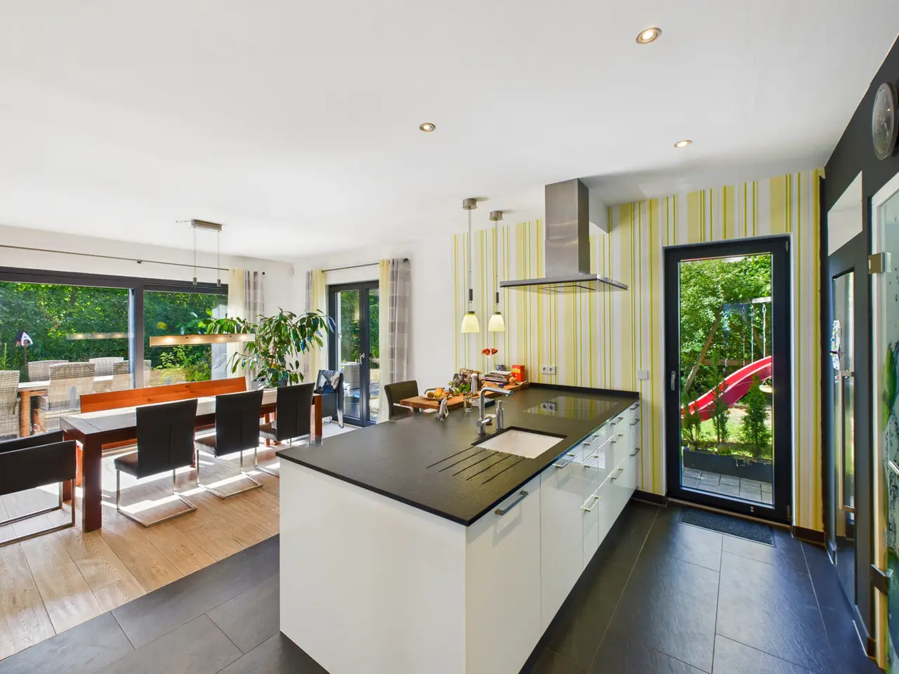 For sale is a detached house with a generous living space of approx. 155 m² on a plot of approx. 733 m². This house was built in 2013 and offers upscale furnishings and a carefully thought-out room layout. It is ideal for families looking for a comfortable and modern home. A conversion reserve in the attic of approx. 45 m² was already taken into account when the house was built. The first floor impresses with its impressive ceiling height, which creates a pleasant feeling of space. This is where the central living area is located, which looks particularly prestigious thanks to the use of high-quality parquet flooring. The spacious living room flows seamlessly into the dining area and offers plenty of space for sociable evenings and family gatherings. Large window fronts provide plenty of natural light and create a friendly, inviting atmosphere. The kitchen (Küchen Rosenowski) is directly adjacent to the dining area and is equipped with modern appliances that make cooking a pleasure. A utility room and a bathroom with shower complete the functionality of this floor. There are three spacious bedrooms on the upper floor. The master bedroom is particularly noteworthy as it has a walk-in closet and therefore offers plenty of storage space. The two other rooms are also well laid out and offer numerous design options. A modern bathroom with bathtub and shower offers sufficient comfort for the whole family. The outside area of the house invites you to linger and relax. The spacious garden offers plenty of room for children to play or to realize individual garden ideas. A terrace extends the living area outside and is the perfect place for summer barbecues or a relaxed breakfast at the weekend. The location of the house is pleasantly quiet, yet facilities for daily needs as well as schools and kindergartens are nearby and easily accessible. The house (KfW 70) is heated by central heating. The underfloor heating contributes to a pleasant living climate. This property combines modern living comfort with a well thought-out room layout and is particularly appealing to families who value high-quality furnishings. Please contact us for more information or to arrange a viewing. This house is ready to welcome its new owners.