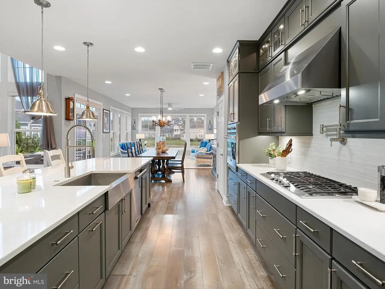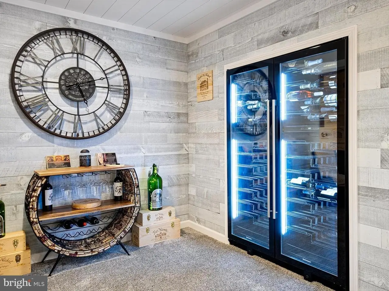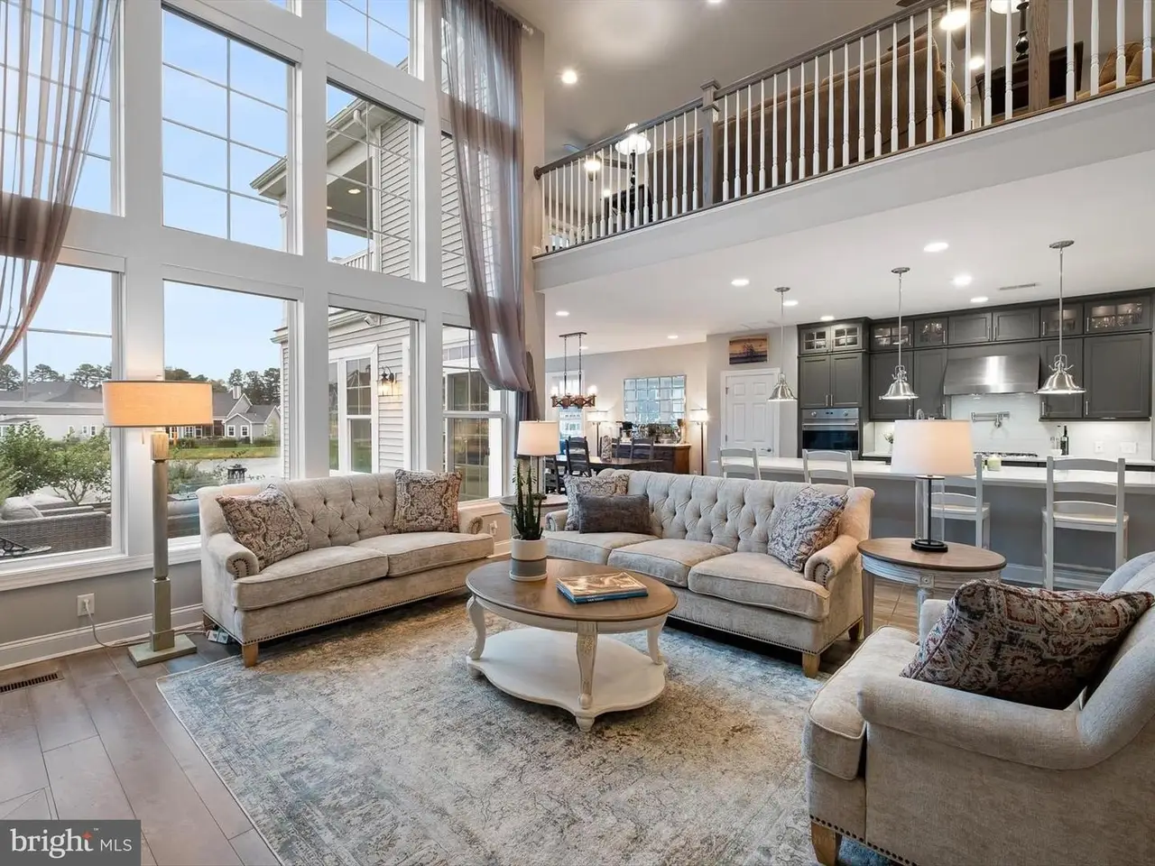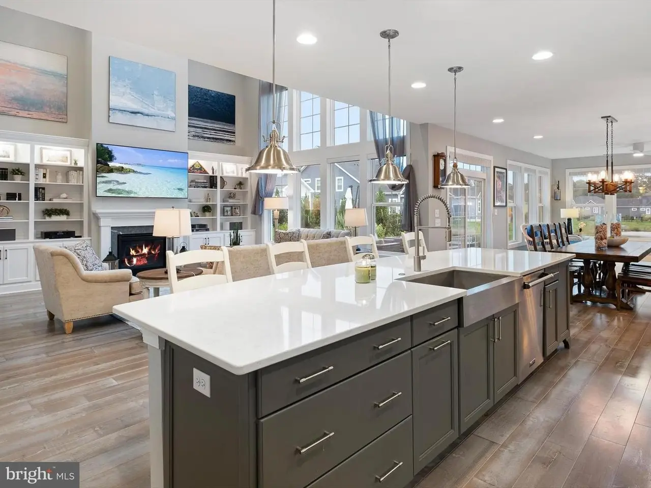 This elegant Schell Brothers Chesapeake residence showcases timeless architecture, refined details, and grand indoor-outdoor living with captivating pond views. Offering 5 bedrooms, 5 full baths, and three levels of robust living space, this home is as impressive in scale as it is in design. The finished basement immediately sets this home apart, featuring a private home gym, media room with projection screen and theater seating, rustic wine room with full-sized wine refrigerator, spacious recreation area, full bath, and even a professional salon, an extraordinary level blending leisure, style, and convenience. Curb appeal abounds with manicured landscaping, multiple roof peaks, board-and-batten shutters, a covered front porch with composite decking, and a charming pergola above the garage. At the rear of the home, extensive hardscaping creates a luxurious retreat overlooking the tranquil pond. A two-tiered paver patio highlights a dramatic wood-burning fireplace, 65-inch Enfield propane fire pit, and Lynx professional grill, with raised garden beds adding a touch of charm. Designed for both elegant entertaining and quiet evenings, this outdoor haven is truly spectacular. A transom front door with sidelights opens to an inviting foyer, where French transom doors lead to a private home office. Plantation shutters, custom blinds, and designer window treatments add sophistication throughout. The gourmet kitchen is a showpiece, anchored by an expansive quartz island and appointed with Viking appliances, a five-burner gas cooktop with range hood and pot filler, built-in oven, 42-inch display cabinetry with accent lighting, soft-close cabinets with underlighting, and a custom walk-in pantry with built-in spice storage. A deep stainless farmhouse sink with arched faucet completes the design. The adjoining dining area and sunroom with bamboo shades flow seamlessly to the grand outdoor living spaces. The great room makes a lasting impression with soaring ceilings and a dramatic two-story wall of windows showcasing serene pond views. Custom built-ins with integrated lighting flank the gas fireplace, creating an elegant focal point. The spacious main-level primary suite offers a tranquil sitting area with tray ceiling, dual walk-in closets, and a spa-inspired en suite with dual vanities, soaking tub, walk-in shower with bench, and private water closet. A second bedroom and full bath provide convenience. The laundry room doubles as a butler's pantry with Energy Star appliances, built-in cabinetry, and utility sink. The garage features epoxy flooring, built-in storage, and an additional refrigerator. Upstairs, a versatile loft serves as a hub for three spacious bedrooms. Two enjoy en suite baths, while one offers a private balcony and expansive walk-in closet. A fifth bedroom, currently styled as a sophisticated home office retreat, features custom built-ins, a crisp shiplap ceiling, and rich navy walls, creating a refined coastal vibe. The loft itself opens to a covered balcony with ceiling fans and sweeping pond views. Every element of this home reflects elegant design, timeless finishes, and spacious comfort, with refined living space and picturesque pond views as the backdrop to everyday living. Select furnishings will convey with the sale. Discover the elegance in person-schedule your private tour today!