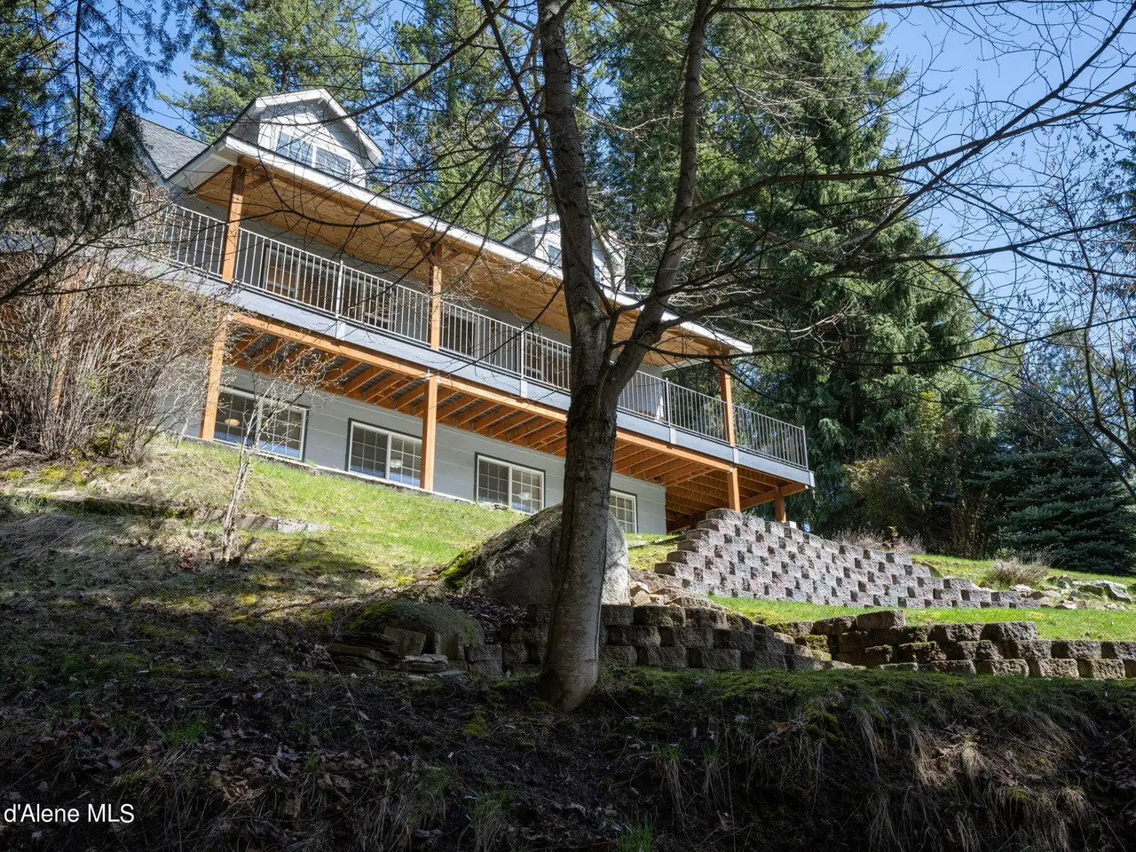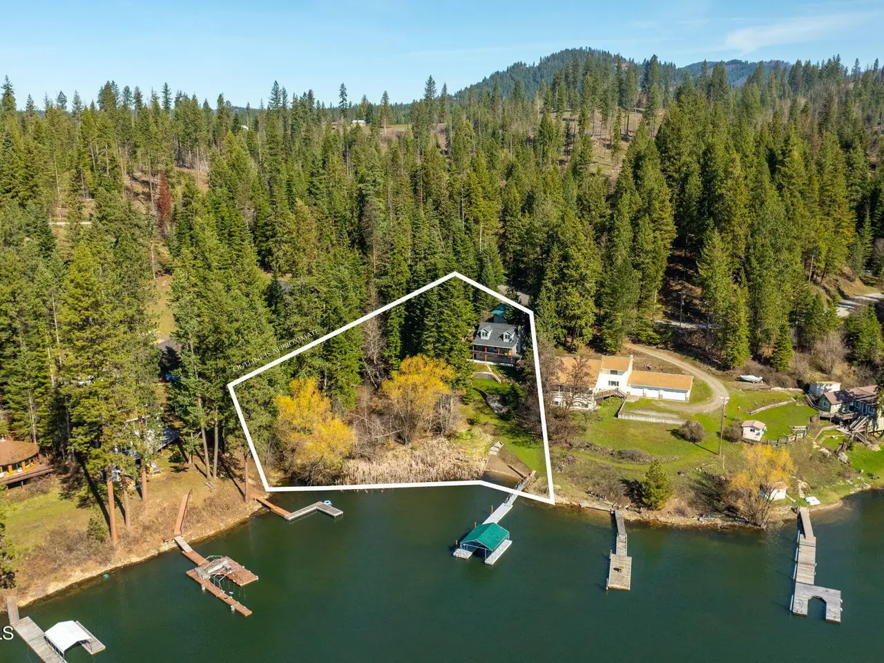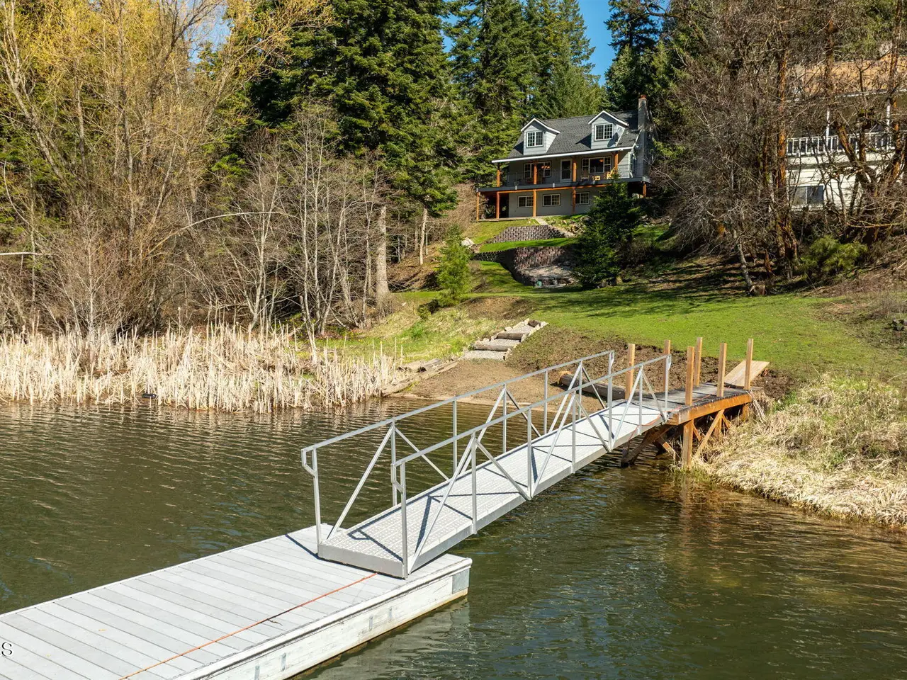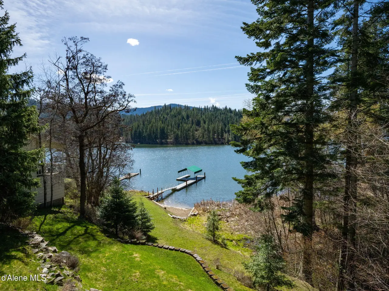 Nestled on Hayden Lake's coveted Mokins Bay, this waterfront retreat offers tranquility and recreation. Walk down to the covered dock and enjoy boating, kayaking, canoeing or fishing in the deep scenic bay that features a no wake zone. With 172 feet of waterfrontage and a sandy beach, the property spans 1.17 acres, comprising two lots, with a year-round creek running between the lots. The terraced landscaping has been thoughtfully designed to blend with the natural surroundings, creating a serene and inviting atmosphere. Originally built as a cozy lake cabin, this home has undergone a complete transformation to offer modern comforts and conveniences while retaining its rustic charm. Step inside to discover a beautifully remodeled interior, featuring updated kitchen and bathrooms, new flooring, and fresh paint throughout. With ample natural light, the home offers a warm and inviting ambiance, perfect for gatherings. Updated plumbing ensures worry-free living, allowing you to fully embrace the lakefront lifestyle. Whether you're seeking a private retreat for your family or an investment opportunity in the vacation rental market, this property offers endless possibilities. Previously, it operated as a successful vacation rental, the home comfortably accommodates 10+ guests. The detached garage provides convenient storage for all your lake toys and equipment, ensuring that you have everything you need to make the most of your time on the water. With its unbeatable combination of natural beauty, recreational amenities, and modern comforts, this Hayden Lake waterfront retreat offers a truly unparalleled living experience.