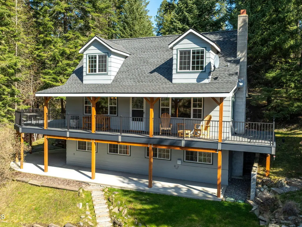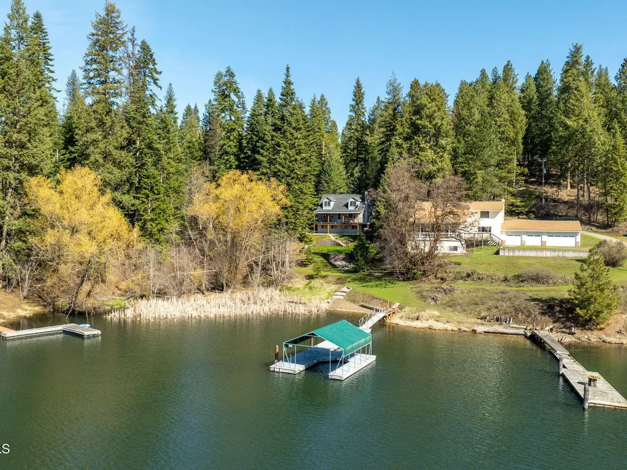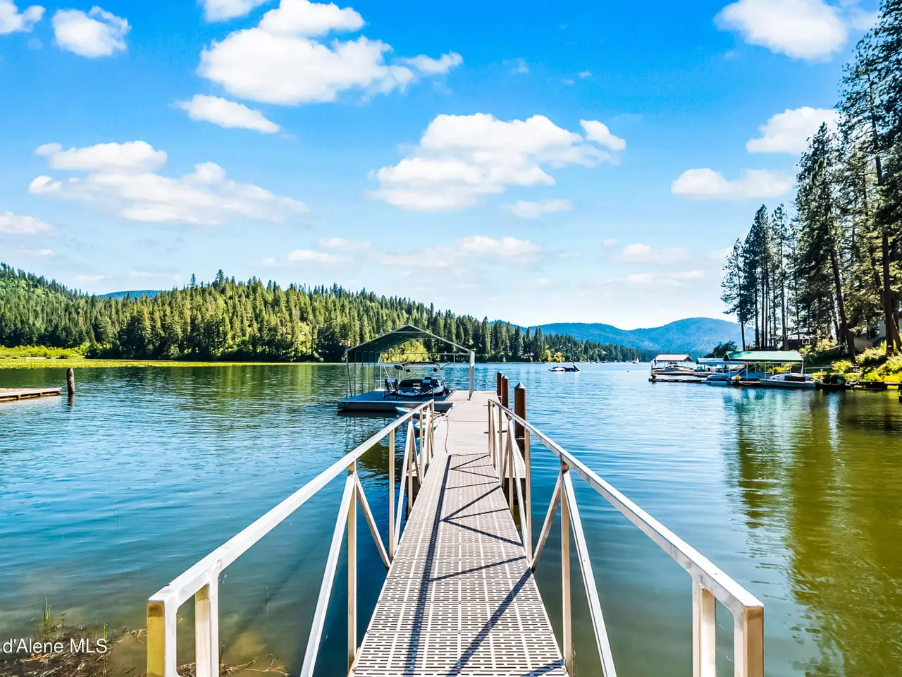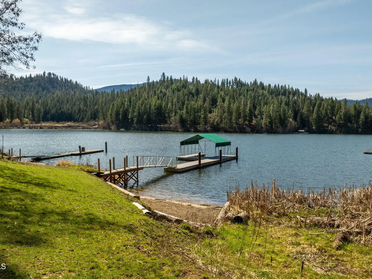 Nestled on Hayden Lake's coveted Mokins Bay, this waterfront retreat offers tranquility and recreation. Walk down to the covered dock and enjoy boating, kayaking, canoeing or fishing in the deep scenic bay that features a no wake zone. With 172 feet of waterfrontage and a sandy beach, the property spans 1.17 acres, comprising two lots, with a year-round creek running between the lots. The terraced landscaping has been thoughtfully designed to blend with the natural surroundings, creating a serene and inviting atmosphere. Originally built as a cozy lake cabin, this home has undergone a complete transformation to offer modern comforts and conveniences while retaining its rustic charm. Step inside to discover a beautifully remodeled interior, featuring updated kitchen and bathrooms, new flooring, and fresh paint throughout. With ample natural light, the home offers a warm and inviting ambiance, perfect for gatherings. Updated plumbing ensures worry-free living, allowing you to fully embrace the lakefront lifestyle. Whether you're seeking a private retreat for your family or an investment opportunity in the vacation rental market, this property offers endless possibilities. Previously, it operated as a successful vacation rental, the home comfortably accommodates 10+ guests. The detached garage provides convenient storage for all your lake toys and equipment, ensuring that you have everything you need to make the most of your time on the water. With its unbeatable combination of natural beauty, recreational amenities, and modern comforts, this Hayden Lake waterfront retreat offers a truly unparalleled living experience.