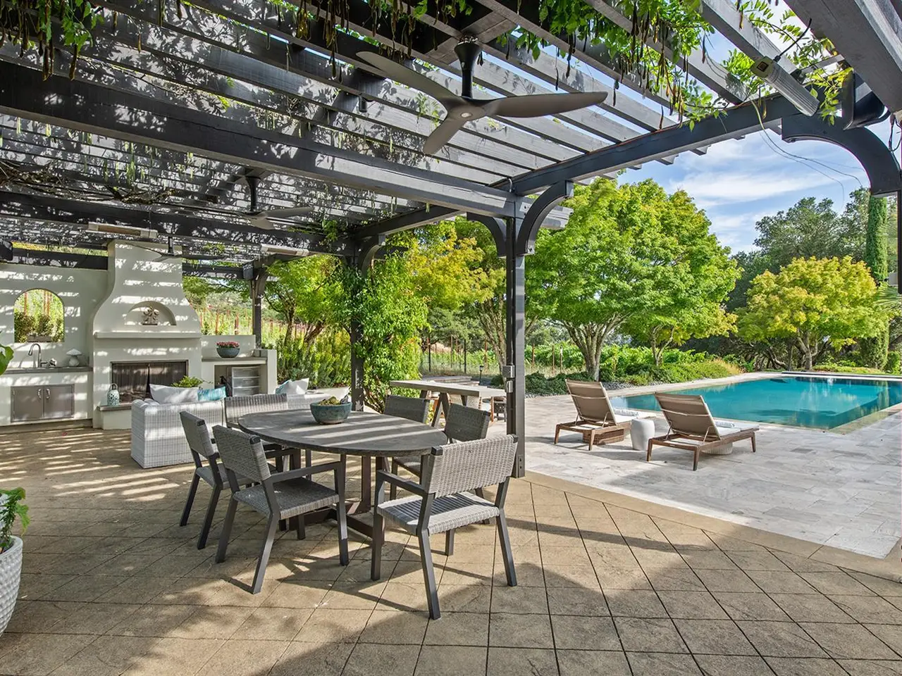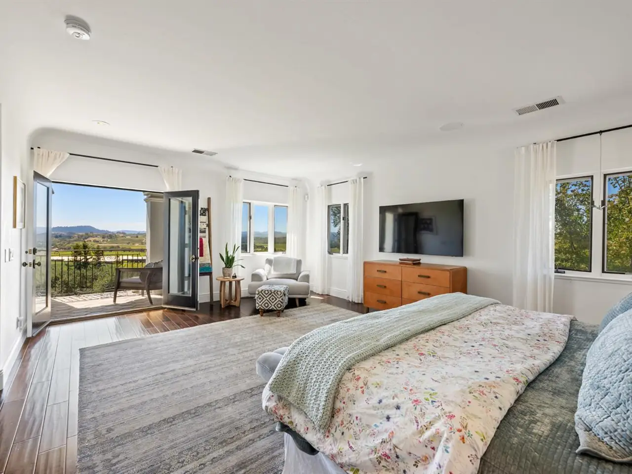 Welcome to 4395 Pine Flat Road, an elegant Healdsburg estate offering some of the most breathtaking views in Sonoma County. Just minutes from downtown yet worlds away, this extraordinary property blends luxury, comfort, and resort-style amenities on 10-plus mostly usable acres. The main residence consists of a four-bedroom, five-bathroom home is designed for both entertaining and everyday living. High ceilings, rich wood floors, and expansive windows frame vineyard and mountain vistas at every turn. Highlights include a Chef's kitchen with bar seating and seamless flow to the outdoor dining pavilion, formal dining room and multiple living spaces including a family room, library/office, gym, and wine cellar, main-level suite perfect for guests or multi-generational living, upstairs primary suite with private balcony, sitting area, and generous storage. A spacious detached studio offers flexible use for guests or extended family. Its outdoor entertainment area, complete with fireplace, is ideal for gatherings under the stars. This estate was made for relaxation and play, featuring a sparkling pool and hot tub, tennis court and bocce court, outdoor kitchen and vineyard-view dining, orchard, rose gardens, and raised garden beds, serene spots for birdwatching or simply doing nothing at all.