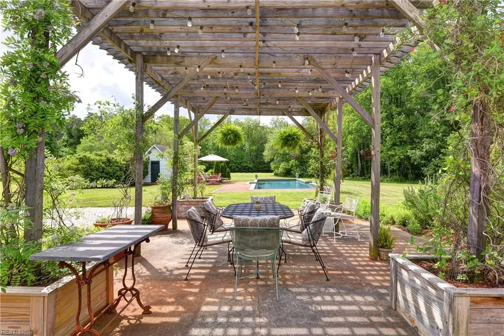 Outdoor dining beneath graceful pergola