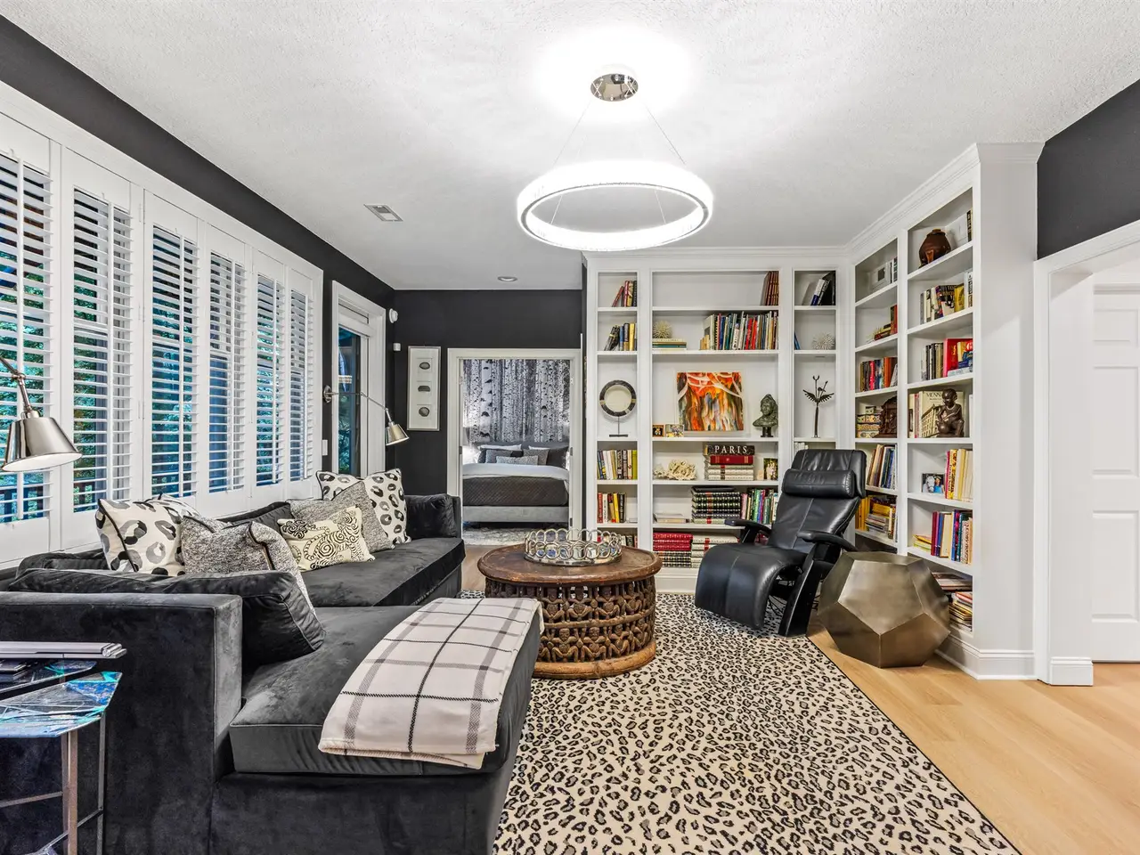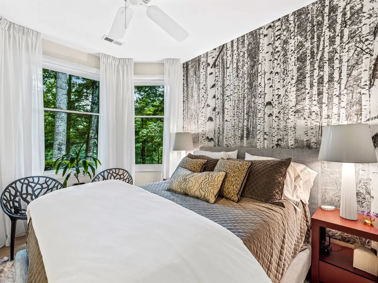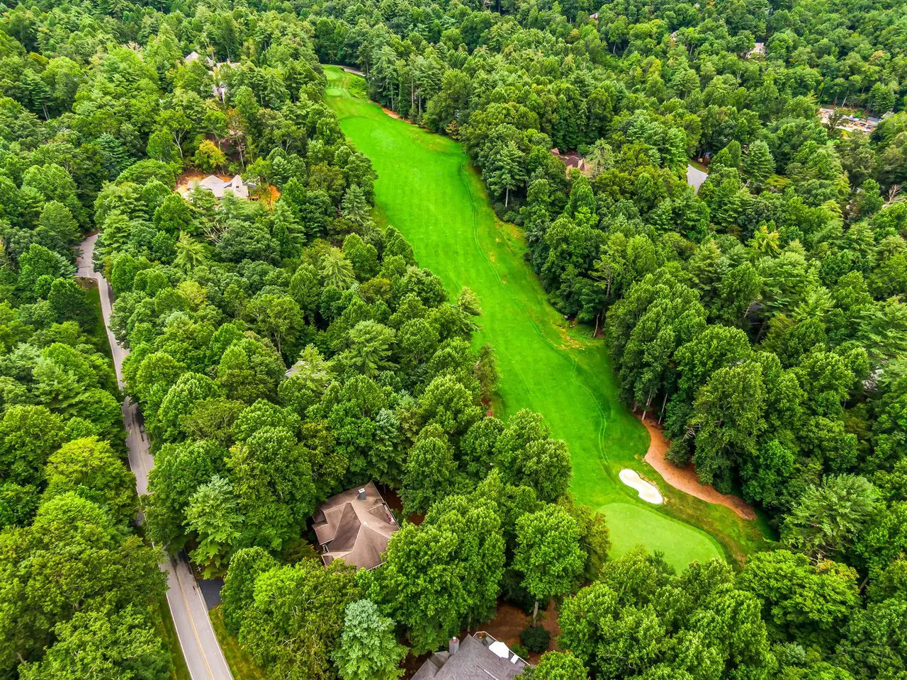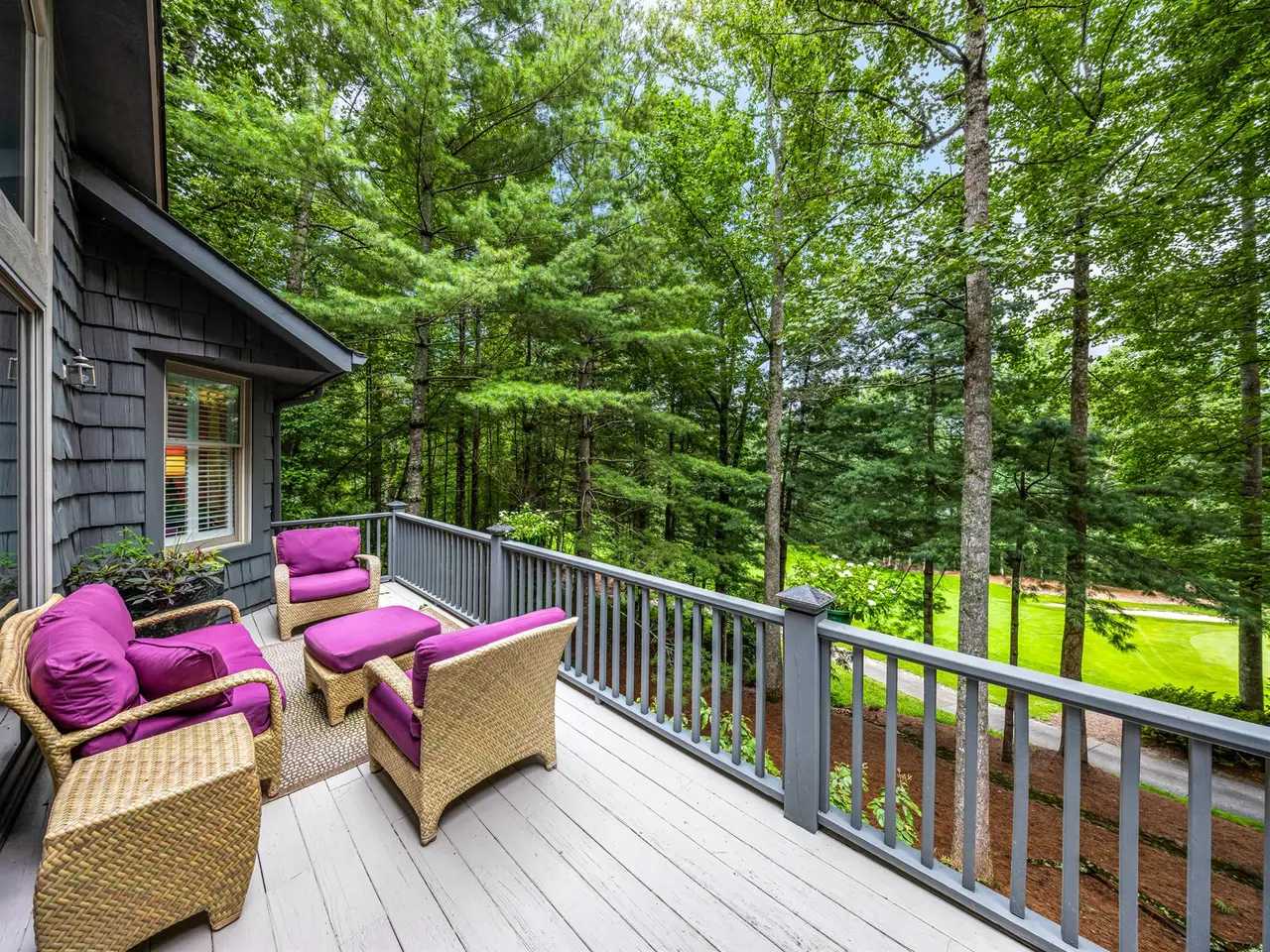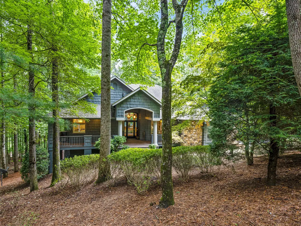 Nestled in Champion Hills above the 12th green, this artist's mountain retreat home pairs modern luxury with an eclectic, world-travel flair. Thoughtful updates and attention to detail bring comfort and style together. From the Samsung Frame TV on a hydraulic TV lift that preserves the aesthetic of the fireplace wall, Brazilian Quartzite countertops in the chef's eat-in kitchen to all the wood floors. The main level's soaring great room and primary suite offer ease of one-level living, while the terrace level is designed for both fun and function with a family room, office, guest suites, and a wet bar. Multiple porches and decks encourage life outdoors - morning coffee on the screened porch, evening wine on the open deck, or quiet afternoons on the covered terrace. Plush yet practical, with golf cart storage, workshop, and abundant space, this home invites you to live serenely in the Blue Ridge Mountains while only minutes from downtown Hendersonville.
