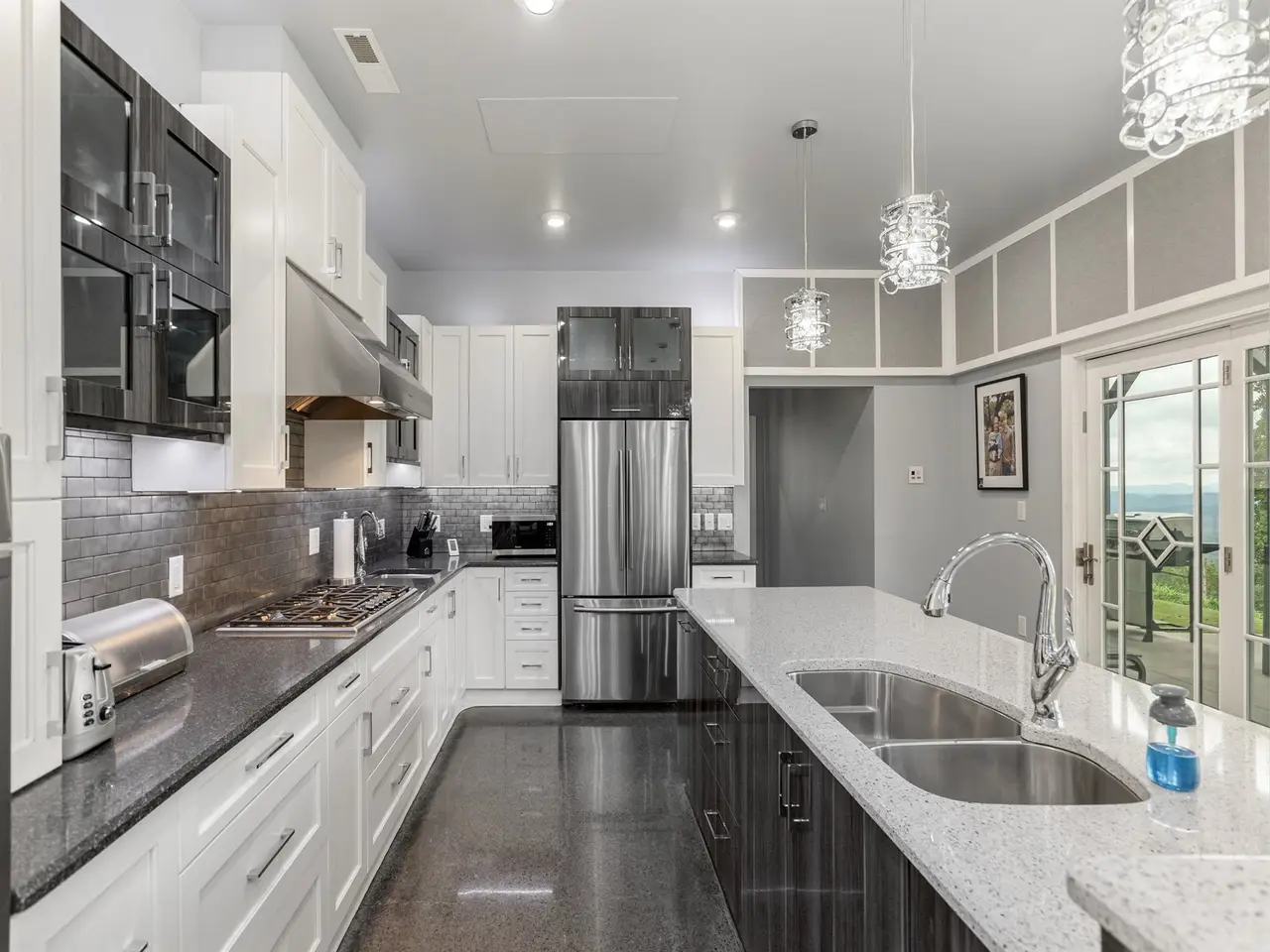 Captivating Luxury with a Unique Floor Plan! Step into a world of elegance and innovation with this stunning mountain property. The primary living spaces are thoughtfully situated on the lower level, merging style and functionality for an exceptional living experience. This home boasts energy-efficient hot water radiant heat set in sleek concrete floors, and with its southern exposure, natural light fills every room, enhancing comfort throughout the seasons. The heart of the home is the open kitchen with its spacious island, premium gas Thermador cooktop, and stylish metal tile subway backsplash. The luxurious primary suite features a dramatic hall of closets, a spa-inspired bath with tile step-in shower, a dedicated alcove for a hot tub or freestanding tub, and a two-sink vanity for ultimate convenience. Additional spaces include a guest bedroom and second full bath, an adjoining workshop for creativity, a bedroom with en-suite bath on the upper level, a large fitness room, and a bonus room ideal for hobbies or a personalized workspace. A separate outbuilding with overhead door provides endless possibilities, from vehicle storage to crafts. Outdoors, breathtaking long-range mountain views capture both sunrise and sunset, offering beauty from dawn to dusk. This extraordinary property is a harmonious blend of luxury, efficiency, and inspired design!