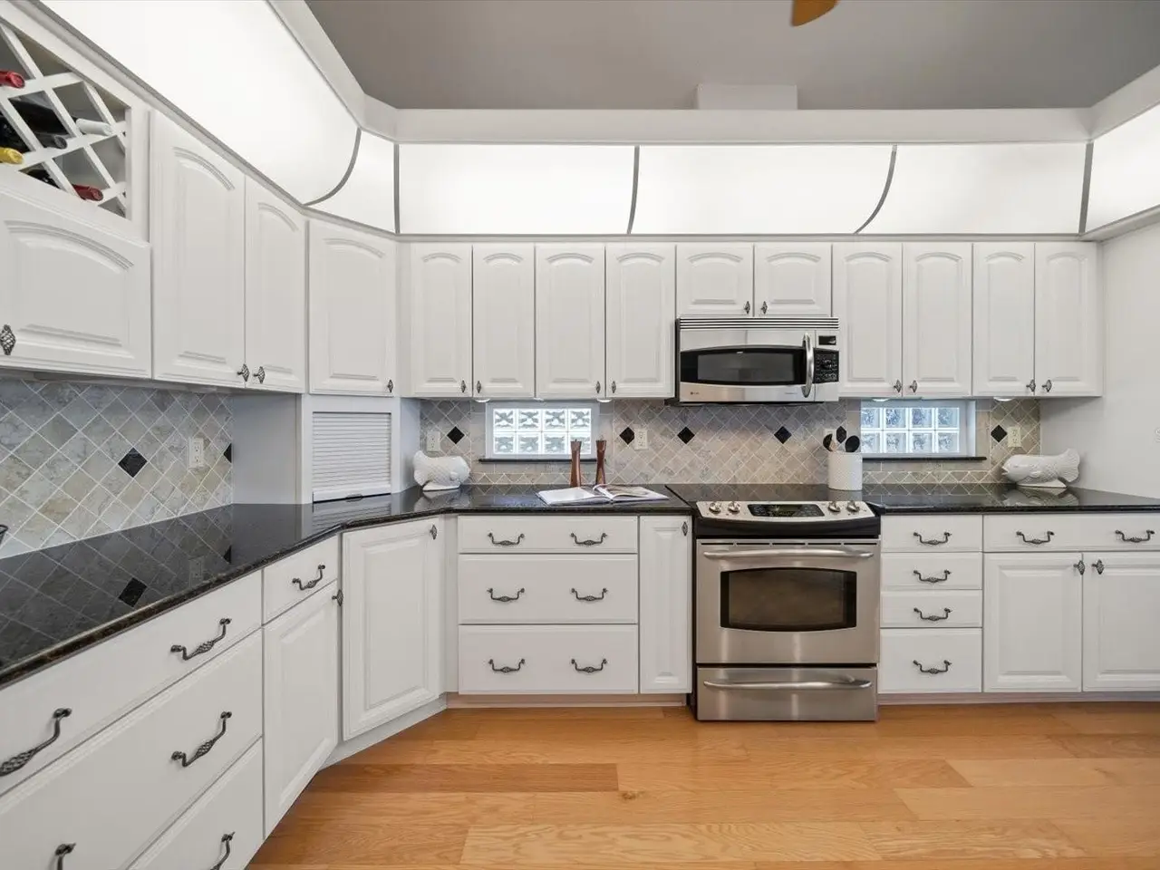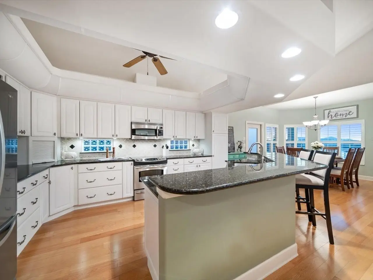 Open-concept kitchen with custom cabinetry and stainless steel appliances