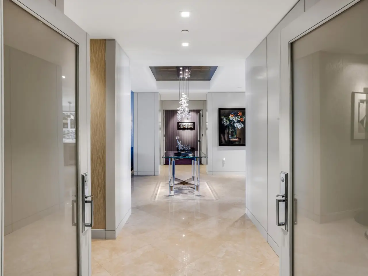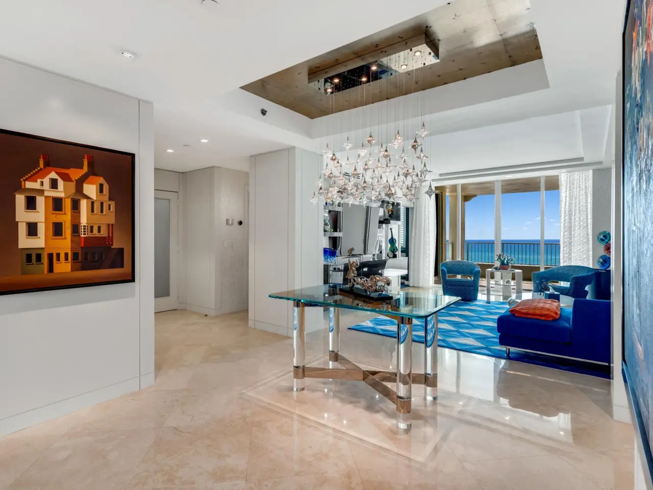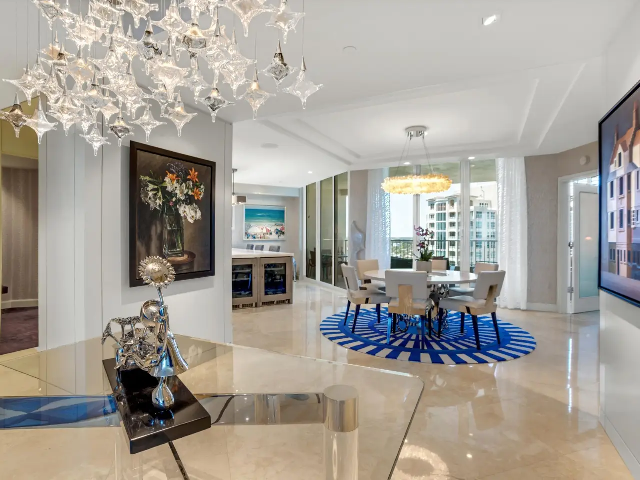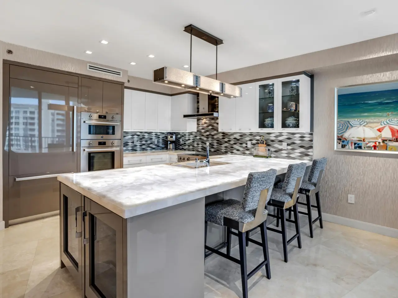STUNNING 3 BEDROOM 3 BATHROOM AREZZO MODEL WITH COVETED GARAGE PARKING FOR 2 CARS AND AWE-INSPIRING VIEWS! FULLY REMODELED AND READY FOR IMMEDIATE ENJOYMENT! ELEVATOR ENTERS INTO A PRIVATE FOYER WITH DOUBLE GLASS-FRAMED DOORS. GORGEOUS SHADOW-REVEAL MILLWORK, LARGE-FORMAT MARBLE FLOORING, DOUBLE TRAY CEILINGS AND DESIGNER-CURATED WALL COVERINGS. CUSTOM-DESIGNED LIVING ROOM OPENS TO PANORAMIC OCEAN VIEWS, WHILE THE DINING ROOM FLOWS SEAMLESSLY TO AN INTRACOASTAL-VIEW BALCONY. GOURMET KITCHEN WITH CUSTOM CABINETRY, UNDER-LIT QUARTZ COUNTERTOPS, TOP-TIER APPLIANCES INCLUDING WINE AND BEVERAGE REFRIGERATION, AND A SPACIOUS PANTRY. THE SPLIT BEDROOM LAYOUT ENSURES THAT EACH ROOM IS SEPARATELY PLACED FOR OPTIMAL PRIVACY. LUXE PRIMARY SUITE WITH DUAL CLOSETS AND A SPA-LIKE PRIMARY BATH.