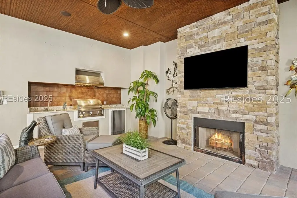 Exceptional custom home in Broad Pointe at Indigo Run offering an unparalleled indoor-outdoor living experience. Designed with a thoughtful layout, open floorplan and higher ceilings throughout, this nearly new home has been sparingly used as a second residence and is in pristine, move-in-ready condition. The heart of the home is the gourmet kitchen featuring a 6-burner gas cooktop, large island with seating, stainless farm and prep sinks, separate beverage fridge, plus a charming breakfast nook and butlers pantry with built-in cabinetry, wine cooler, and additional beverage fridge. The Great Room boasts a coffered, wood-inlay ceiling and striking stacked stone fireplace, and is open to the kitchen and dining room, creating a warm and inviting space for everyday living and entertaining. A first-floor guest bedroom with adjoining full bath offers direct access to the lanai and pool area. Additional functional spaces on the main level include a drop zone with built-in cubbies, 2-car garage, and outdoor shower. The screened lanai is enhanced by architectural walls with pavers surrounding a gorgeous pool, separate saltwater hot tub, and covered outdoor living area complete with a stacked stone fireplace, built-in grill, sink, beverage fridge, bar and dining area - perfect for entertaining or relaxing in privacy. Upstairs, the spacious primary suite includes a large walk-in closet and a luxurious bath with oversized shower featuring multiple shower heads. Two additional guest bedrooms (one with an ensuite bath) also offer walk-in closets. A large bonus room features custom built-in sleeping areas and storage drawers. The second floor also offers a full-size laundry room with sink and ample storage. Located on a private 0.7-acre cul-de-sac lot, this home provides purposeful privacy and the feel of an exclusive resort. Broad Pointe residents enjoy access to a private community pool, dock, and kayak storage, with optional membership to The Golf Club at Indigo Run or social membership. This à la carte-style membership has made this last and final development on Hilton Head one of the most sought-after communities on the Island. Just 7 minutes to shopping, dining, and Hilton Heads town-owned beach parks, this home perfectly balances luxury, convenience, and lifestyle.