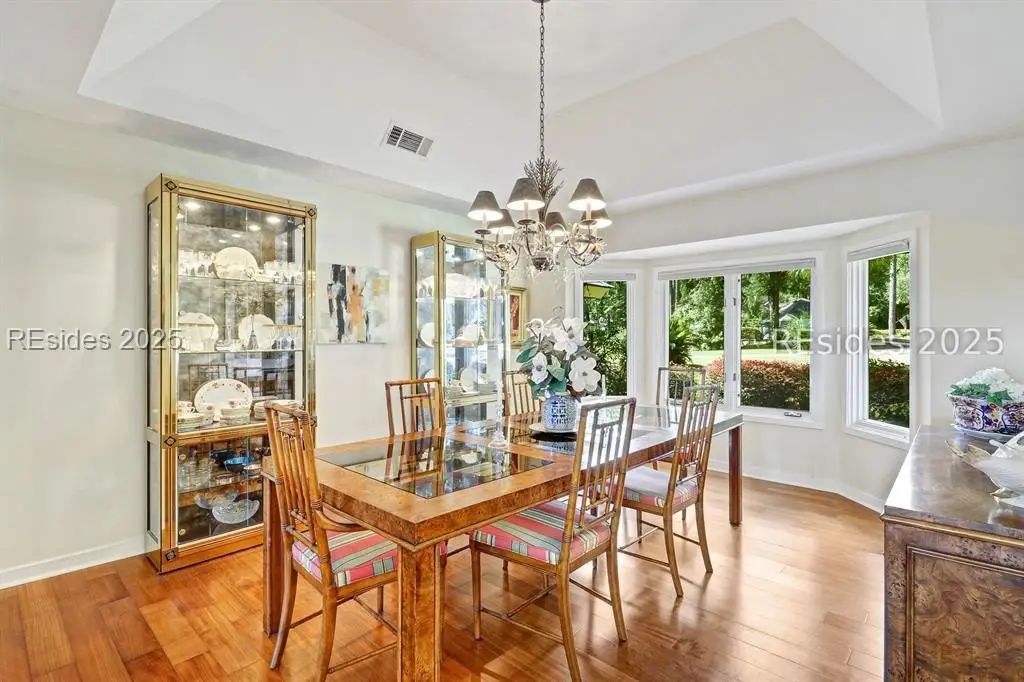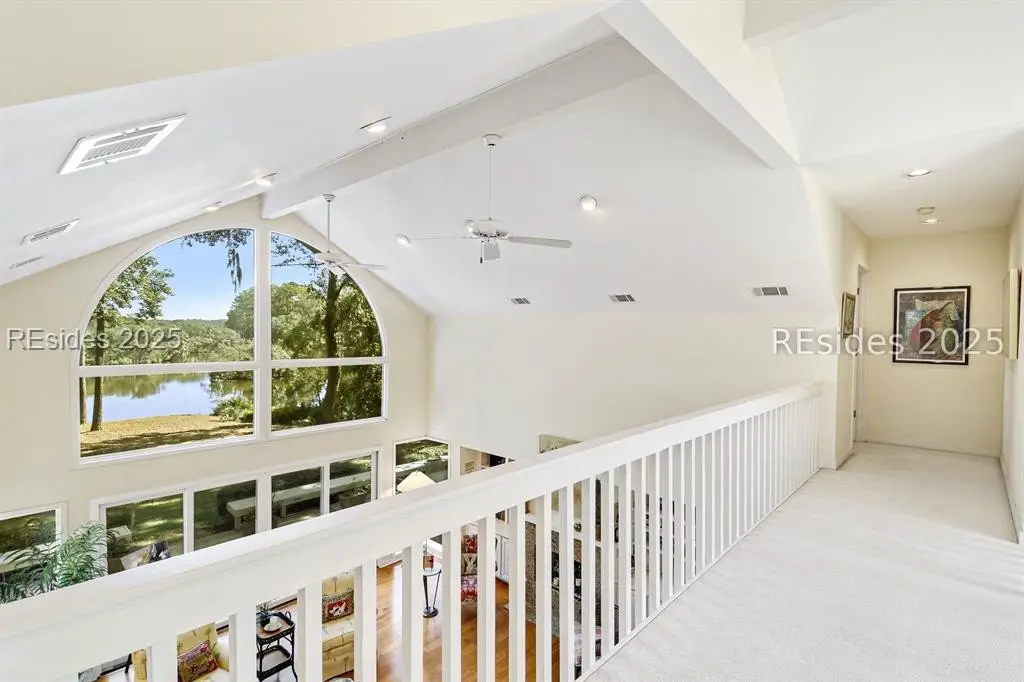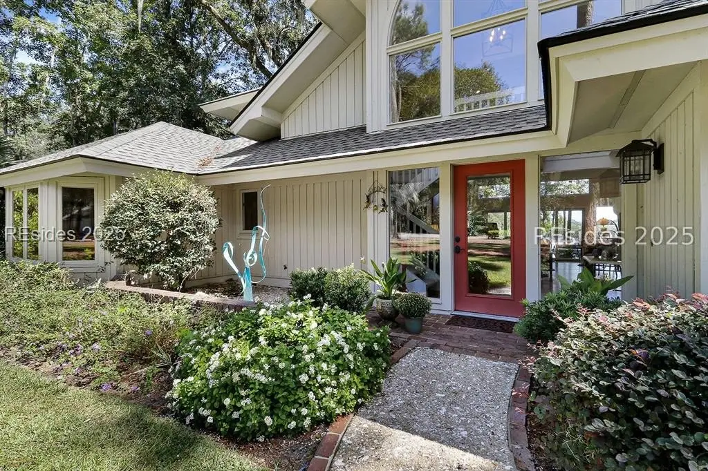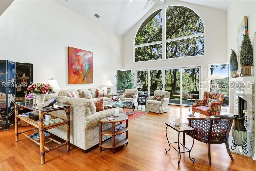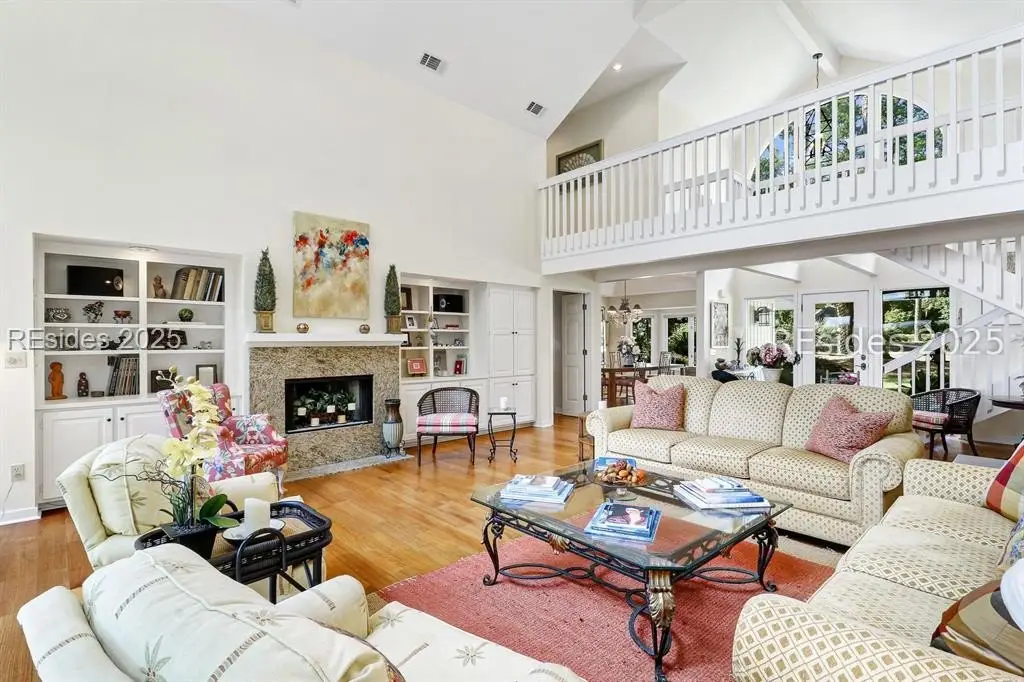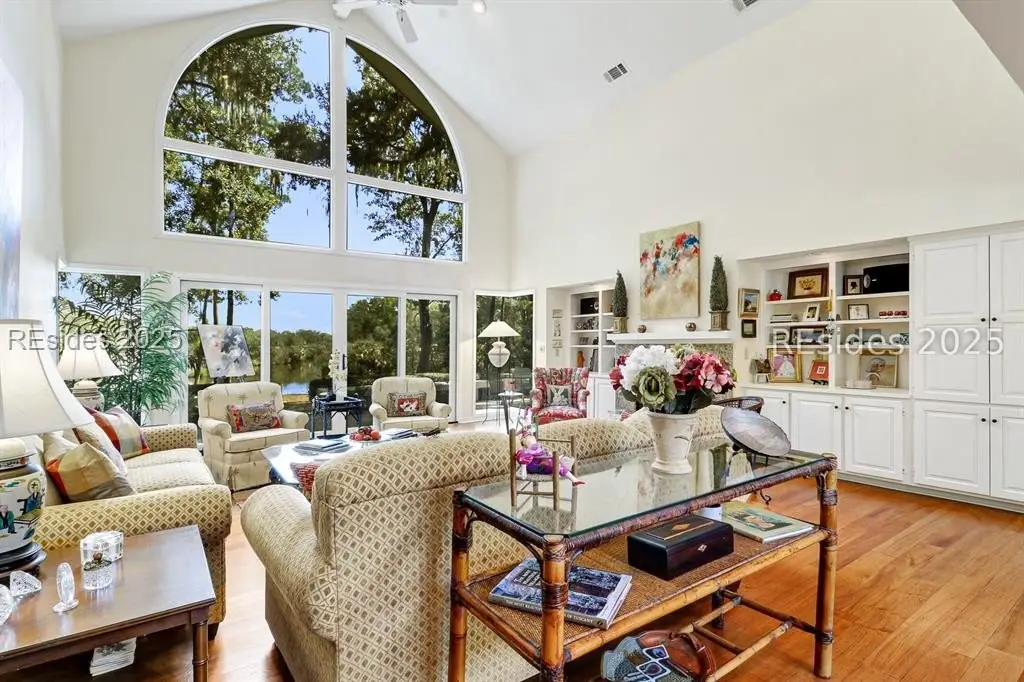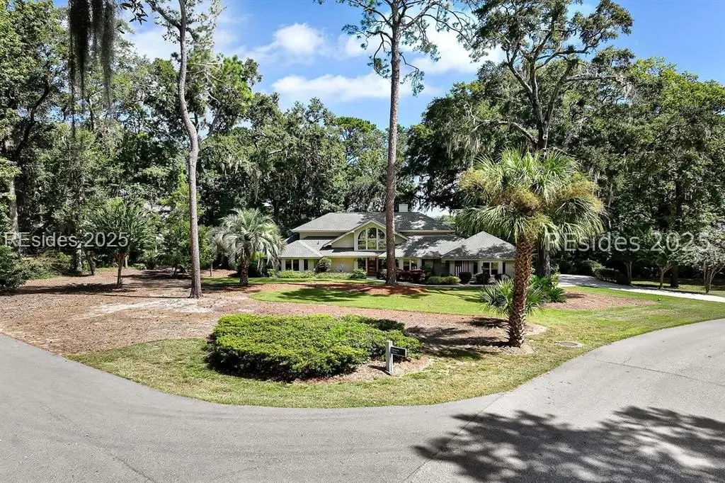 Rare opportunity to experience daily breathtaking panoramic views across much desired Blue Heron Sanctuary in amenity rich, private Moss Creek! Interior features in this impeccably maintained residence include soaring, vaulted/tray ceilings, floor to ceiling walls of windows to view, teak wood flooring, custom cabinetry/ built-ins/millwork, fireplace, granite & solid surface counters & designer fixtures/hardware/lighting. Very livable floor plan boasts impressive Great Rm, Island Kitchen open to Casual Dining & Carolina Rm, Dining Rm, Laundry, Powder Rm, excellent BR separation, Den/Study adjacent well-appointed primary BR suite w/updated Bath, 2 ample guest BR suites & open staircase to 2nd floor Gallery with stunning views. Exterior offers oversize, high elevation, cul de sac corner lot with nature preserve in front, golf view to side (#7 North Course), maximum privacy, rear patio (with built-in seating) spanning almost entire rear of home, side load 2 car garage, majestic live oaks, new roof, mature lawn/plantings & large back yard gently sloping to waters edge and arguably the finest lake view on this highly sought, birders paradise, nature preserve. All with excellent curb appeal, super quiet locale, and prime eastern exposure in rear offering stunning sunrises across lake to rookery, boardwalk/tidal marsh, and shaded late afternoons/evenings for relaxing & entertaining friends. It will be love at first sight...