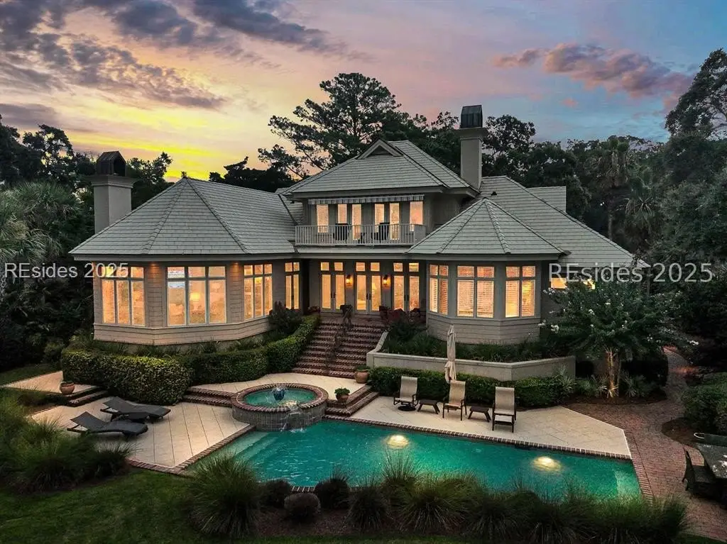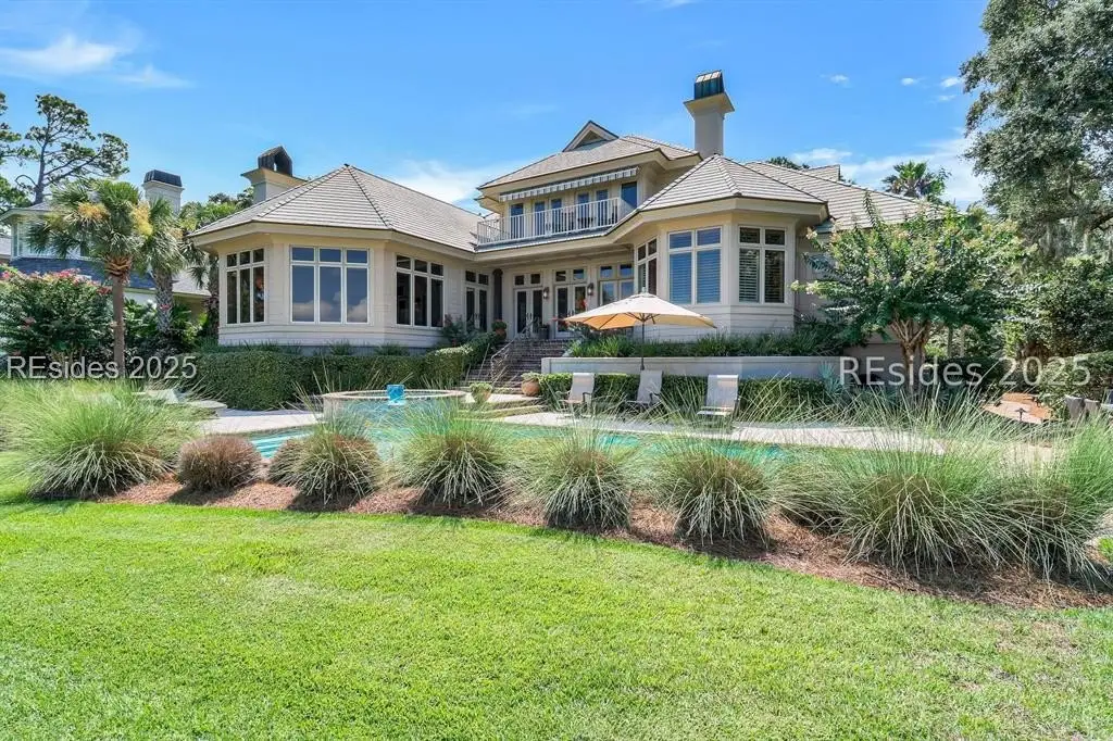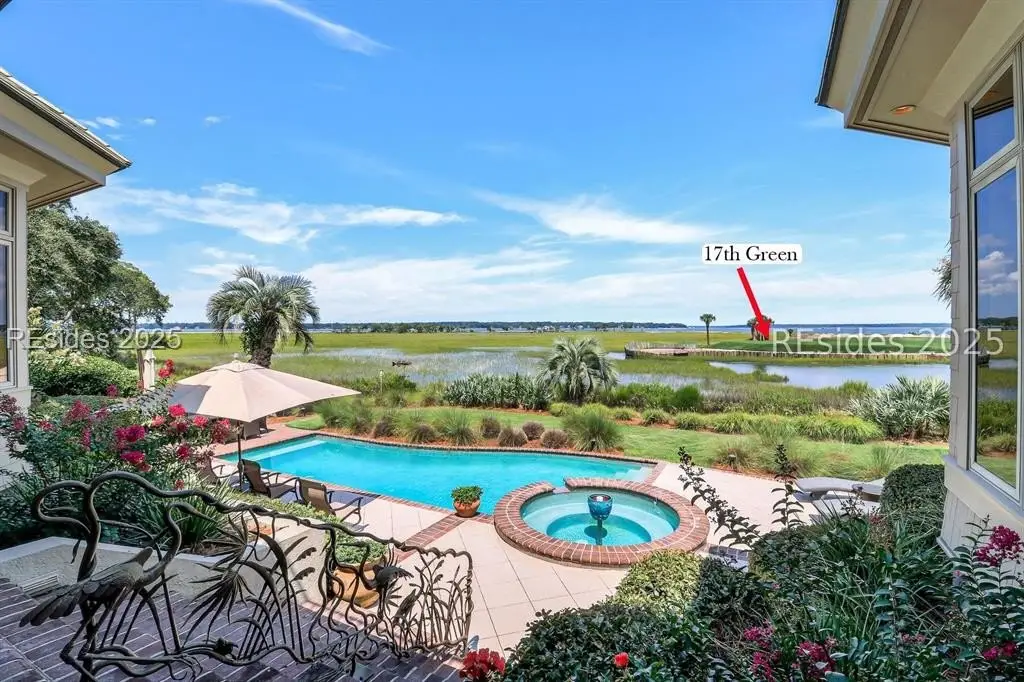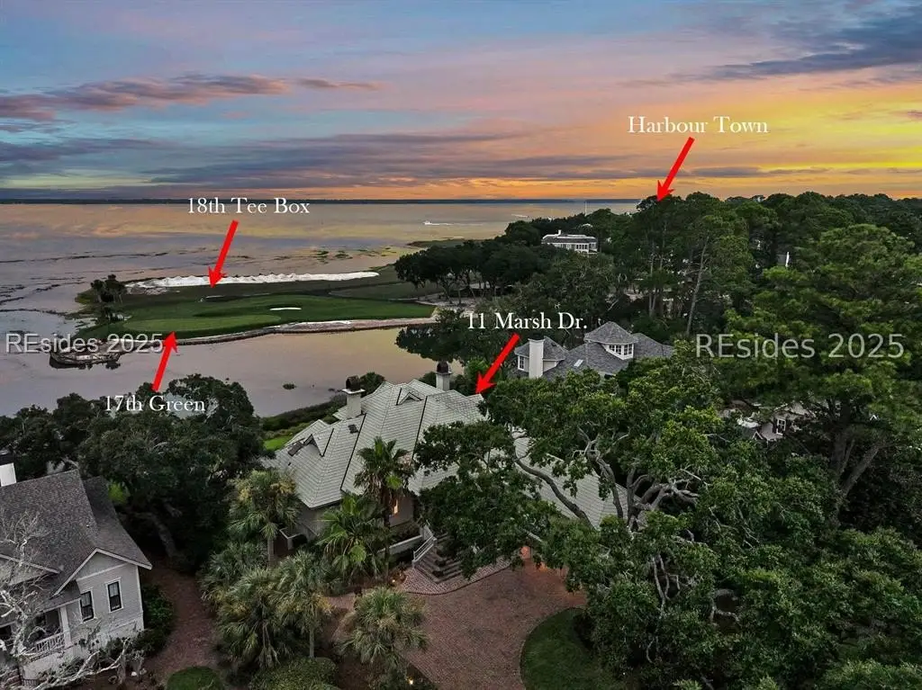 Discover luxury, views, and timeless Sea Pines living in this one of a kind residence built by award winning builder, Dan Lawrence and designed by well-known local architect Jakie Lee. This property offers a rare combination of Lowcountry charm, impeccable quality, and panoramic marsh-to-golf to sound views overlooking the iconic 17th hole of Harbour Town Golf Links home of the elevated PGA RBC Heritage. The interior features of this home are captivating with the extensive trim work, antique heart of pine flooring, custom iron work, and faux finishes by local artisans. Enjoy elegant living and dining spaces. Other features include designer lighting, dream kitchen/family room, impressive first floor owner suite, and spacious guest suites. Outdoor living is unmatched with a heated/chilled pool and spa, covered patio, and lush landscaping-perfect for enjoying the everchanging sunsets while watching golfers, nature, and boating right out your back door. A truly unforgettable Low Country property!
