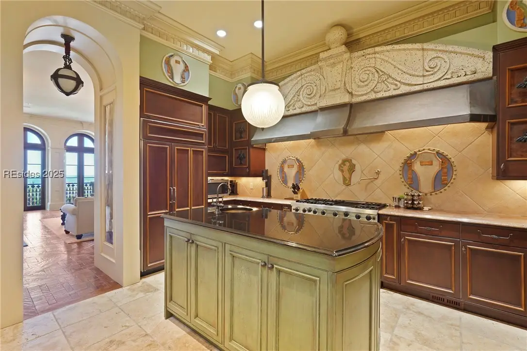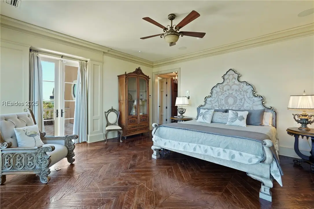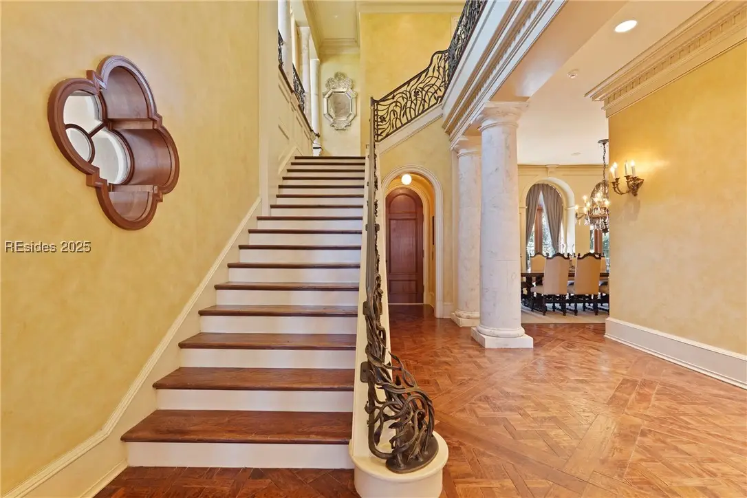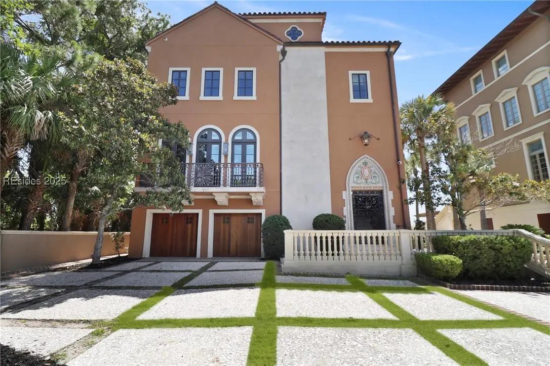 Cross your private bridge onto what feels like a private island and wake to direct Atlantic views at this exquisite 4-bed, 5.5-bath Mediterranean estate in the exclusive gated community of Stella Del Mare. Crafted with exceptional materials, hand-laid walnut floors, carved travertine, silk wall coverings, and wrought iron details, features include a private pool, spa, courtyard, elevator, multiple balconies overlooking the ocean, and a resort-style ambiance throughout. Constructed using a Hebel Block system, this home was built to last for generations. The exterior stucco was completely refinished in 2024, along with the replacement of many exterior windows, just a couple of recent major upgrades completed on this home. No home on Hilton Head Island can compare to the level of detail and thought put into the construction of this masterpiece. Act now on this rare offering blending sophistication with premier beachfront living.