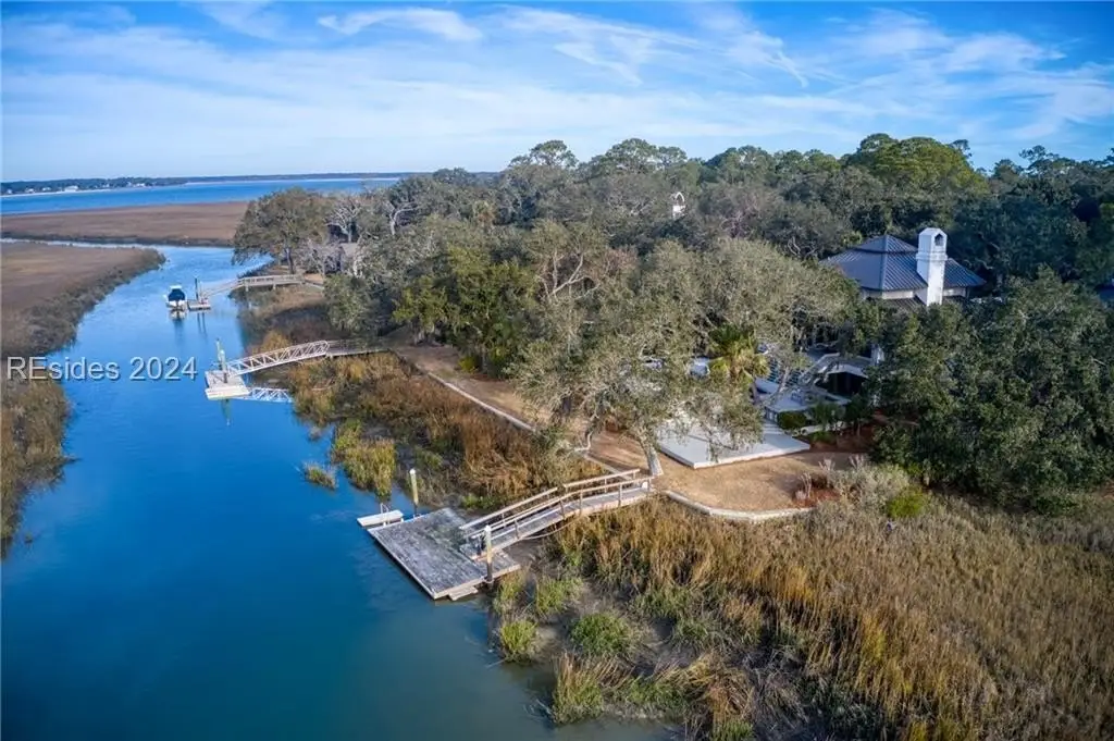 This one-of-a-kind property is privately sited on an almost acre lot with panoramic marsh and water views providing the perfect backdrop for spectacular sunsets. Kermit Huggins, a renowned architect, designed this property with 2 structures that harmoniously co-exist with their natural surroundings. Special features include a new metal roof, hardwood flooring, pella windows/doors, renovated kitchen, and interior paint. The main house boasts a luxurious upper-level owner's suite, and the guest house has 2 en-suite bedrooms plus a kitchenette. Incredible outdoor living with a heated/cooled saltwater pool, expansive deck, and private dock. Waterfront Perfection!