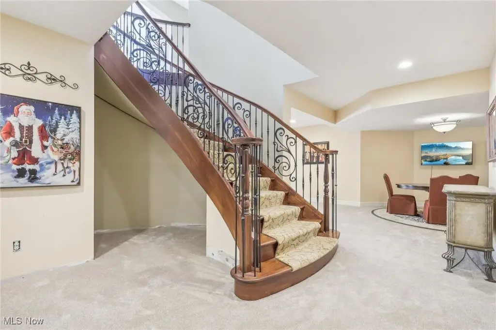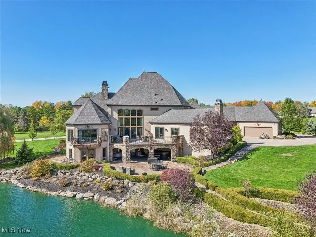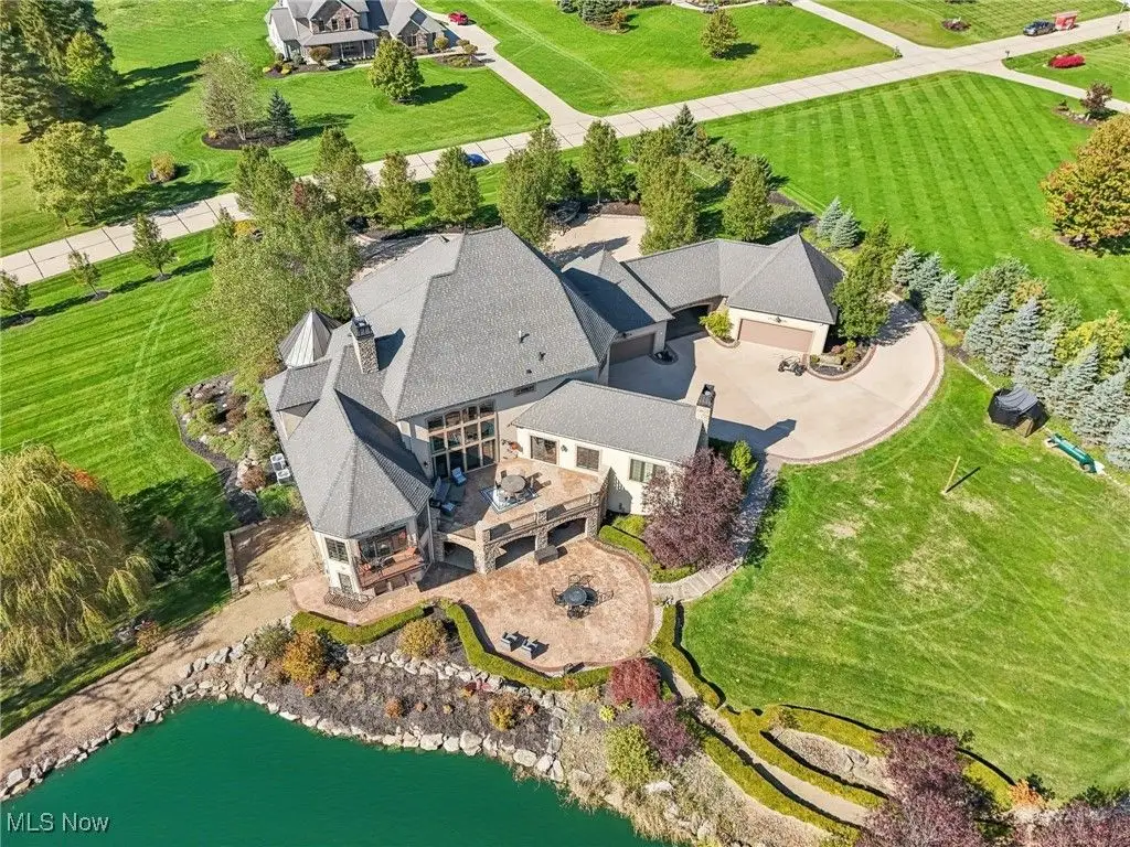 Nestled within a serene landscape, this custom-built home exudes elegance through meticulous craftsmanship & exquisite details. Upon entering you're greeted by a tremendous sweeping staircase, intricately designed woodwork, trim & molding that reflect the highest standards of artistry, spanning an impressive 7900+ sq.ft. Large pond is a picturesque centerpiece, highlighted by a soaring fountain, meandering walking path, sandy beach & charming she shed. These features transform the outdoors into a tranquil oasis. providing integration of indoor & outdoor living, dining & entertaining. Kitchen is chef's paradise, with two-tiered island, breakfast bar, high end appliances, & custom cabinetry blending functionality with style. Inviting hearth room w/ beamed ceiling & cozy wood burning fireplace all opening out to expansive terrace overlooking resort like grounds. Walk through pantry w/ ample storage & prep space lead to formal dining room w/ built in cabinets, buffet & French doors that open to outdoor courtyard for restaurant like dining. 2 story great room boasts stunning wall of windows framing breathtaking views allowing natural light to flood the space. Impressive fish tank serves as 2 sided centerpiece showcasing tropical & rare fish as serene focal point. Stunning library with decorative cathedral ceiling, rich wood built ins, & secret door to expansive primary bedroom w/ sitting area with terrace overlooking the pond. Spa-like bath, w/ walk-in shower, jetted tub & double vanities for ultimate relaxation. Convenient laundry on 2 levels. Upstairs you'll find 4 nicely sized bedrooms, 2 boast en suite baths & 2 share Jack n Jill, all with walk-in closets, ample storage & privacy. Walkout lower level is luxurious retreat featuring fully equipped bar with pizza oven, spacious theatre room, sizable workout room, 2nd office, full bath, billiards & rec area walking out to serene patio w/hot tub creating a peaceful escape. This luxurious home is truly one of a kind.