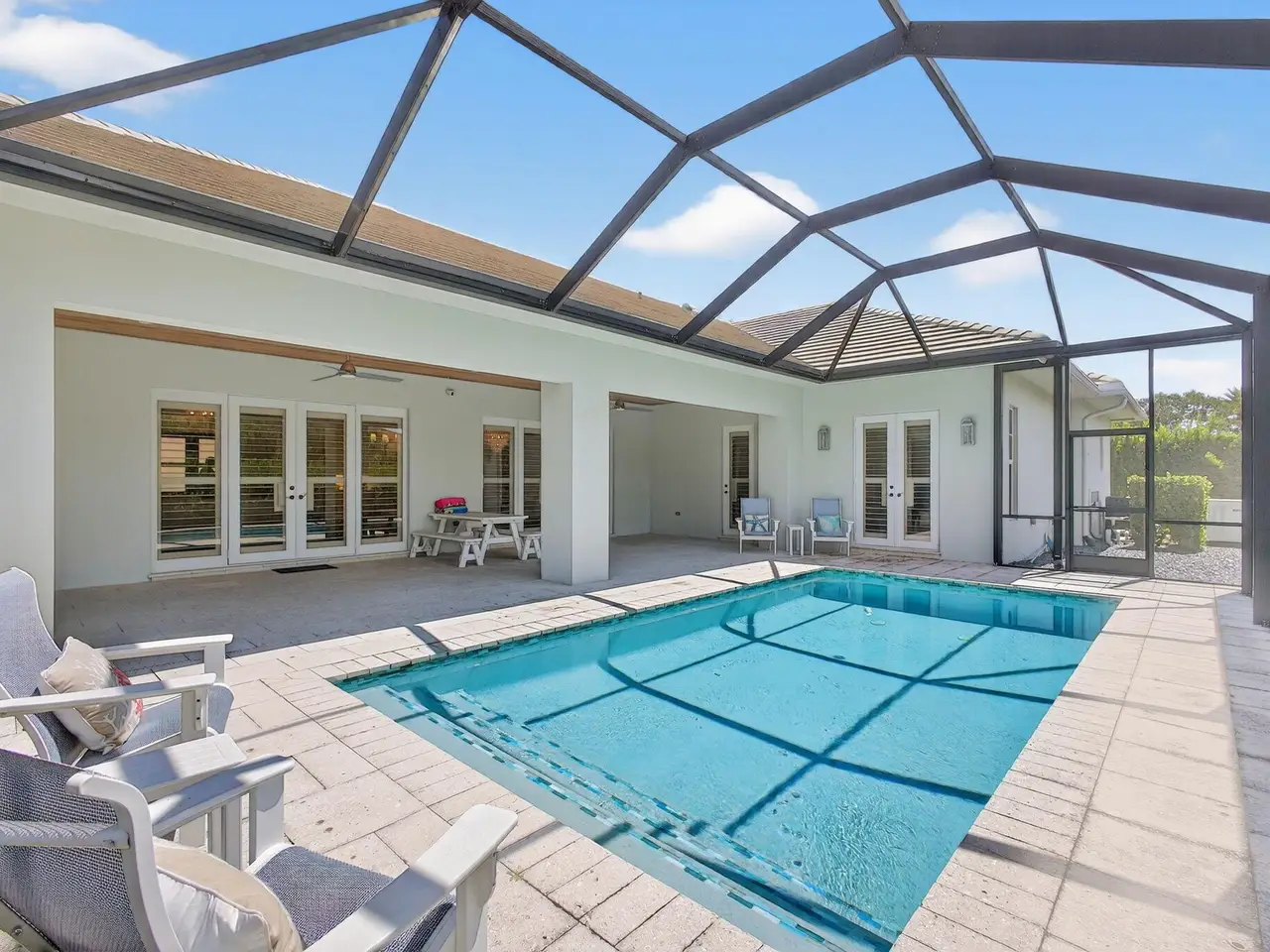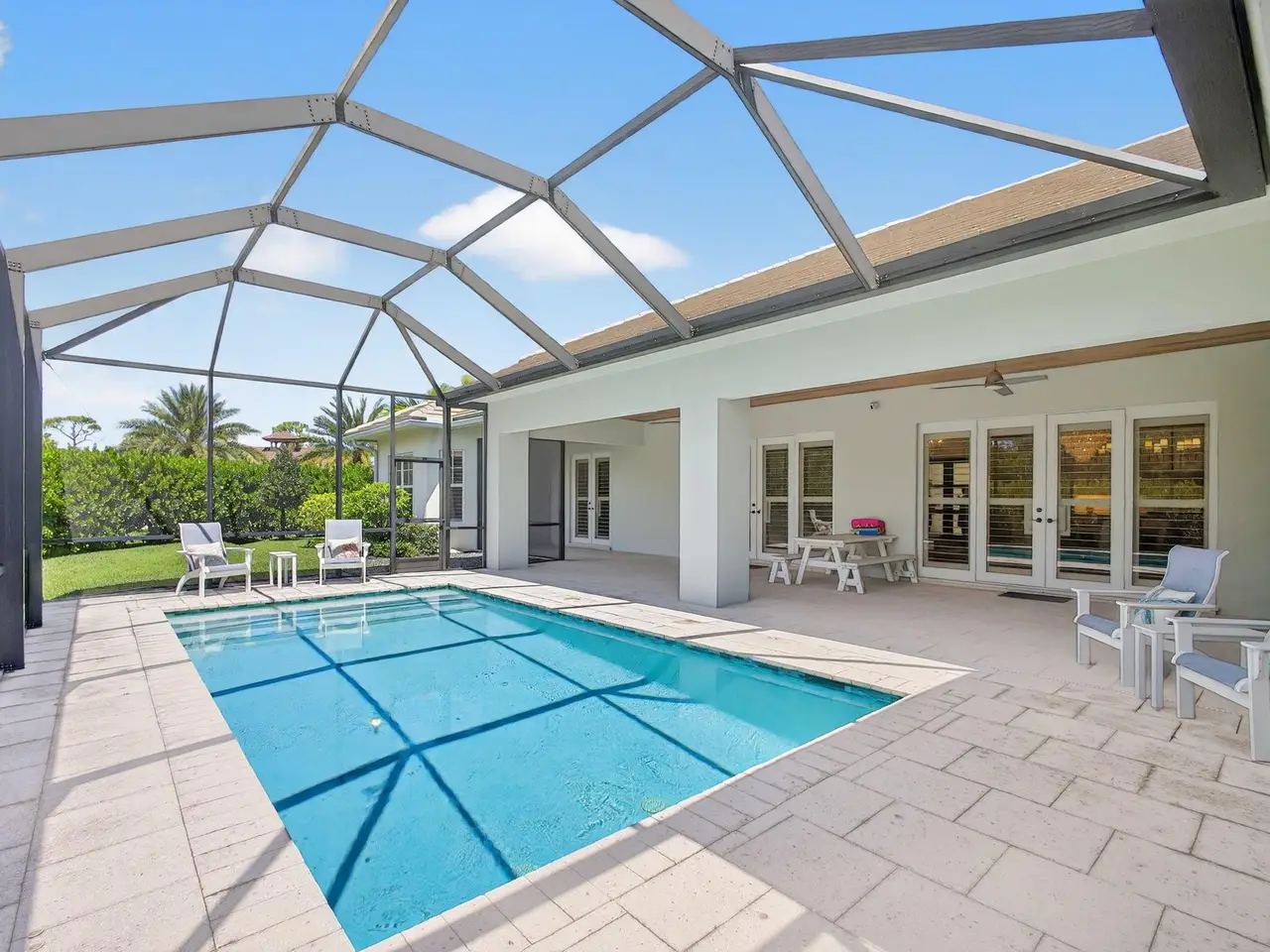 Stunning One-Story Modern Residence In Hobe Sound Golf Club! Built In 2020, This Impressive 5 BR, 5 BA Home w/3 Car Garage, Corner Lot on .43 acres Features An Open-Concept Split Floor Plan Designed For Both Comfort & Entertaining w/Generator, All Impact Windows & Doors, Porcelain Tile Floors & Plantation Shutters Throughout. The Light-Filled Living Spaces Flow Seamlessly to the Gourmet Kitchen & Spacious Great Room, Showcasing Contemporary Finishes, Great Rm has Tray Ceiling w/Tongue & Groove Shiplap. Chef's Kitchen is Appointed w/Oversized Island, Quartz Countertops, Walk-In Pantry, Thermador Appliances, & Gas Range. The Luxurious Primary Suite Opens to Lanai & Pool Area & Includes Spa-Inspired Bath w/Soaking Tub, Frameless Glass Walk-In Shower, Custom Walk-In Closet w/Built-Ins, 4..... Oversized Guest Bedrooms Provide Comfort & Privacy, While Large Laundry Room Features Sink, Counters & Extensive Storage Cabinets. The Generator Adds to The Home's Quality & Peace Of Mind. Step Outside to A Screened-In Lanai Overlooking the Heated Saltwater Pool & Expansive Corner Lot Perfect For Enjoying Florida Living At its Finest. Ample Storage Complete This Exceptional Home In The Serene And Secure Hobe Sound Golf Club Community.