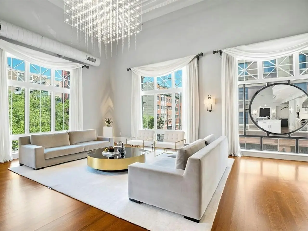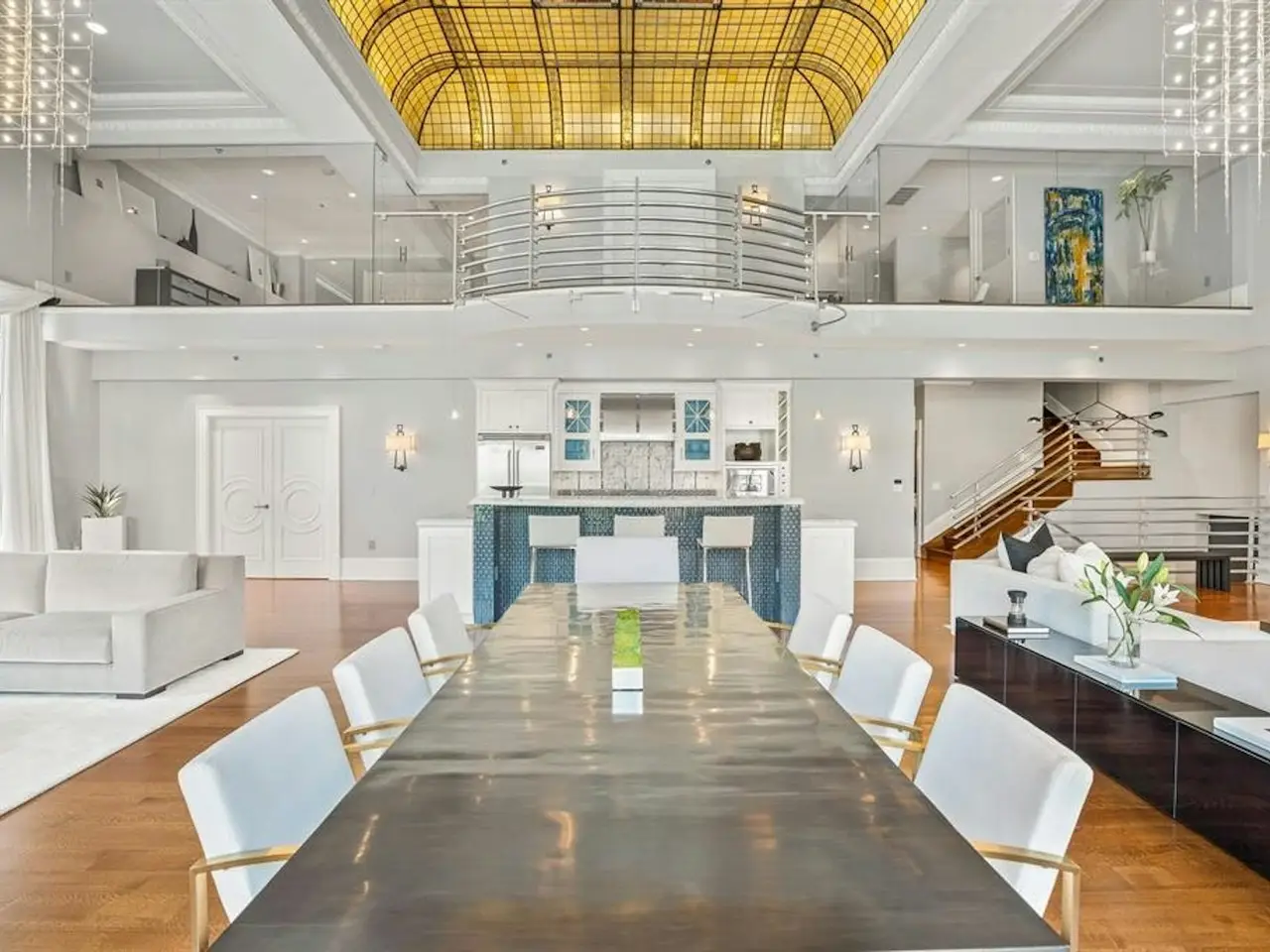 Stunning, one-of-a-kind corner loft at the Historic Jefferson Trust Bank building. Built in 1909 and placed on the National Register of Historic Places in 1986, this truly unique space has soaring 21 foot ceilings, 3180 SF of living space, 2 bedrooms plus den, 2.5 bathrooms, private keyed elevator access into the home and garage parking for one car. Designed for entertaining, the five 9.5 foot high windows with northern and western exposures saturate the great room with natural light. The original egg and dart plaster moldings and spectacular 400 square foot stained glass backlit skylight are significant examples of the historic architecture of the building and compliment the loft's scale and opulence. Open chef's kitchen features Viking appliances, Carrara marble countertops and large island with breakfast bar. Both bedrooms have en suite bathrooms complimented by duel sinks, soaking tubs and showers. Second floor den provides the perfect home office or nursery. Half bath, laundry room, dark stained wide-plank solid oak hardwood floors, motorized window treatments, smart-lighting system, fireplace and duel HVAC system round out this incredible home. Garage parking plus proximity to PATH, ferry, light rail and busses make commuting a breeze. Completely furnished including towels & linens, plates & glasses, pots & pans, cable/wifi & electric.