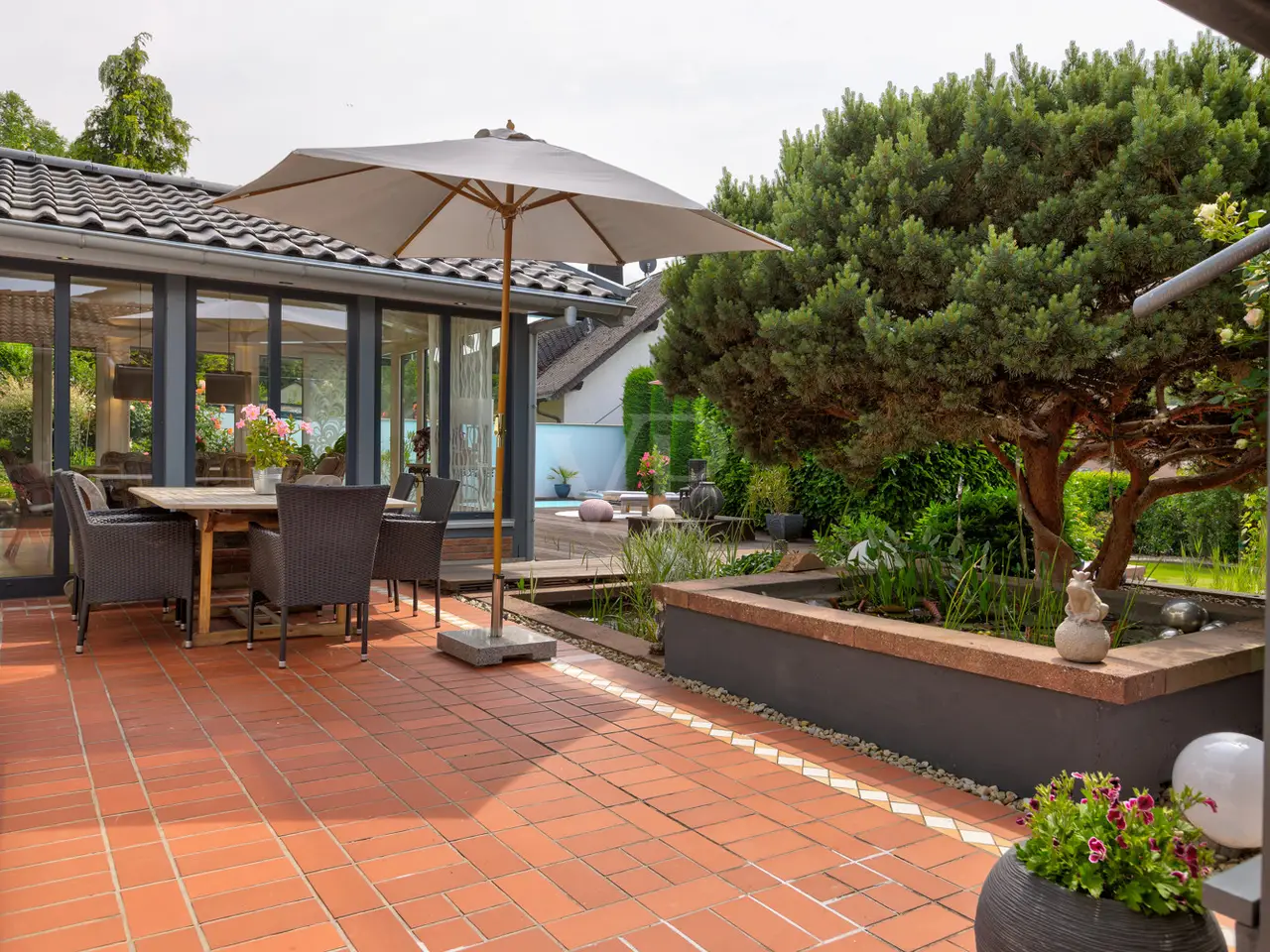 Living in the style of the New York Hamptons! Do you have a clear idea of your dream property? Are high-quality furnishings and a refurbished overall condition essential for you? Would you be delighted with the individual layout options within the property, entirely in line with your family concept? Absolute privacy in the house and garden is a must? Could a further development option on a separate plot of land be of interest to you? In summary, can you describe yourself as a customer with the desire to own something very special? If you fit this description, we look forward to introducing you to one of the most beautiful properties in Hofheim. This residential property offers a unique, superlative living experience that meets the highest standards of value. As soon as you enter the villa, the exclusivity and flair of this property become clear. Embedded in a magnificently designed garden landscape with a pool, spacious, partially covered terraces and a fish pond, it conveys a unique lifestyle. Come home and immerse yourself in your everyday vacation atmosphere with absolute privacy and enjoy the wonderful hours of sunshine by your own pool and the fantastic view of the Mediterranean garden. The living levels of this classic villa are exceptionally well laid out and, with 12 rooms on a total living area of 380 m², offer plenty of space for individual family arrangements. You enter your new home via a prestigious Hamptons-style entrance. Here you will be delighted by the impressive wooden staircase leading to the upper floor with three children's rooms. An open gallery room and a balcony with a wonderful view allow your children to spend time with friends undisturbed by their parents. A bathroom completes the space on this floor. The first floor has previously welcomed you and has the master area with dressing room and master bathroom. Three further rooms, one of which has a fireplace, offer many individual usage options. A shower room can be accessed from one of the en suite rooms as well as from the hallway. Ideal for your guests. The highlight is the garden level with the spacious open-plan living and dining area, which is accessed via a designer staircase and features an open-plan kitchen and a flowing transition into the charming conservatory. This is where the vacation mood comes to life. There are a total of three terraces in front: the first directly surrounding the pool, the second adjacent to the kitchen and ideal for dining with guests, and a third with two water basins and a stunted pine tree in true Feng Shui style. Another terrace is located by the special biotope of the garden pond; here you can relax in the hammock, read a book or make a campfire in the fire bowl with the children in the evening. An outbuilding can be used as a studio or workshop, but can also be used as a large garage. A further garage provides direct access to the house. A carport completes the parking space for your cars. Sports fans will also get their money's worth on the garden level, where a fitness room offers space for your sports equipment. The house also has a partial basement and a magnificent wine cellar. In summary, this is a residential property with rarity value, but also an offer with terrific value stability! The lower part of the plot has its own building window and can be developed with a further detached house with a living space of approx. 220 sqm. This increases the overall value in the long term. We are already looking forward to showing you this jewel in the Taunus during a personal tour.