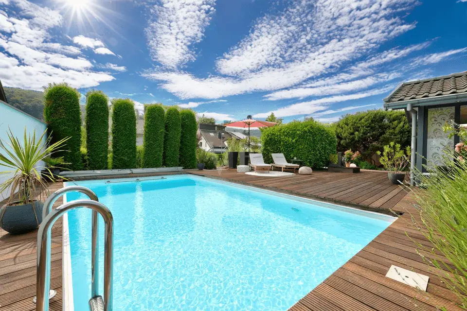 Magnificently designed garden landscape with pool