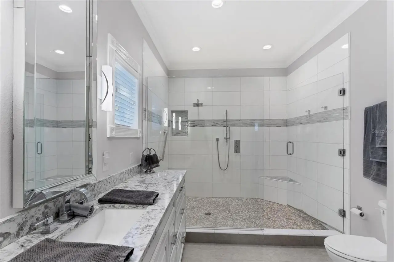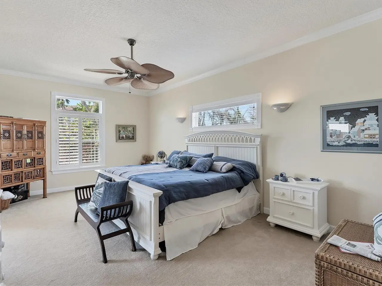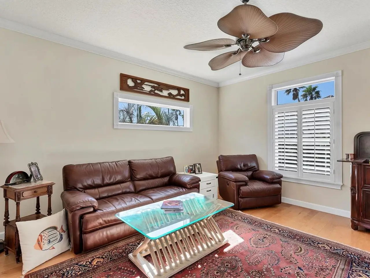 Location, location, location! This beautiful custom home in West Wind Shores is just across the street from the beach and minutes from Anna Maria Island. With an oasis-like backyard and swimming pool, this property offers the ultimate coastal lifestyle. Custom features abound, including high ceilings, arched entryways, travertine flooring, plantation shutters, 5-inch baseboards, recessed lighting, and large walk-in closets. As you enter through the front French doors, you're greeted by a cozy main living area complete with a gas fireplace. To the right, a versatile bonus space awaits, ideal for a dining area or hobby room. The thoughtfully designed split floor plan flows seamlessly, offering two primary bedrooms-one on each floor. The kitchen is a chef's delight, featuring granite countertops, custom cabinetry, newer Bosch appliances, including a Wolf gas stovetop with electric Wolf oven (rare on the island), a breakfast bar with pendant lighting, a glass-tiled backsplash, a wine refrigerator, and elegant travertine flooring. The downstairs primary suite overlooks the pool and offers ample space and luxurious details, including an oversized marble-tiled shower with a glass enclosure, dual sinks, extra storage, and a makeup/dressing table. Upstairs, the second primary suite boasts a large walk-in closet, an ensuite bath, and double doors leading to a loft area with large, picturesque windows that invite you to relax with a book in the afternoon light. The third bedroom is currently being used as an office, complete with built-in bookshelves and a Murphy bed for added flexibility. Sliding glass doors lead to a backyard oasis featuring palm trees, a pergola, a partially covered paver patio, and a completely fenced-in yard. The heated pool and outdoor kitchen, complete with a gas fireplace, create the perfect setting for entertaining. The space is wired for cable, allowing you to enjoy your favorite games while lounging or barbecuing. For pet lovers, there is a separate fenced area and a convenient storage shed. This custom home combines luxury, comfort, and an unbeatable location near the beach and Anna Maria Island. Convenient and complimentary trolley across the street. Walk across the street for sunset every night on the other side of a tall building complex. Don't miss your chance to own this coastal retreat