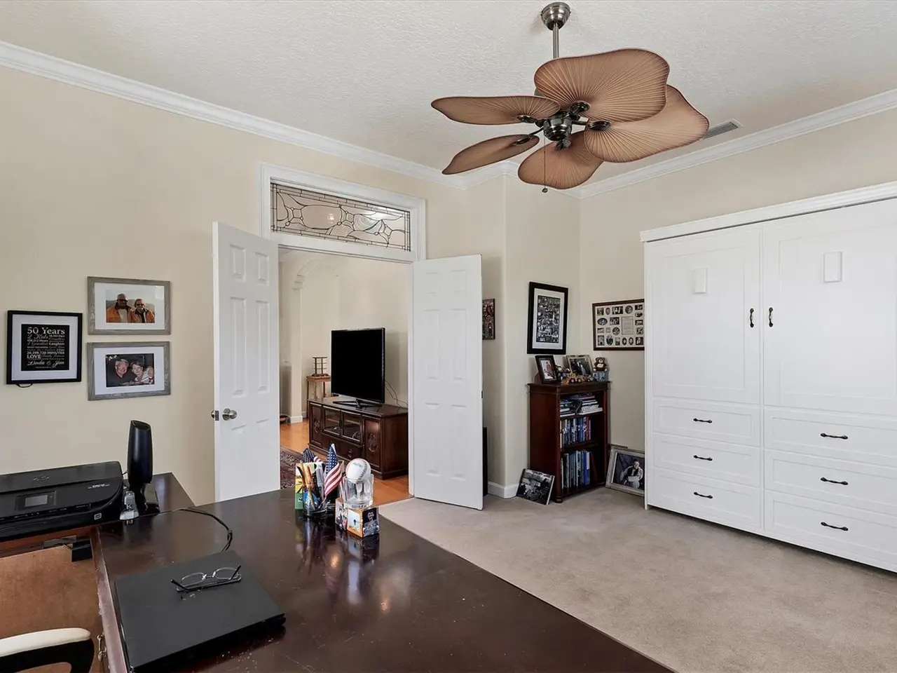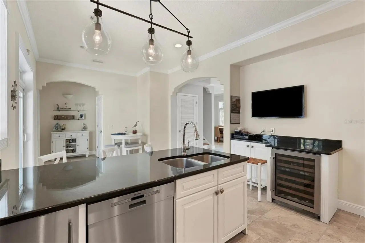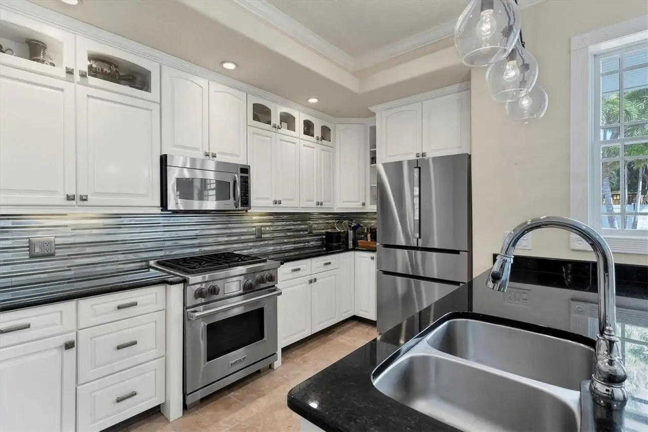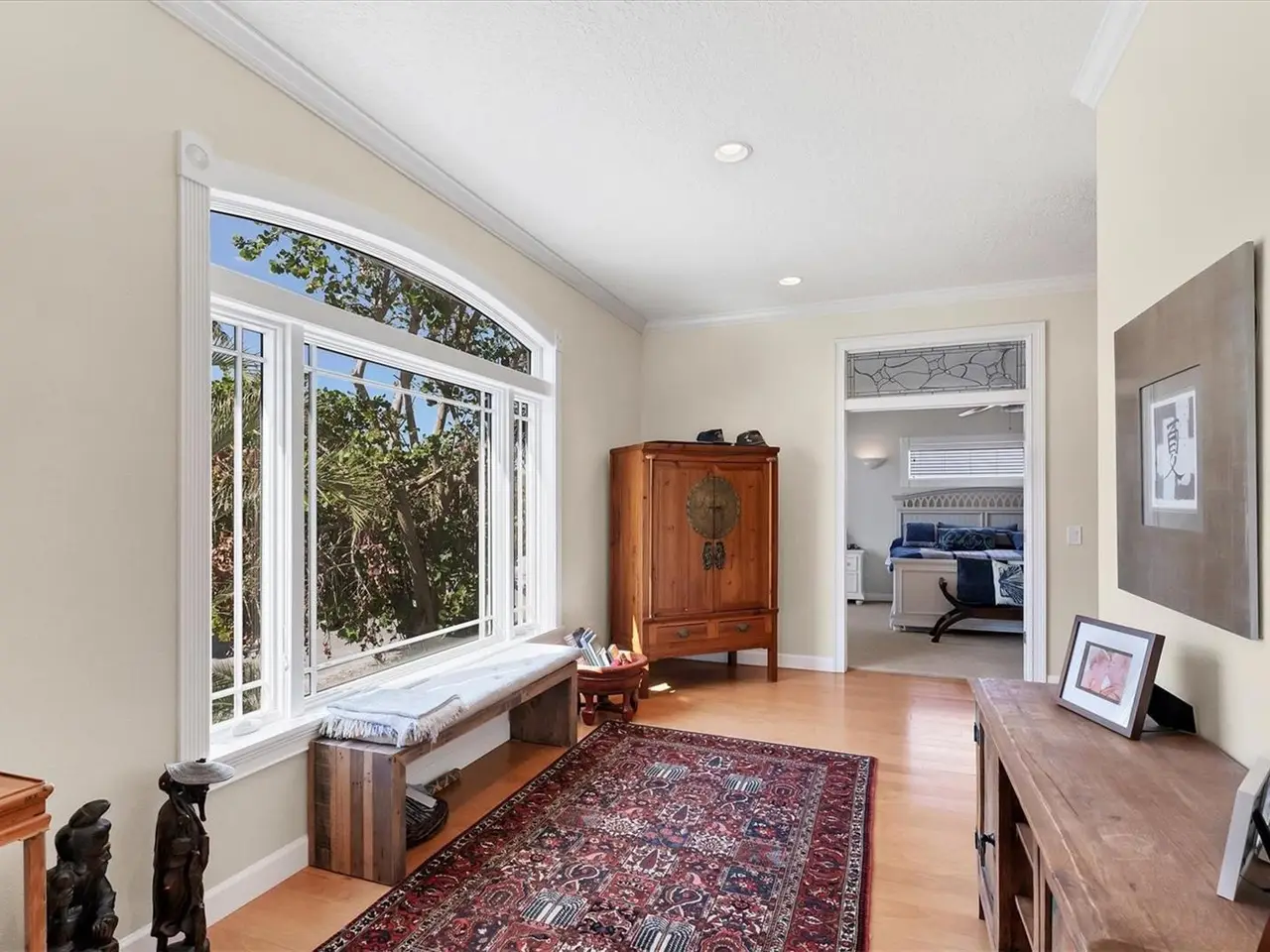 Location, location, location! This beautiful custom home in West Wind Shores is just across the street from the beach and minutes from Anna Maria Island. With an oasis-like backyard and swimming pool, this property offers the ultimate coastal lifestyle. Custom features abound, including high ceilings, arched entryways, travertine flooring, plantation shutters, 5-inch baseboards, recessed lighting, and large walk-in closets. As you enter through the front French doors, you're greeted by a cozy main living area complete with a gas fireplace. To the right, a versatile bonus space awaits, ideal for a dining area or hobby room. The thoughtfully designed split floor plan flows seamlessly, offering two primary bedrooms-one on each floor. The kitchen is a chef's delight, featuring granite countertops, custom cabinetry, newer Bosch appliances, including a Wolf gas stovetop with electric Wolf oven (rare on the island), a breakfast bar with pendant lighting, a glass-tiled backsplash, a wine refrigerator, and elegant travertine flooring. The downstairs primary suite overlooks the pool and offers ample space and luxurious details, including an oversized marble-tiled shower with a glass enclosure, dual sinks, extra storage, and a makeup/dressing table. Upstairs, the second primary suite boasts a large walk-in closet, an ensuite bath, and double doors leading to a loft area with large, picturesque windows that invite you to relax with a book in the afternoon light. The third bedroom is currently being used as an office, complete with built-in bookshelves and a Murphy bed for added flexibility. Sliding glass doors lead to a backyard oasis featuring palm trees, a pergola, a partially covered paver patio, and a completely fenced-in yard. The heated pool and outdoor kitchen, complete with a gas fireplace, create the perfect setting for entertaining. The space is wired for cable, allowing you to enjoy your favorite games while lounging or barbecuing. For pet lovers, there is a separate fenced area and a convenient storage shed. This custom home combines luxury, comfort, and an unbeatable location near the beach and Anna Maria Island. Convenient and complimentary trolley across the street. Walk across the street for sunset every night on the other side of a tall building complex. Don't miss your chance to own this coastal retreat