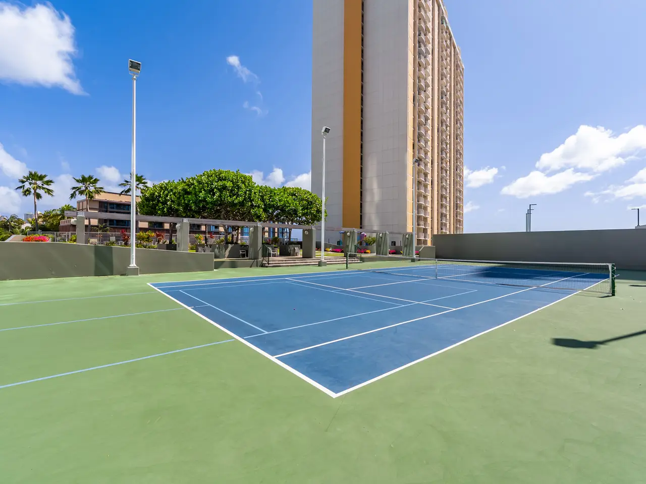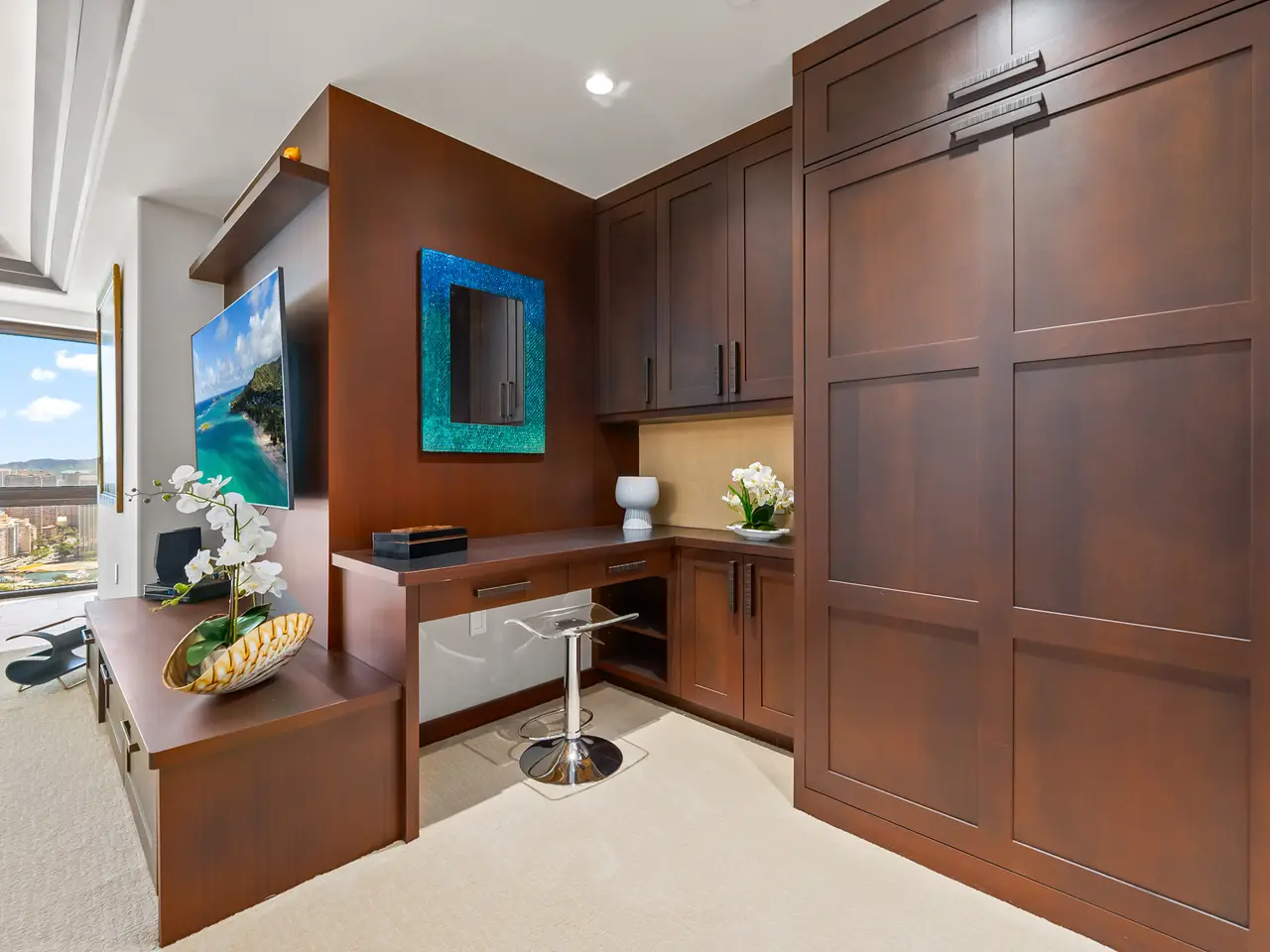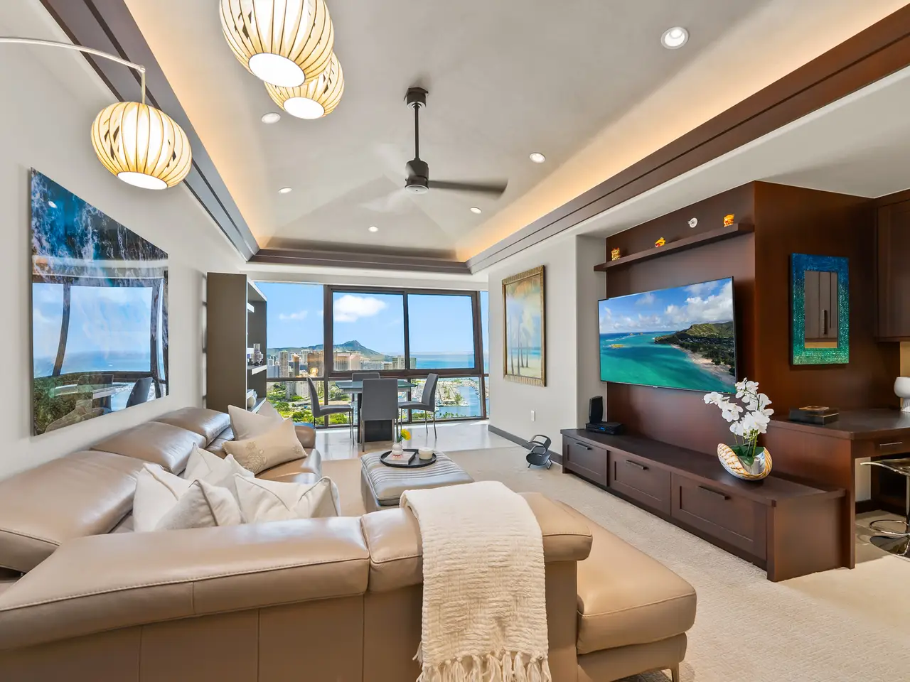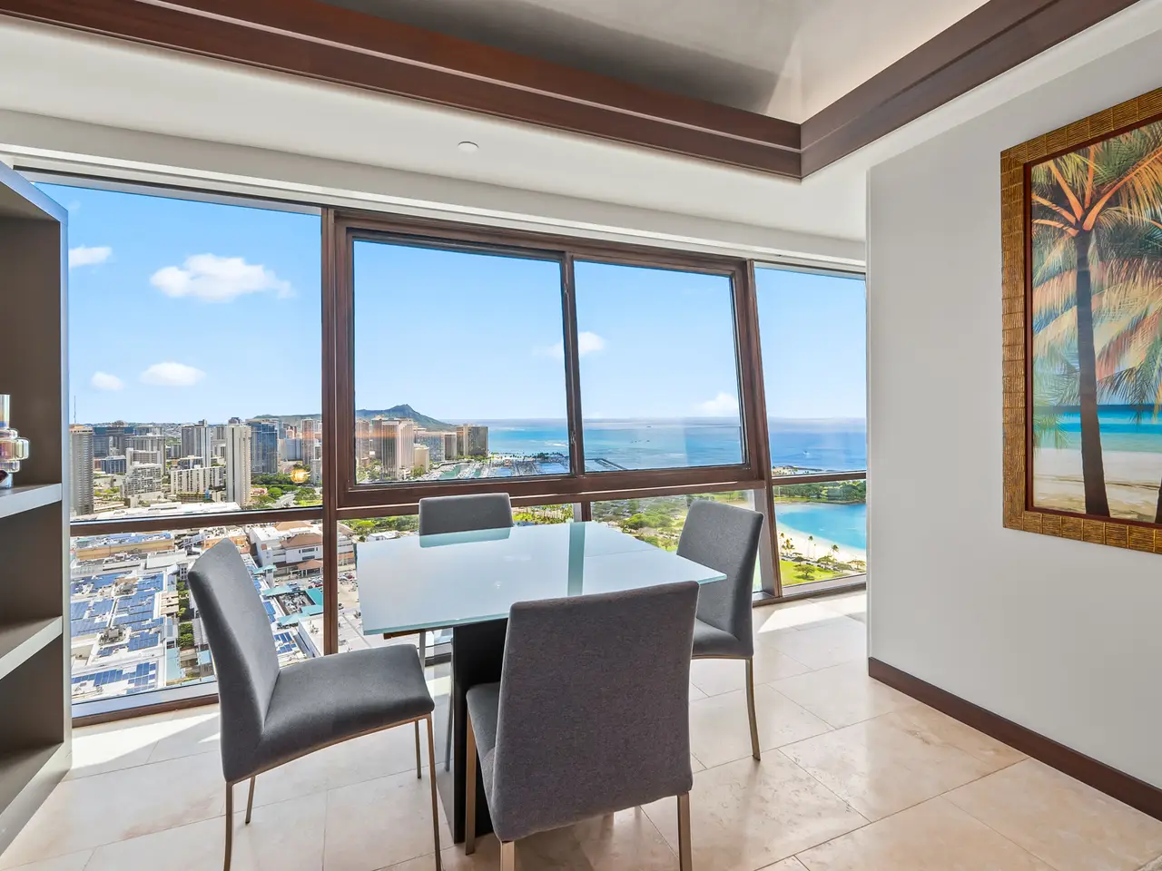 A Rare Opportunity for Elevated Island Living – 44th-Floor Residence in Hawaiki Towers. Experience luxury in this exquisitely renovated 2-bedroom, 2-bathroom residence perched on the 44th floor of the coveted Hawaiki Towers. Expansive floor-to-ceiling windows in living and bedrooms. This stunning home offers panoramic views of Magic Island, Ala Moana Beach Park, sunsets over Diamond Head, and the Koolau slopes. This fully furnished and redesigned (2006/2014) unit offers the perfect blend of luxury, convenience, and breathtaking views. Two secured covered parking stalls and storage, this home provides unbeatable comfort and functionality. Custom high-end finishes, including sapele wood cabinetry, gourmet kitchen, and a primary suite to enhance the refined living experience. Resort-style amenities make this property truly exceptional. The infinity-edge pool & spa offer a perfect place to relax, and the pickleball & tennis courts offer a great way to stay active. Located across from Ala Moana Center and just steps from the beach, this unit provides an unbeatable island lifestyle, where everything you need is right at your doorstep. Se Owner is Licensed HI Realtor