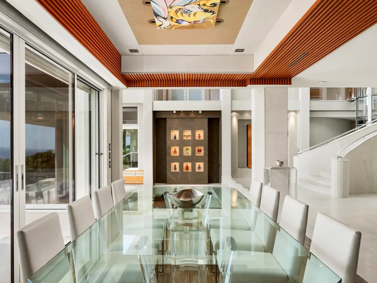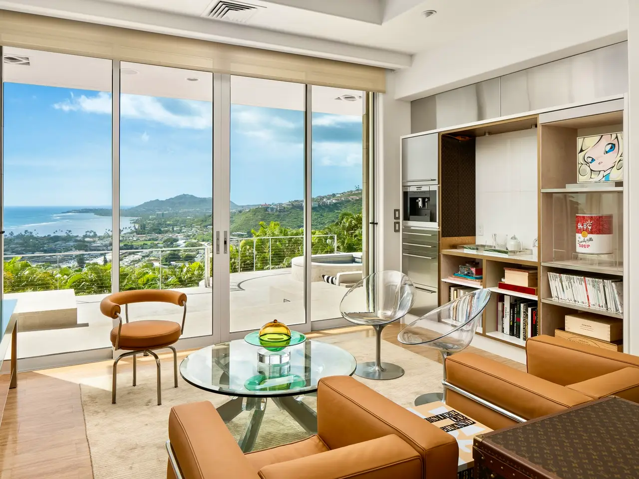 Perched on a prime hillside, Kaimana Hila offers sweeping views of Diamond Head, the Pacific Ocean, and Oahu’s lush coastline and mountains from nearly every room. Designed by award-winning architect Jeff Long, this residence combines resilient steel-and-concrete construction with high-fashion interiors crafted by artisans known for their work on ultra-luxury yachts and couture boutiques. Exquisite details like Spinneybeck leather walls, custom Italian closets by Molteni & C Dada, and seamless, vein-matched travertine marble bathrooms showcase luxury at every turn. At its heart, a Pininfarina-designed kitchen with Snaidero cabinetry and Gaggenau appliances elevates daily living and entertaining alike. Outside, an expansive limestone lanai with a saltwater infinity pool and hot tub, framed by lush landscaping and breathtaking views, creates a resort-style sanctuary. German-engineered hurricane shutters, a professional security system, and the exclusivity of Honolulu’s premier gated community, Hawaii Loa Ridge, make Kaimana Hila a true lock-and-go residence—offering unmatched luxury and refinement in Honolulu.