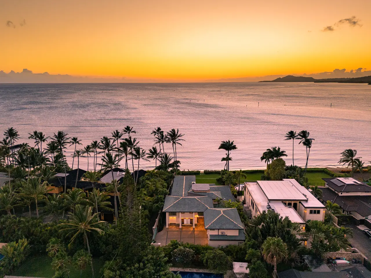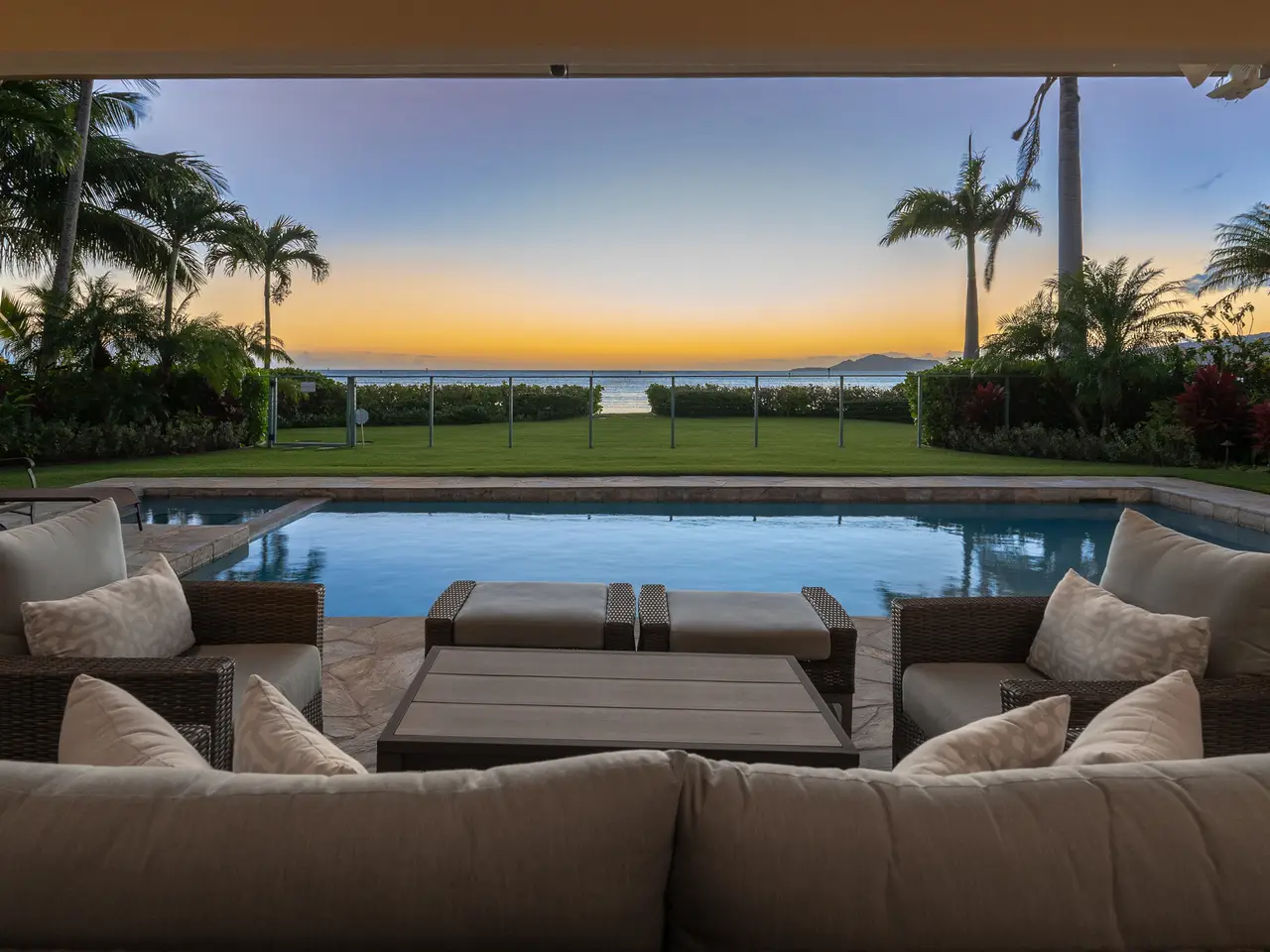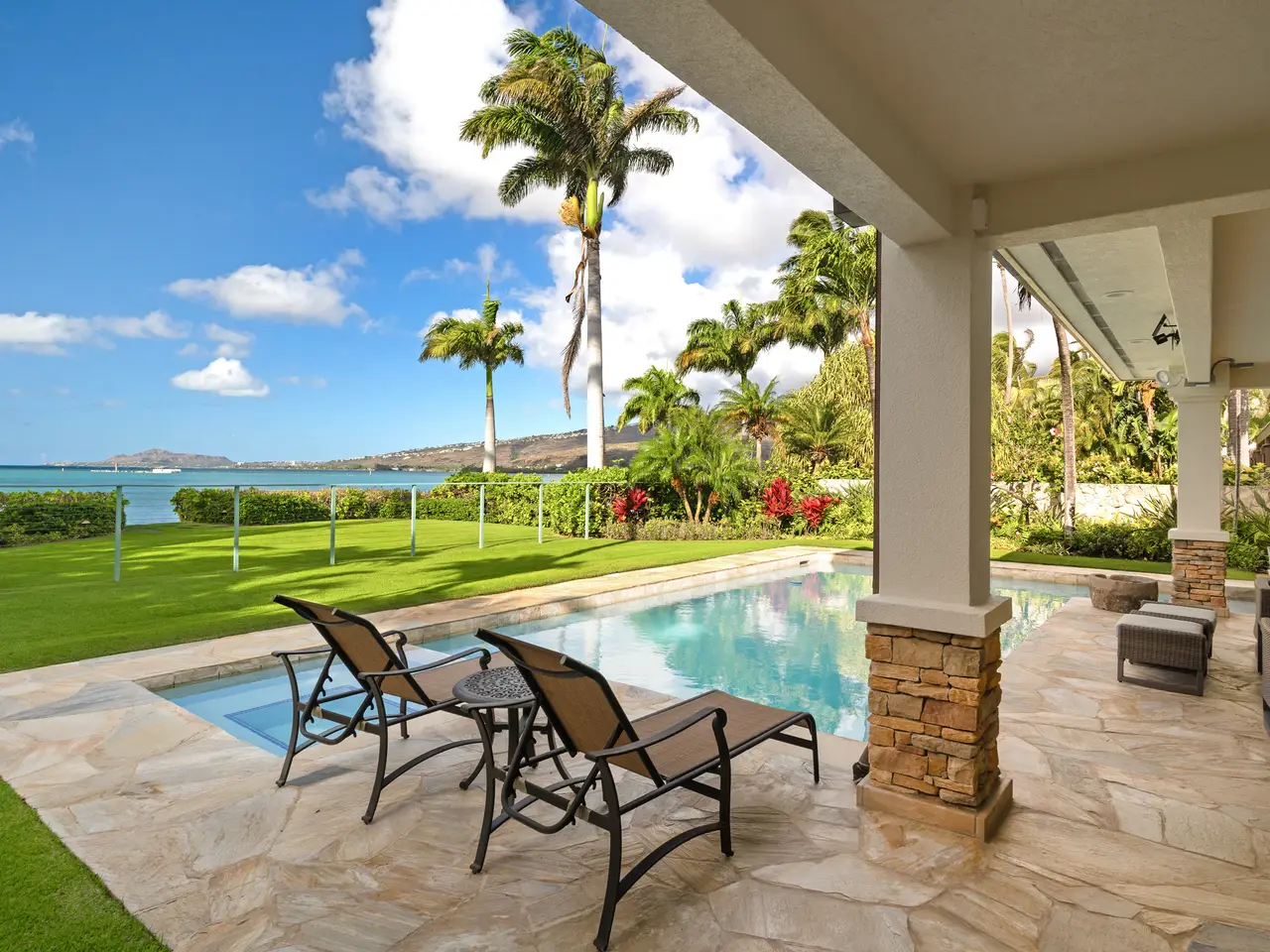 Unquestionably one of the most beautiful oceanfront views on Oahu. With Koko Head on one side, Diamond Head and the twinkling Honolulu skyline on the other, and the vast blue Pacific ahead, this estate in the prestigious Portlock neighborhood offers breathtaking panoramas from sunrise to sunset. Set along a white sandy beach, this impeccably maintained residence spans 7,461 sq/ft of thoughtfully designed living spaces. Cathedral ceilings, travertine floors and a grand circular staircase define the open-concept interior, while 8 foot pocket sliding doors extend to a private tropical retreat with a pool and spa. The main home features five bedrooms and five and a half bathrooms, including two oceanfront primary suites—one on each level—each with a lanai framing the stunning oceanfront views. Open the doors to let in the trade winds and the rhythmic sound of the waves, creating an atmosphere of complete serenity. A studio apartment above the three-car garage provides additional accommodations. A high-end kitchen and gated grounds complete this exceptional residence. Enjoy the convenience of having direct beach access to the ocean from your backyard!