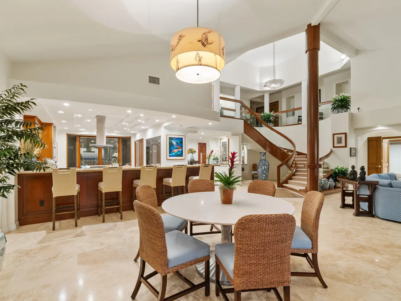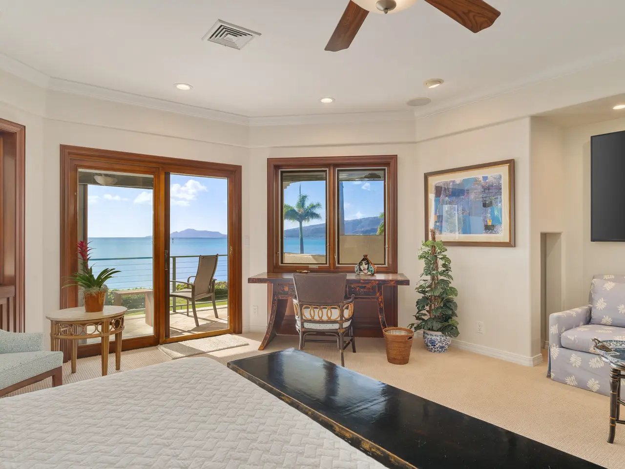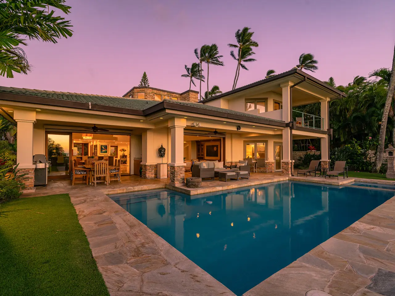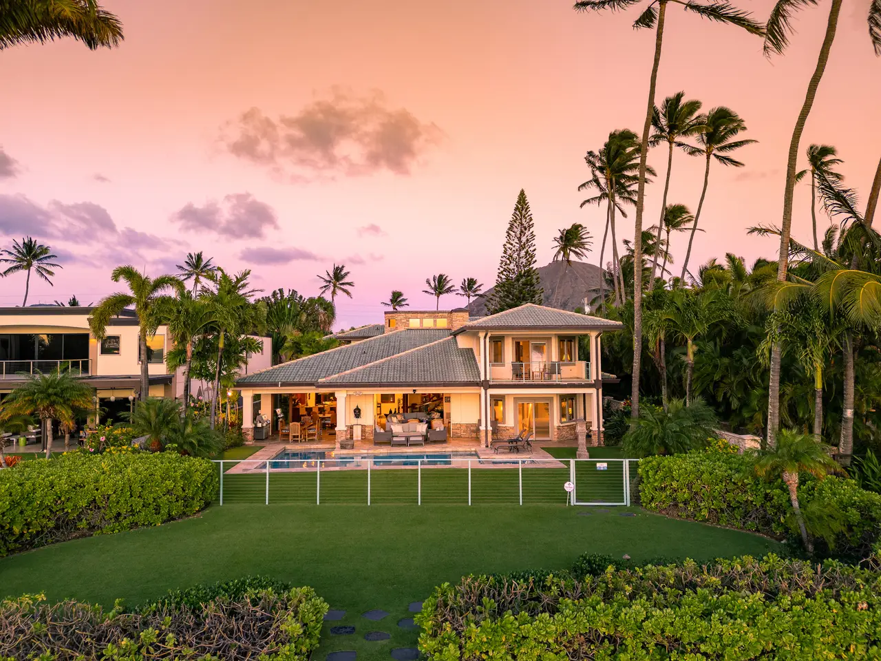 Unquestionably one of the most beautiful oceanfront views on Oahu. With Koko Head on one side, Diamond Head and the twinkling Honolulu skyline on the other, and the vast blue Pacific ahead, this estate in the prestigious Portlock neighborhood offers breathtaking panoramas from sunrise to sunset. Set along a white sandy beach, this impeccably maintained residence spans 7,461 sq/ft of thoughtfully designed living spaces. Cathedral ceilings, travertine floors and a grand circular staircase define the open-concept interior, while 8 foot pocket sliding doors extend to a private tropical retreat with a pool and spa. The main home features five bedrooms and five and a half bathrooms, including two oceanfront primary suites—one on each level—each with a lanai framing the stunning oceanfront views. Open the doors to let in the trade winds and the rhythmic sound of the waves, creating an atmosphere of complete serenity. A studio apartment above the three-car garage provides additional accommodations. A high-end kitchen and gated grounds complete this exceptional residence. Enjoy the convenience of having direct beach access to the ocean from your backyard!