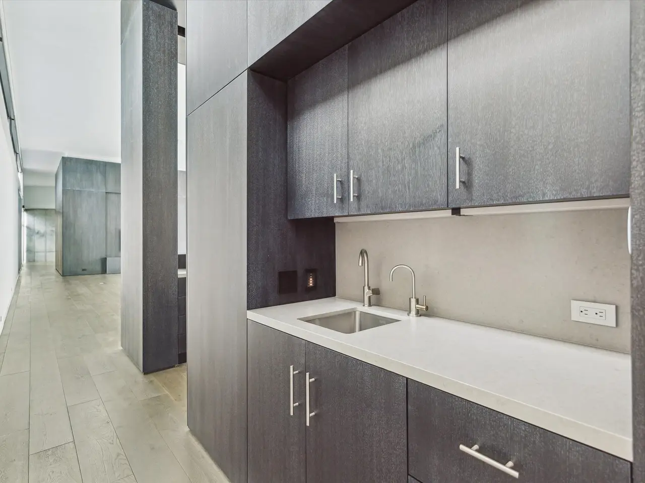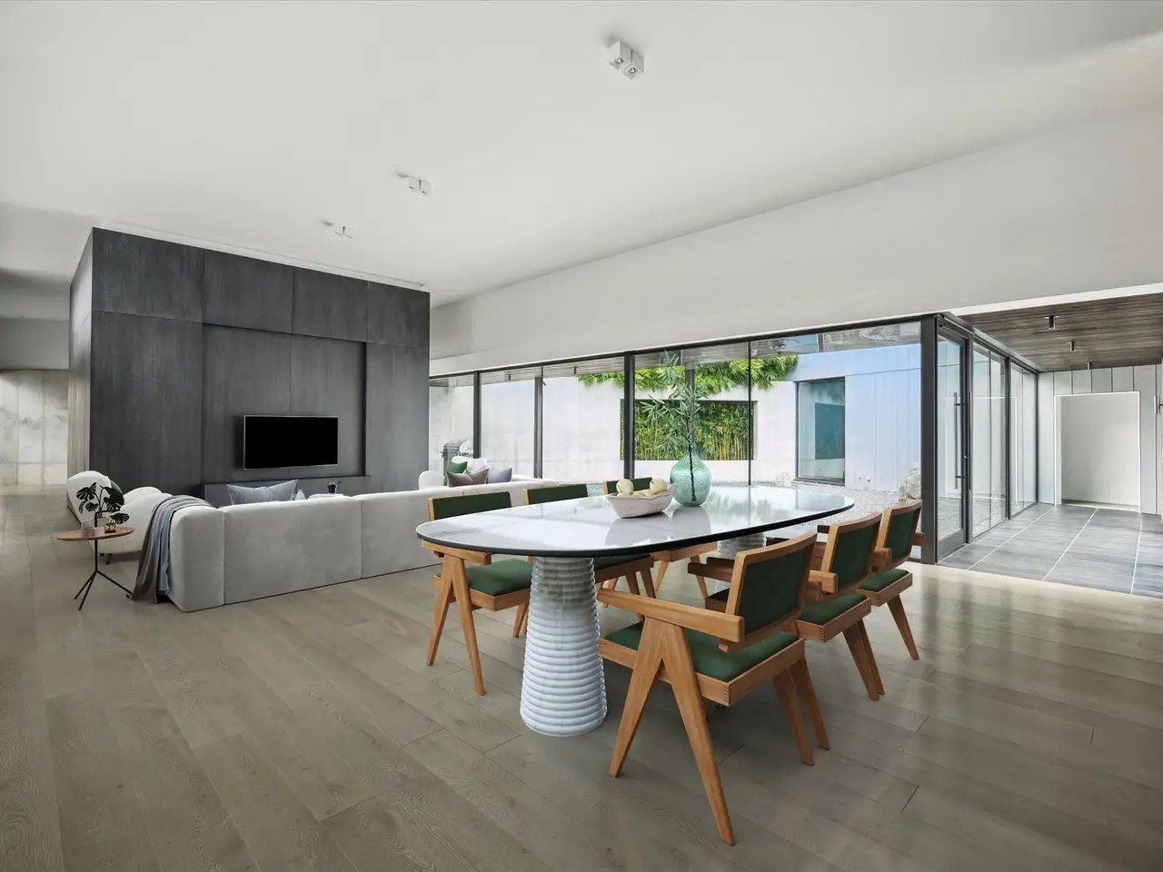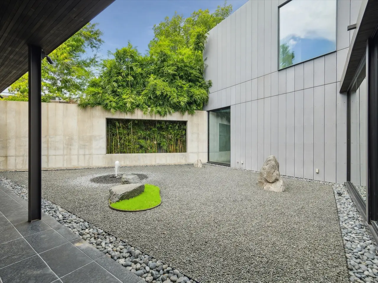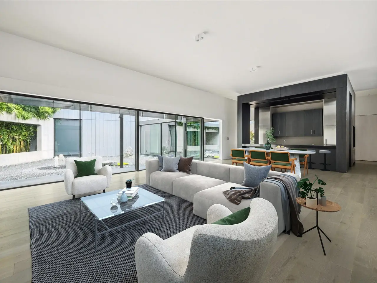This chic home was created by Robertson Design with clean lines, 14-foot ceilings, an abundance of natural light, open floor plan, and floor-to-ceiling windows with views to a Zen-like courtyard. In addition to a stunning living/dining room the home includes three bedrooms, 3.5 baths, with two primary suites. Both of the primary suites have spa-like bathrooms and large walk-in closets. Additional rooms include an office, gym and a guest bedroom with an en-suite bath. The kitchen has Miele appliances, built-in refrigerator/freezer, with breakfast bar opening to the living area. Other special features include an elevator and a generator. Per Seller.