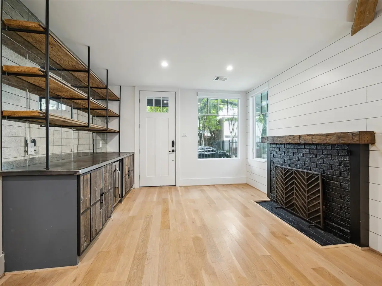 This impeccably renovated 2-bedroom, 2-bathroom home (2022) offers high-end design, stunning architectural details, and effortless indoor-outdoor living. Vaulted ceilings with exposed beams and wide-plank oak floors set the tone for the open-concept living and kitchen space—anchored by a dramatic black tile backsplash, quartz countertops, white oak cabinetry, and a built-in Thermador fridge & freezer. The primary suite is a true sanctuary, featuring a bold black-paneled ceiling, soft neutral finishes, and a spa-inspired bath. Step outside to your own private retreat—complete with a plunge pool, custom outdoor kitchen with Big Green Egg, lush greenery, completely turfed yard, built-in lounge seating, & an open-air shower. The detached garage apartment offers 775 sq ft of flexible living space with 1 bedroom, 1 bathroom, a kitchenette, dining area, and living room—perfect for guests, income potential, or work-from-home needs. This Montrose gem offers the best of Houston living.