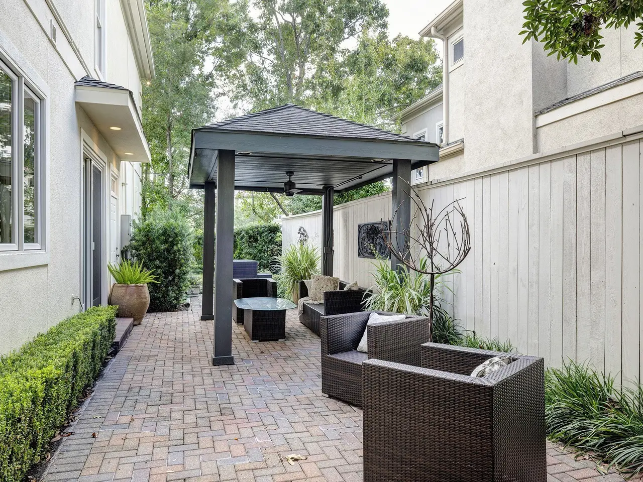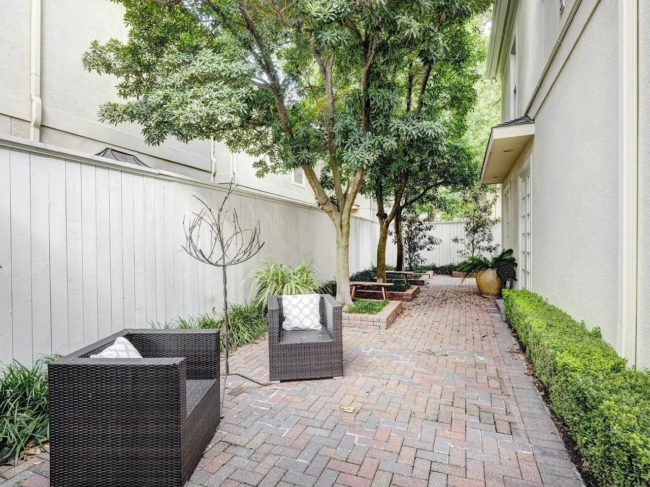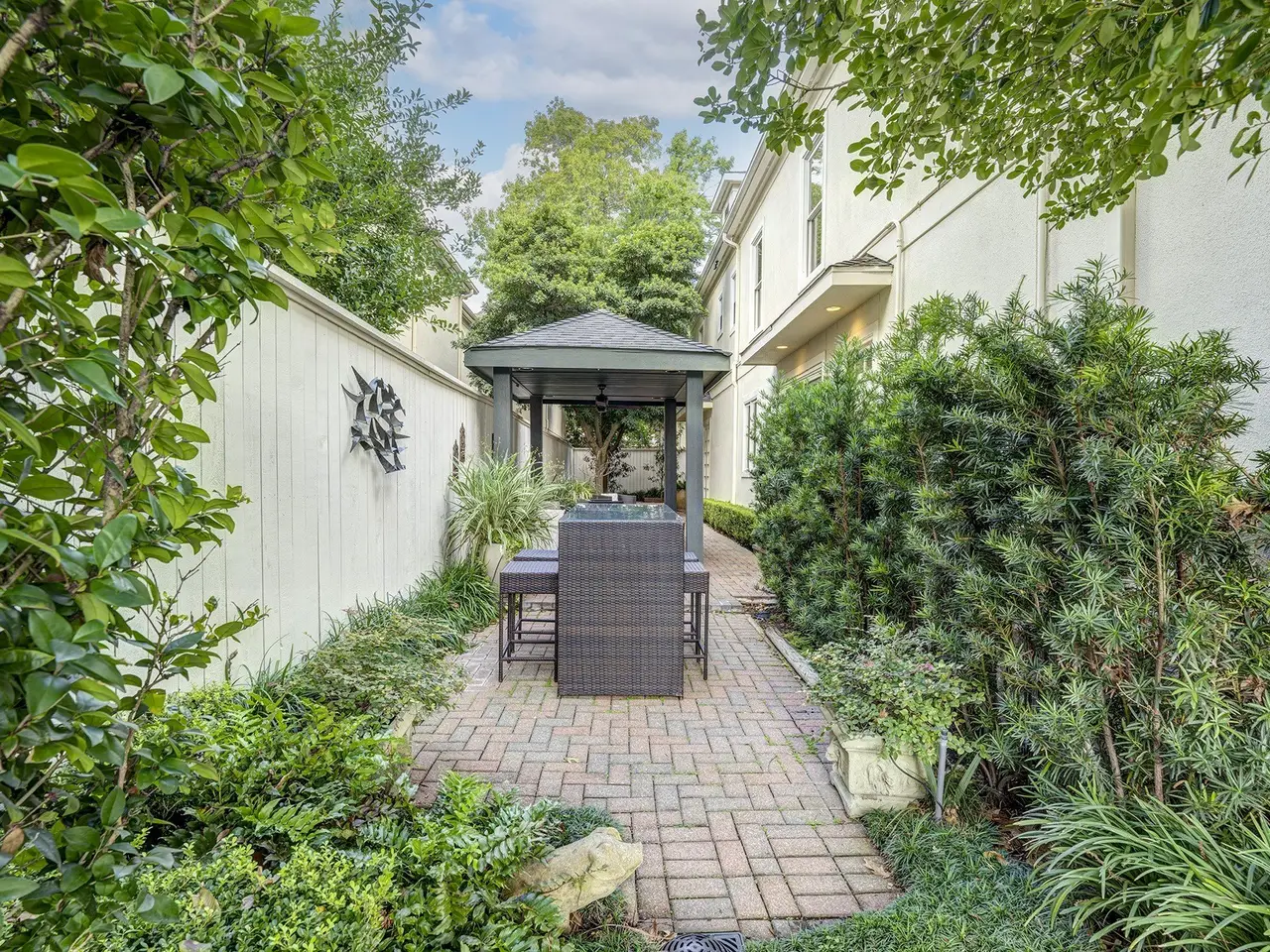 Only three homes in this lovely gated enclave—offering unmatched privacy, exceptional green space, and rare additional parking. Rich hardwood floors grace both the first and second levels. Features include an elevator, whole-house generator, mosquito misting system, and numerous tasteful updates. The kitchen boasts an expanded island, butler’s pantry, and walk-in pantry. The primary suite offers a fireplace, private sitting room with custom built-ins, two large closets, and a renovated spa-like shower. One secondary bedroom doubles as a sophisticated study with built-ins, private bath, and walk-in closet. Three bedrooms on the 2nd floor. The spacious 3rd-floor suite includes a full bath and closet. A charming pergola sits just beyond the kitchen, overlooking a curated yard—ideal for pets or a future cocktail pool. All info per Seller.