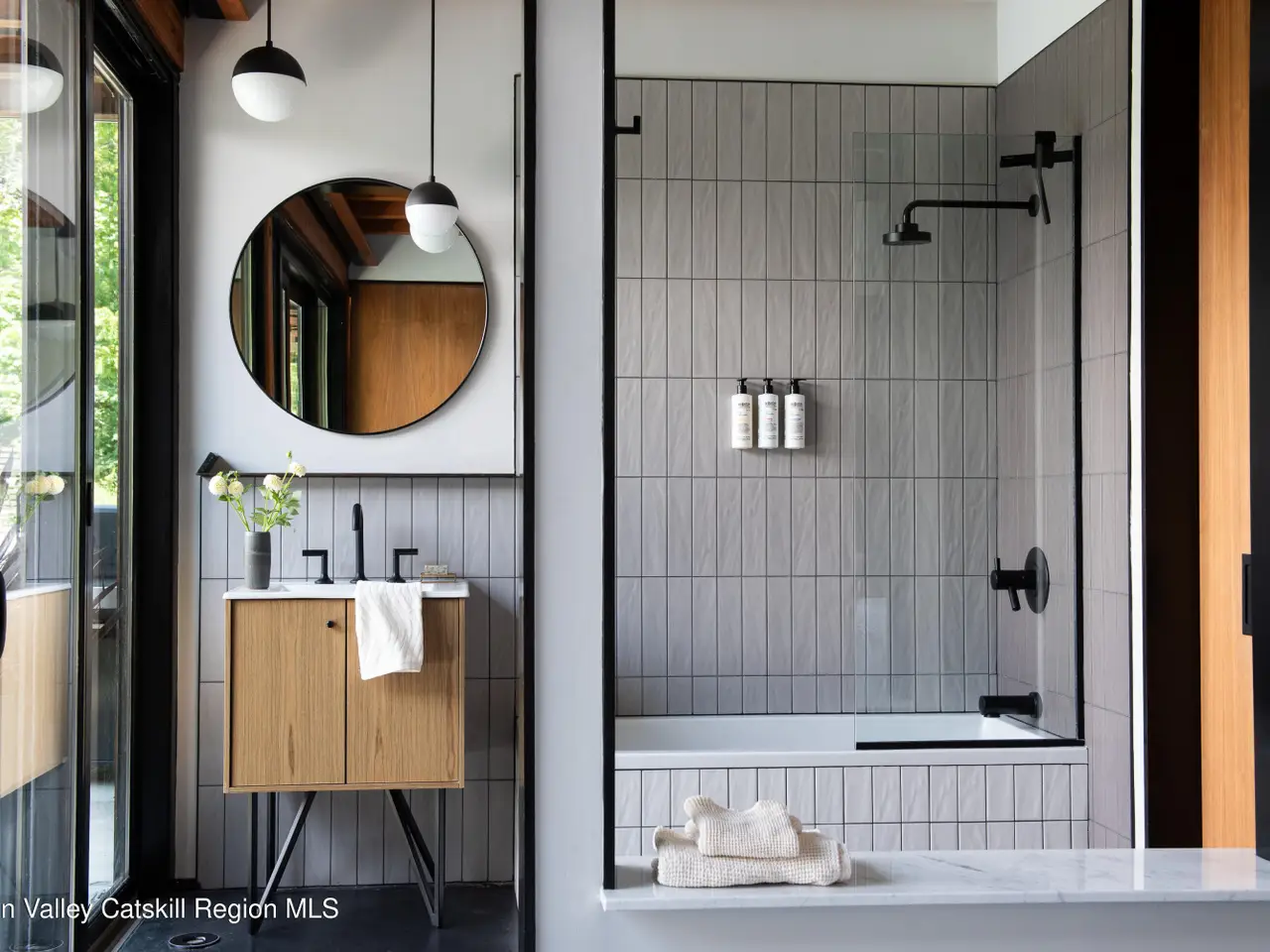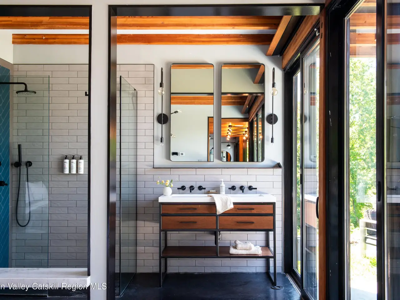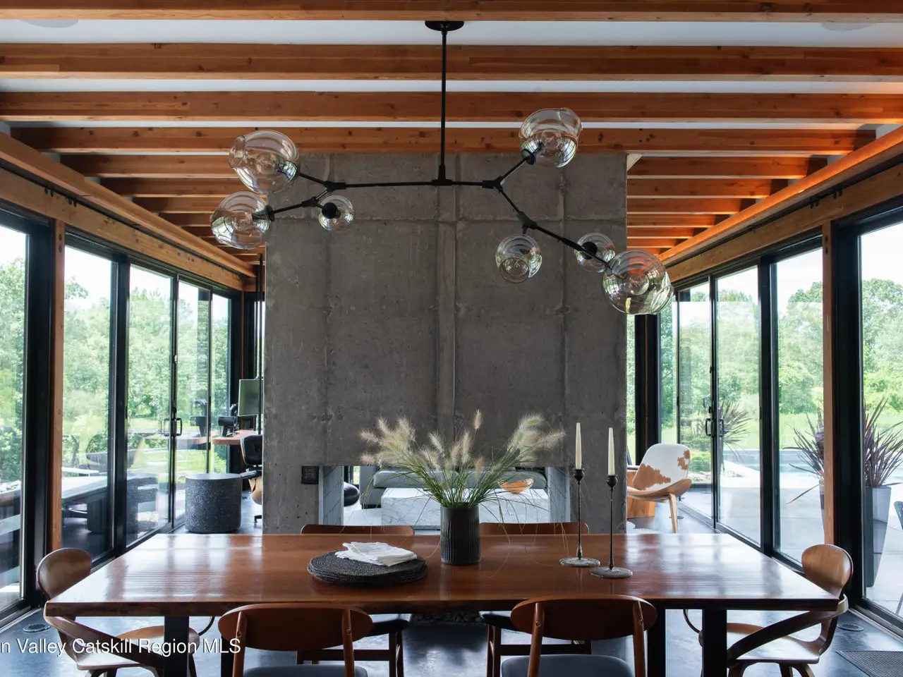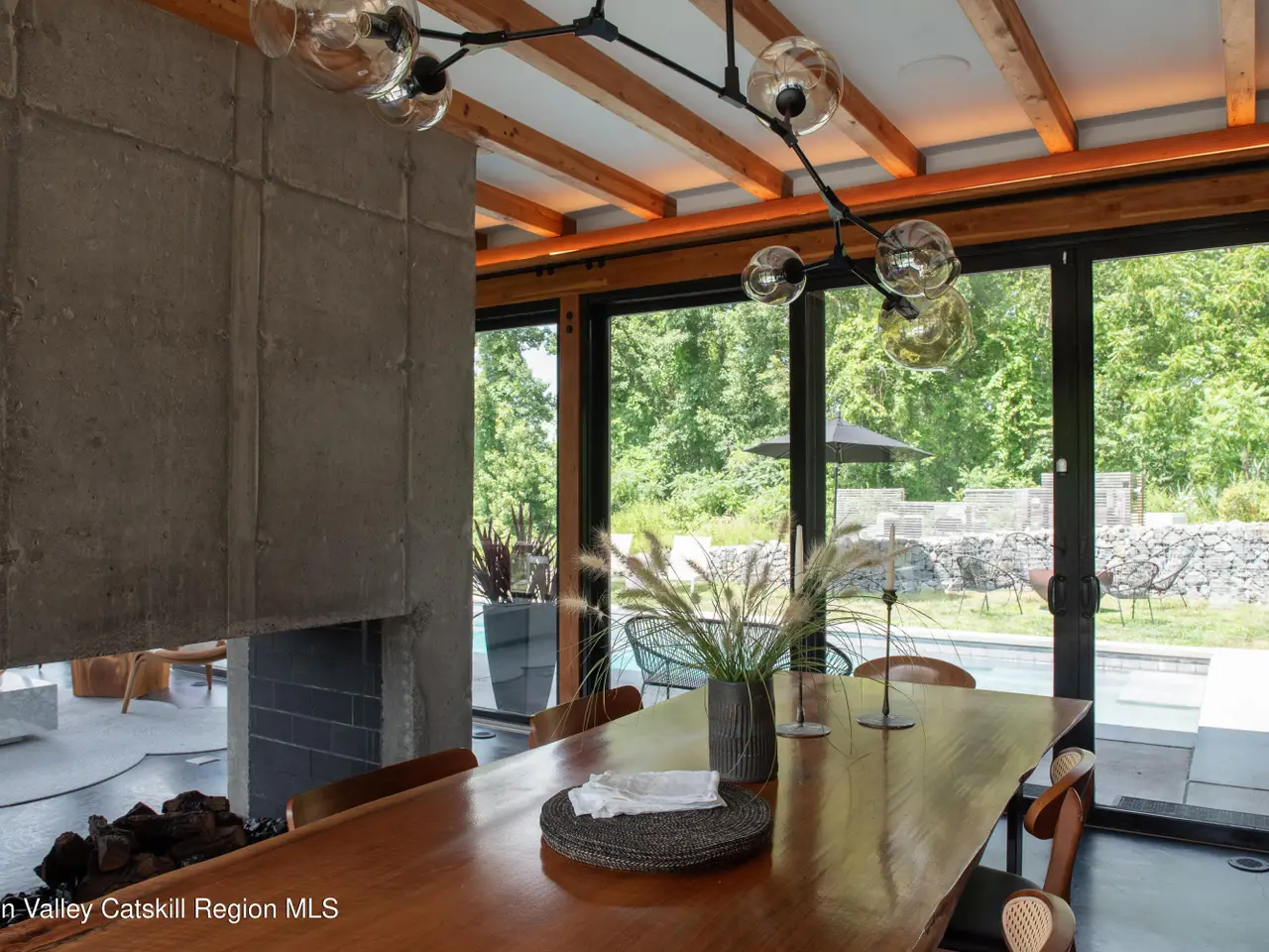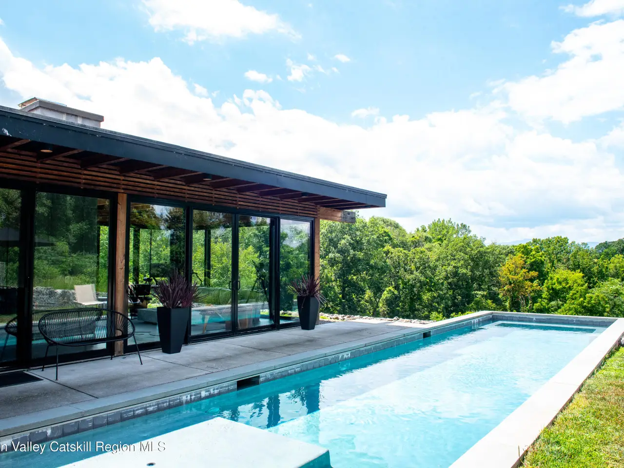 462 Mt Merino / Modernist Glass House in the Hudson River Valley. Beautifully sited on 25 private acres along desirable Mount Merino Road one of the most coveted streets in Columbia County with its sweeping Catskill Mountain views is this NYC architect-designed glass house which offers a rare connection to nature. Inspired by 1960s Hollywood Hills Case Study homes, the residence dissolves boundaries between interior and exterior living. Reached by a long private drive, the home features floor-to-ceiling glass walls that frame mountain vistas and fill spaces with natural light. The great room combines a state-of-the-art kitchen with a modernist living space centered around a striking two-sided fireplace, while two spacious ensuite bedrooms offer private retreats with expansive views. The seamless connection between house and pool creates uninterrupted indoor-outdoor flow. This stunning property presents an exceptional opportunity to create a family compound as the existing glass house serves beautifully as a central anchor, ready to complement a larger family dwelling on the 25-acre canvas. The property currently serves as a luxury vacation rental but is turn-key for full-time or part-time living. Located minutes from Hudson's Warren Street and Amtrak station, 462 Mount Merino combines secluded mountain living with convenient access to galleries, dining, and direct Manhattan connections.