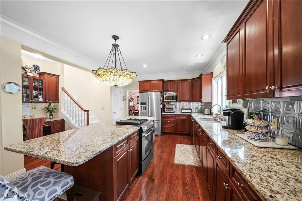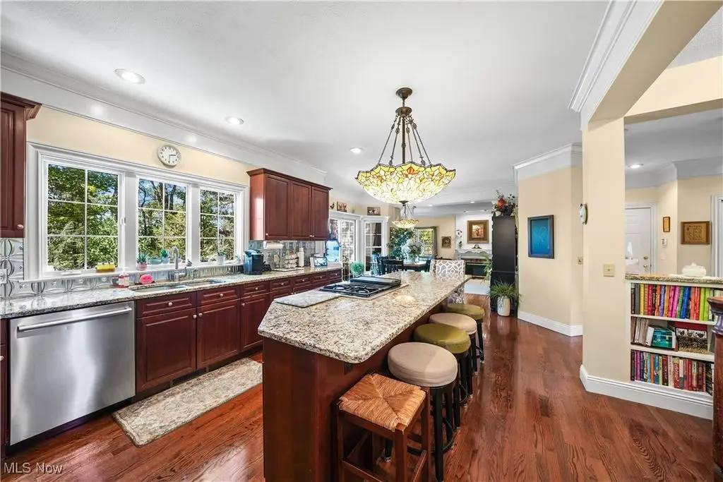 One of Hudson's Finest Custom Homes on Morning Song Lane is in one of the most sought-after neighborhoods, this exceptional custom-built home by Peter Paino blends quality craftsmanship with thoughtful design and luxury finishes. Just minutes from downtown shops, restaurants, parks, and award-winning schools, this home offers the perfect combination of convenience and privacy. Step inside to find a beautifully updated kitchen featuring granite countertops, stainless steel appliances, a walk-in pantry, breakfast bar, and rich hardwood floors. The casual bayed dining area opens to a large deck overlooking a private, wooded backyard-ideal for outdoor dining or morning coffee. The spacious family room features a fireplace with a custom mantle and French doors leading to an all-season sunroom filled with natural light from a wall of windows. The formal living room, adorned with custom molding, seamlessly flows into the elegant dining room, perfect for entertainment. A private library with built-in shelves offers a quiet retreat or home office space. Completing the first floor are a mudroom, powder room, and a well-appointed laundry room. Upstairs, the luxurious Owner's Suite includes a large walk-in closet, spa-like en-suite bath, and a private sitting area. Three additional bedrooms offer flexible living options-two share a Jack and Jill bath, while the third has its own private en-suite. The fabulous, finished walk-out lower level includes three recreation rooms, ideal for a media room, home gym, or guest suite, along with the home's fourth full bathroom. Additional highlights include: inviting brick exterior with front porch and professional landscaping, oversized 3-car garage, open foyer with dramatic split staircase, 9-foot ceilings on the main level, and serene wooded backyard for year-round enjoyment. This meticulously maintained home offers timeless style, generous living space, and an unbeatable location.
