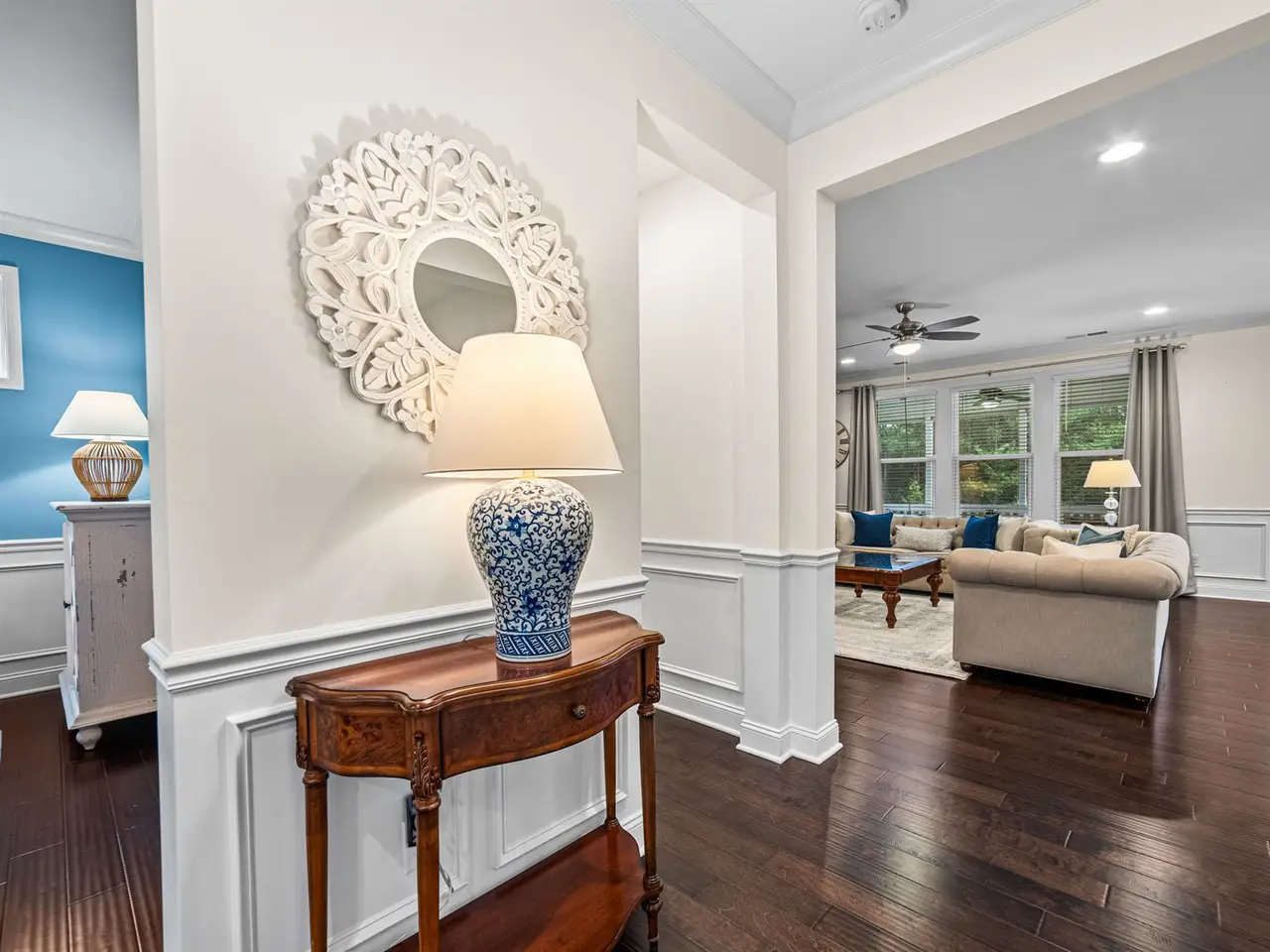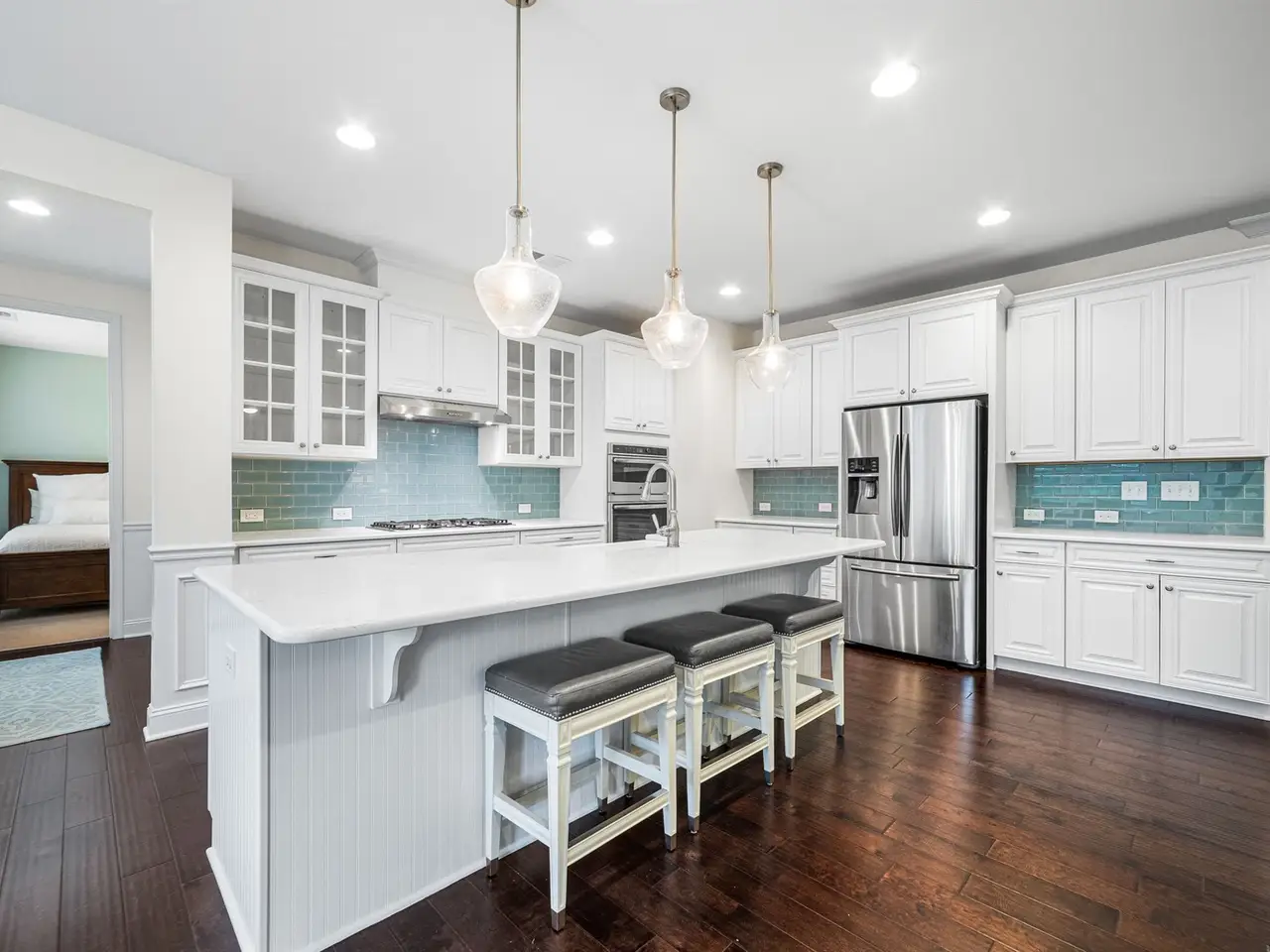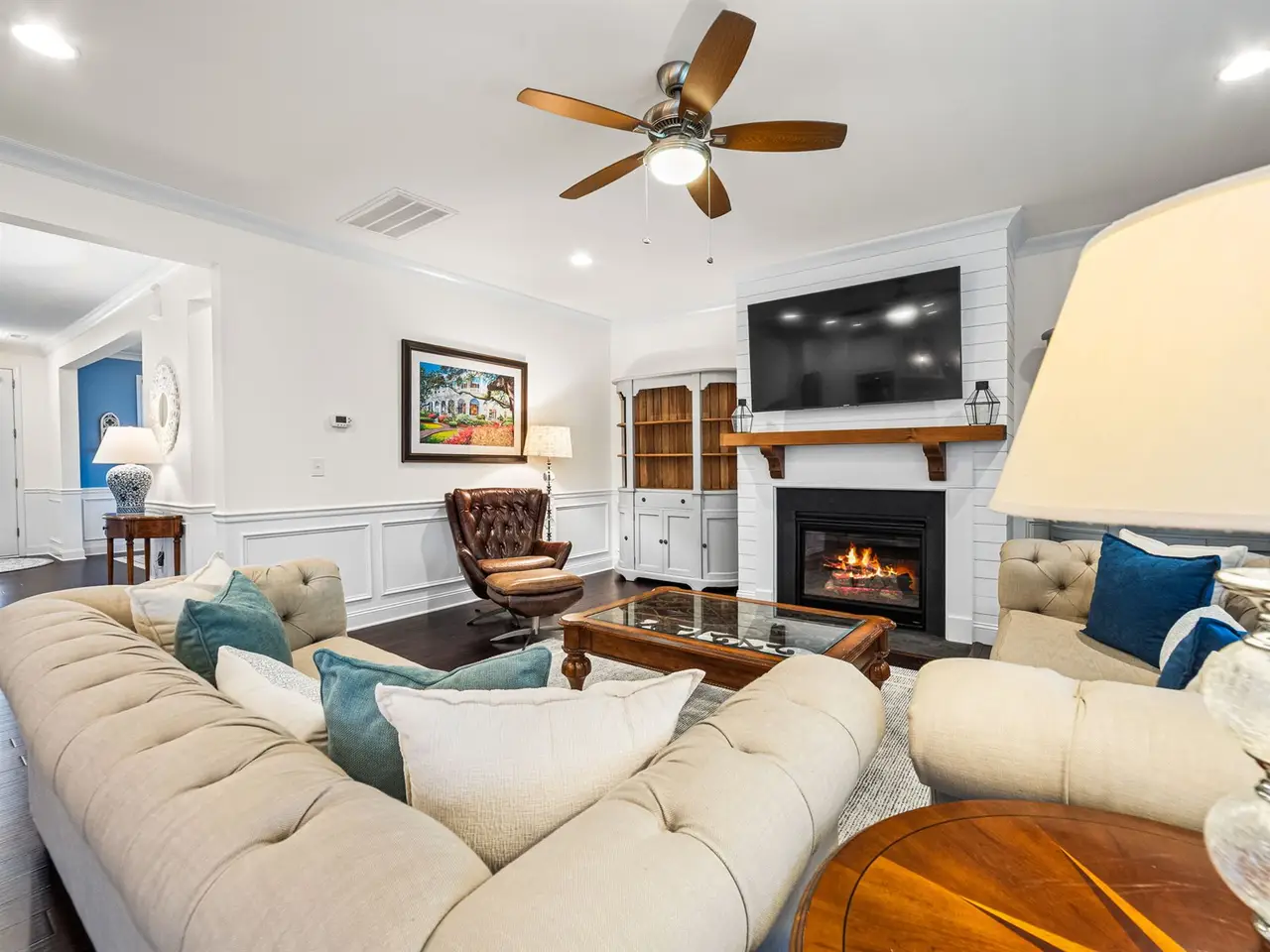 Gorgeous, meticulously maintained home in sought-after Cobblestone Manor! Premier lot backs to a serene common area with mature trees and sits directly across from the neighborhood pool. The open-concept layout offers a main-level guest suite, inviting great room, screened porch with patio access, dedicated office, drop zone, and a designer kitchen with oversized island, gas range, wall ovens, and walk-in pantry with custom glass door. High-end features include upgraded millwork, storm door, tankless water heater, in-wall pest system, extended front driveway and rear patio, custom fireplace with shiplap and mantel, fire pit, and sizable closets. Luxurious primary suite upstairs features dual walk-in closets, double vanities, and a soaking garden tub. Three additional bedrooms, including one with private en-suite, plus a spacious loft offer versatility. Exceptional outdoor living and refined interiors make this a rare opportunity in a prime location!