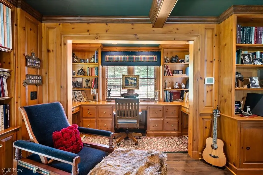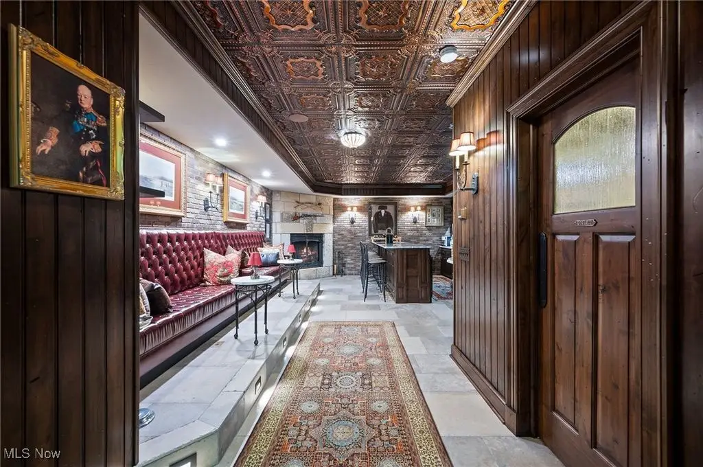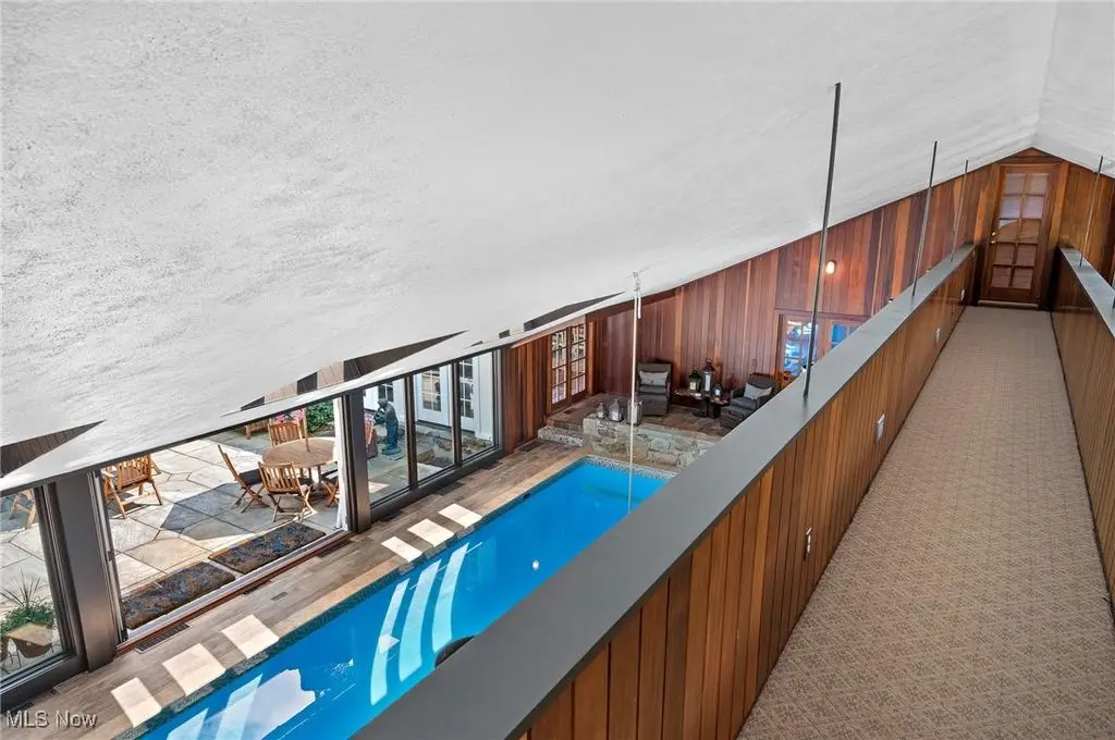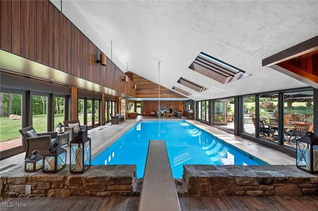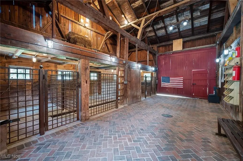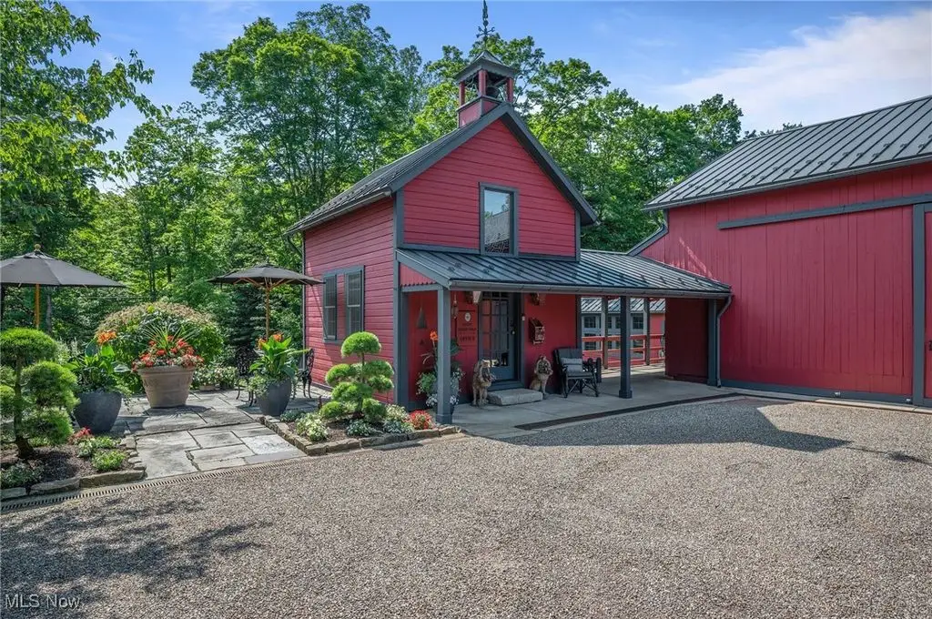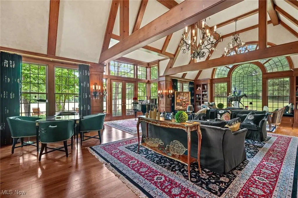 Set on 24 scenic acres of sweeping lawns & woodlands with 3 stocked fishponds, this magnificent English country estate, reimagined by renowned Cleveland architect Anthony Paskevich, offers an unparalleled living experience. A long, illuminated drive winds past original farmhouse & barn complex, leading through a tree-lined allee flanked by stunning gardens to the impressive main residence. A turreted entrance welcomes guests. The stone & clapboard exterior gives way to magnificent millwork, vaulted ceilings, arched doorways, oversized windows, and carefully selected stone & wood flooring. Designed for everyday living and grand entertaining, the generously sized gathering areas incl. a great room, formal dining room, family room, and solarium, all with fireplaces. A tranquil haven, the primary bedroom suite has dual baths and 4 additional suites incl. private baths. Enclosed by walls of glass, a spectacular pool pavilion opens to a stone patio overlooking breathtaking scenery and the exercise room, incl. sauna and steam room, epitomizes luxury & relaxation with a view. Approached by a brick courtyard, the custom-built, 1-bedroom guesthouse has an expansive brick terrace with geothermal heat, a fireplace and outdoor kitchen & pizza oven. With the richness & warmth of stone, brick, and wood, the bar room on the walk-out lower level exudes the charm of a traditional Scottish pub. The 2-car garage has an additional 1-bedroom, 1-bath guest suite on its upper level. Original farmhouse and one-room schoolhouse, moved to the property in the 1930s, are fully updated with modern amenities. The farmhouse has 3 bedrooms, 1.5 baths, wraparound porch, A/C and whole-house generator. The estate also has a fully restored, authentic barn complex - 4 frame buildings connected by a covered walkway: barn with 4 stalls & hayloft, greenhouse/studio, and detached 2-car and 4-car garages. Open fenced pastures with loafing sheds have ample space for horses, alpacas, or sheep to graze freely.