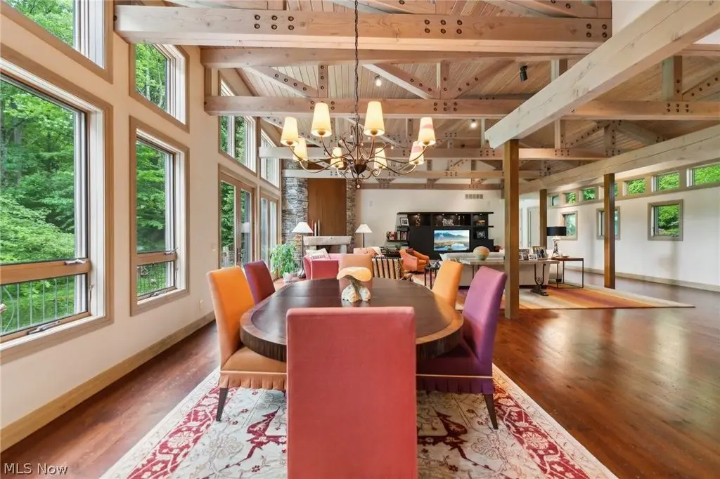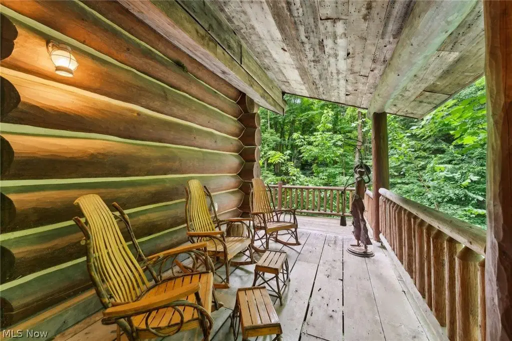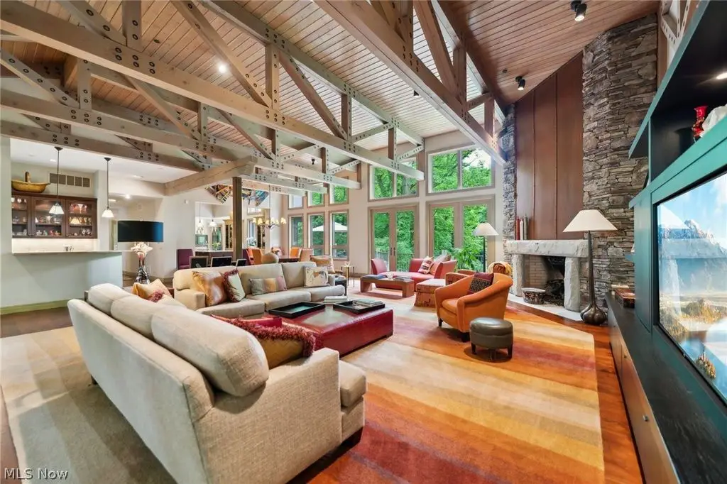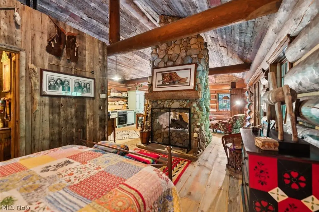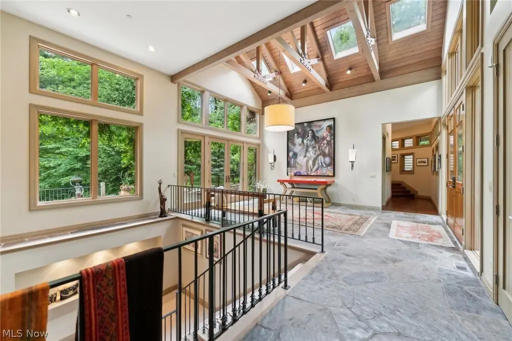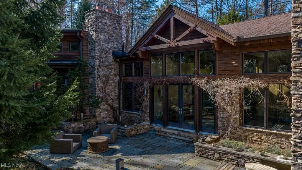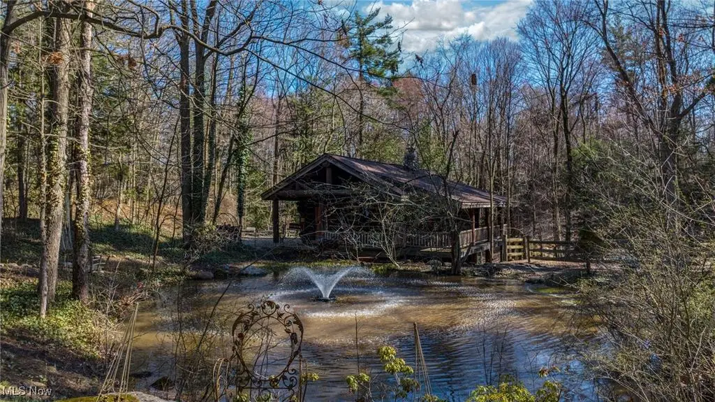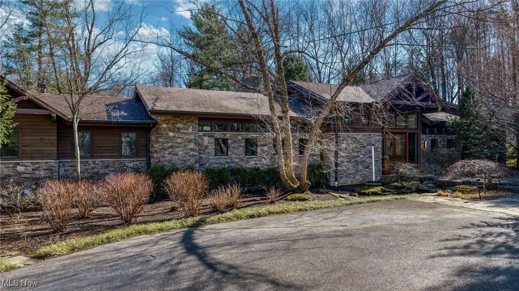 Nestled in the serene landscape of Hunting Valley, this exceptional property spans just over 5 acres and boasts striking architectural design that seamlessly blends natural elements like natural cedar and dry stack stone. The residence features soaring ceilings and walls of windows that frame breathtaking views of the rear pond, creating an ambiance of tranquility and connection to nature.The open and expansive floor plan is perfect for both everyday living and entertainment, highlighted by a first-floor primary suite offering his and her dressing rooms, a sitting room and direct access from the bath to a private stone terrace. Step outside from the bedroom to discover multiple outdoor spaces connecting to a large deck and stone terrace with an outdoor fireplace C/B?B= a true haven for relaxation and outdoor gatherings. A chef's dream kitchen awaits with a center island and informal dining area that opens to a delightful, screened porch, ideal for enjoying meals surrounded by the beauty of the outdoors. For those seeking additional charm and versatility, a short stroll down a path leads to an authentic log cabin featuring hand-hewn beams and a wraparound porch. Inside, the cabin exudes authentic character with a great room adorned by a sone fireplace, a galley kitchen, and a comfortable bedroom with an accompanying bath C/B?B= an idyllic retreat for guests or a perfect getaway space. This one-of-a-kind property harmoniously blends modern design sensibilities with the rust charm of a Frank Lloyd Wright -inspired aesthetic, offering a rare opportunity to experience sophisticated country living at its finest.
