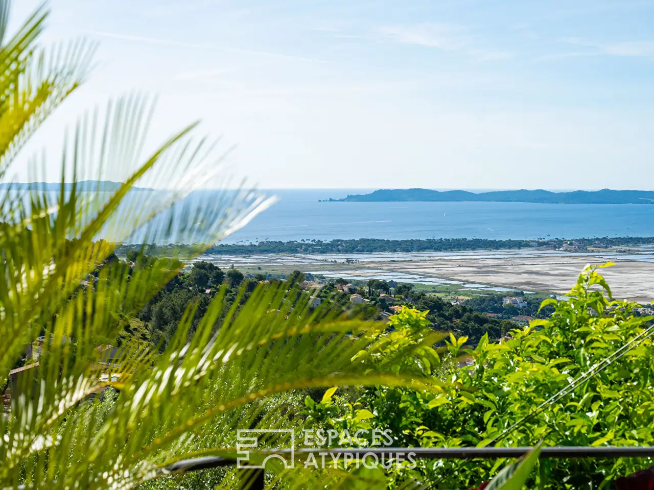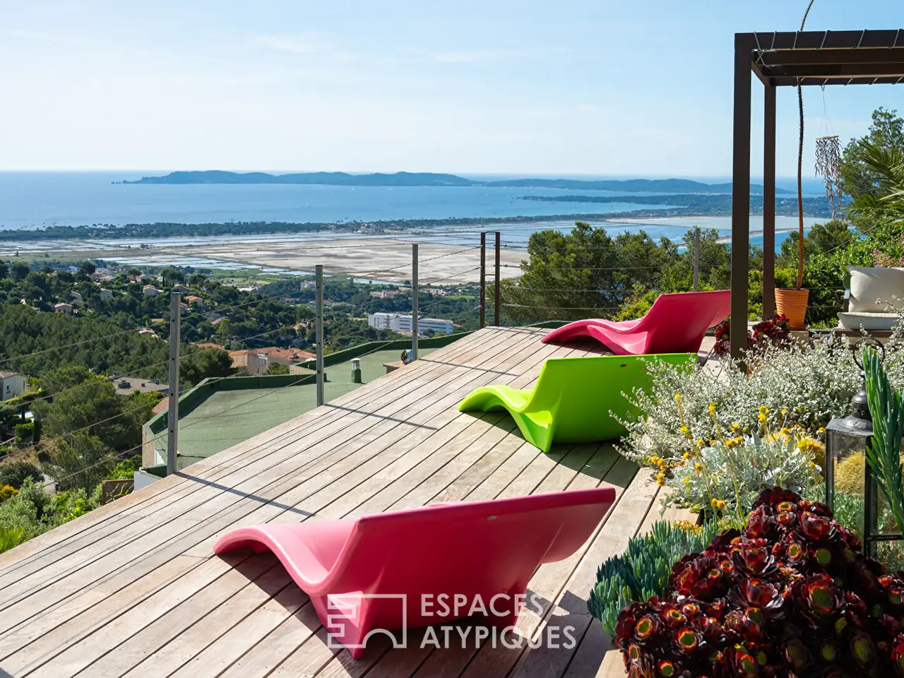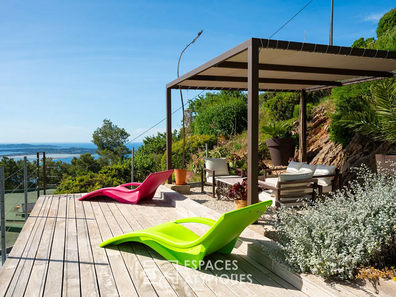 Clinging to the hillside as if suspended between sky and sea, this architect-designed house with immaculate lines, inspired by Greek lines, embraces the Mediterranean in a landscape sculpted by light and stone. A true refuge suspended between sky, rock and sea, it offers a 180° panoramic view as far as Porquerolles, offering a lively spectacle at every moment of the day. On 1500m2, its layout in successive terraces gives way to numerous relaxation areas: swimming pool, landscaped garden, terrace, solarium and rooftop, all in lush vegetation typical of the south. A permanent invitation to live indoors-outdoors, in complete privacy. A swimming pool elegantly integrated into the natural rock invites you to swim facing the horizon. A discreet entrance reveals a first independent volume, currently used as an 18m2 studio with terrace can accommodate family, friends or seasonal tenants, with separate access and a comfortable sleeping area. The 80sqm main house offers an atypical layout spread over different levels: two bedrooms with a mezzanine each, an exotic wood bathroom, and a bright living room with multiple openings, open to the horizon. The fitted kitchen in the extension completes this convivial space with Asian influences. In the upper part, access to a rooftop with an exceptional view offers a unique view of the sea and the surrounding vegetation. Just a few minutes from the beaches, Hyeres town center, and the ports, contemporary lines blend with organic volumes, creating a serene and fluid atmosphere. A building permit has been studied for an additional elevation of approximately 90 sqm, giving this property rare development potential in this highly sought-after area. Privileged access to a confidential beach and two tennis courts nestled in the heart of the condominium complete the assets of this property. An exceptional location for those looking for a unique property at the crossroads of sky, sea, and stone. ENERGY CLASS: D 227 CLIMATE CLASS: B 7 - Estimated average amount of annual energy expenditure for standard use, established using 2021 energy prices: between EUR1,660 and EUR2,290. Information on the risks to which this property is exposed is available on the Georisques website: www.georisques.gouv.fr Muriel CLADE REF. 11373 Additional information * 6 rooms * 3 bedrooms * 1 bathroom * 1 bathroom * Outdoor space : 1500 SQM * 250 co-ownership lots * Annual co-ownership fees : 900 € * Property tax : 1 500 € Energy Performance Certificate Primary energy consumption d : 227 kWh/m2.year High performance housing