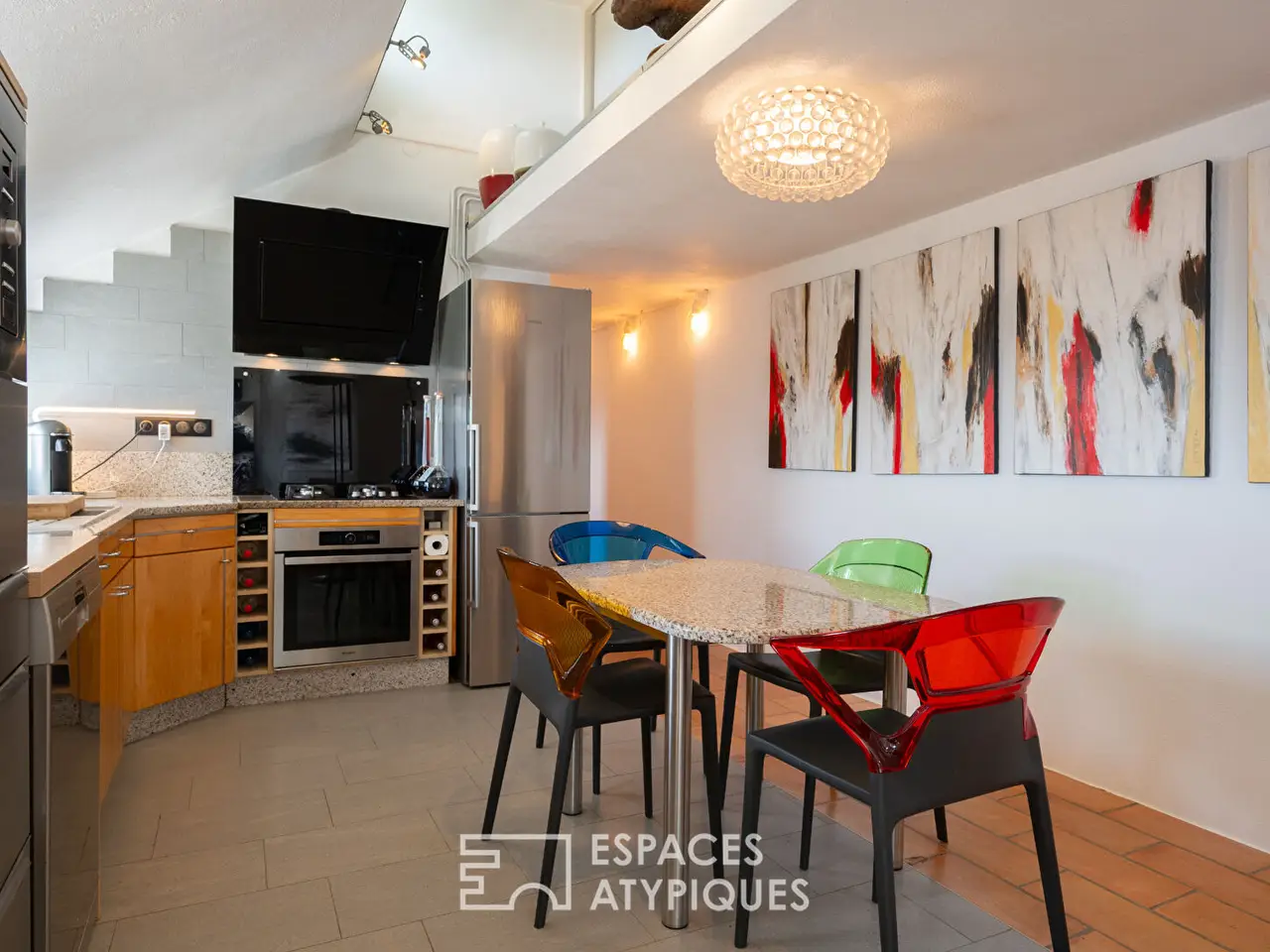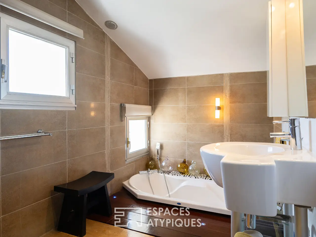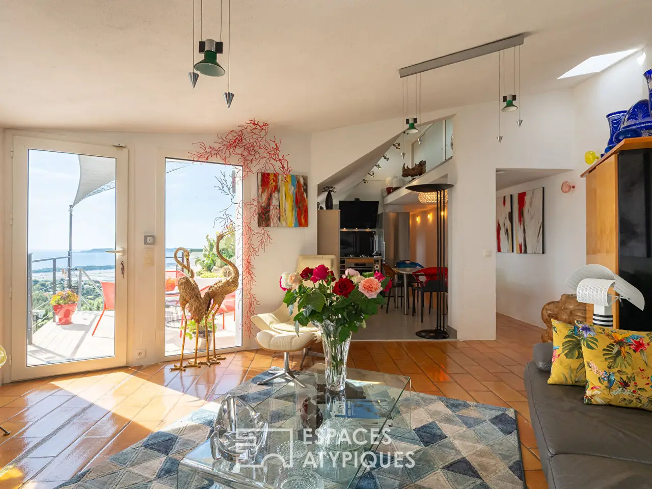 Clinging to the hillside as if suspended between sky and sea, this architect-designed house with immaculate lines, inspired by Greek lines, embraces the Mediterranean in a landscape sculpted by light and stone. A true refuge suspended between sky, rock and sea, it offers a 180° panoramic view as far as Porquerolles, offering a lively spectacle at every moment of the day. On 1500m2, its layout in successive terraces gives way to numerous relaxation areas: swimming pool, landscaped garden, terrace, solarium and rooftop, all in lush vegetation typical of the south. A permanent invitation to live indoors-outdoors, in complete privacy. A swimming pool elegantly integrated into the natural rock invites you to swim facing the horizon. A discreet entrance reveals a first independent volume, currently used as an 18m2 studio with terrace can accommodate family, friends or seasonal tenants, with separate access and a comfortable sleeping area. The 80sqm main house offers an atypical layout spread over different levels: two bedrooms with a mezzanine each, an exotic wood bathroom, and a bright living room with multiple openings, open to the horizon. The fitted kitchen in the extension completes this convivial space with Asian influences. In the upper part, access to a rooftop with an exceptional view offers a unique view of the sea and the surrounding vegetation. Just a few minutes from the beaches, Hyeres town center, and the ports, contemporary lines blend with organic volumes, creating a serene and fluid atmosphere. A building permit has been studied for an additional elevation of approximately 90 sqm, giving this property rare development potential in this highly sought-after area. Privileged access to a confidential beach and two tennis courts nestled in the heart of the condominium complete the assets of this property. An exceptional location for those looking for a unique property at the crossroads of sky, sea, and stone. ENERGY CLASS: D 227 CLIMATE CLASS: B 7 - Estimated average amount of annual energy expenditure for standard use, established using 2021 energy prices: between EUR1,660 and EUR2,290. Information on the risks to which this property is exposed is available on the Georisques website: www.georisques.gouv.fr Muriel CLADE REF. 11373 Additional information * 6 rooms * 3 bedrooms * 1 bathroom * 1 bathroom * Outdoor space : 1500 SQM * 250 co-ownership lots * Annual co-ownership fees : 900 € * Property tax : 1 500 € Energy Performance Certificate Primary energy consumption d : 227 kWh/m2.year High performance housing