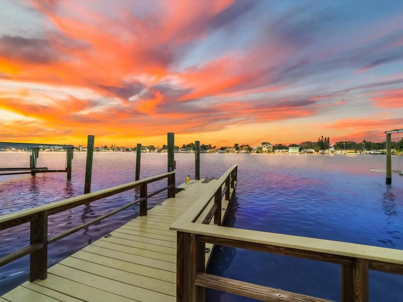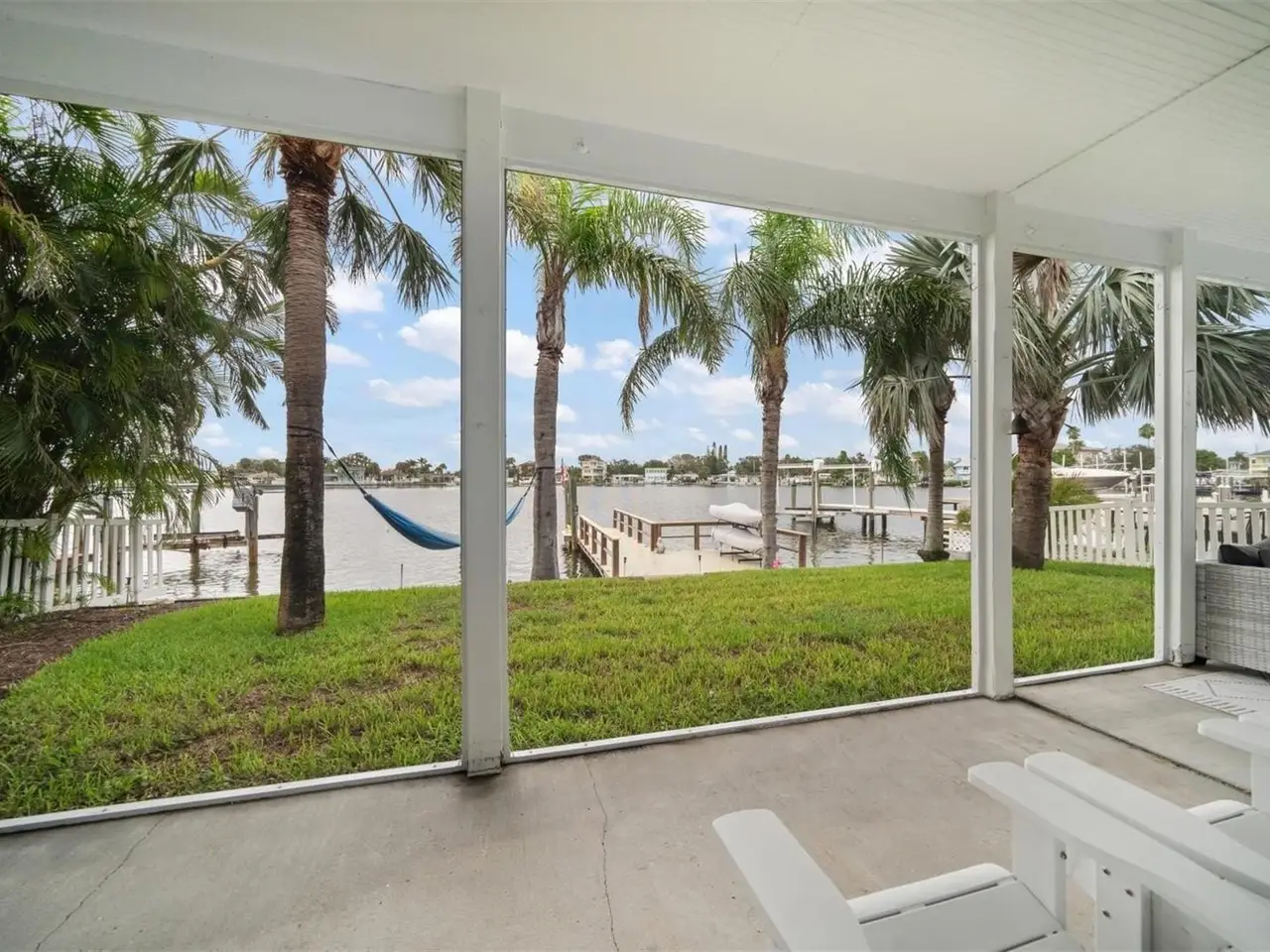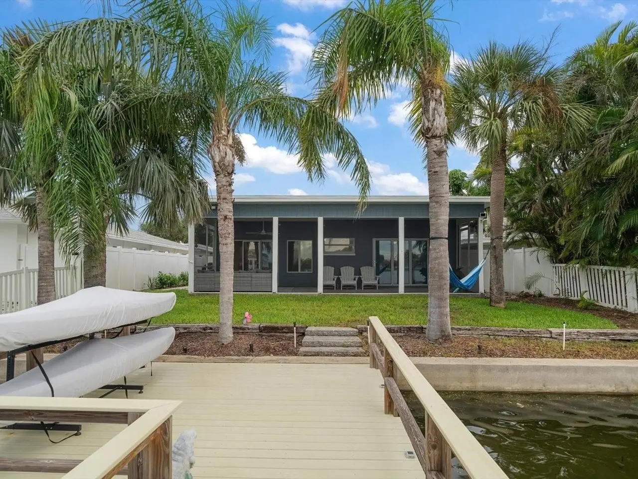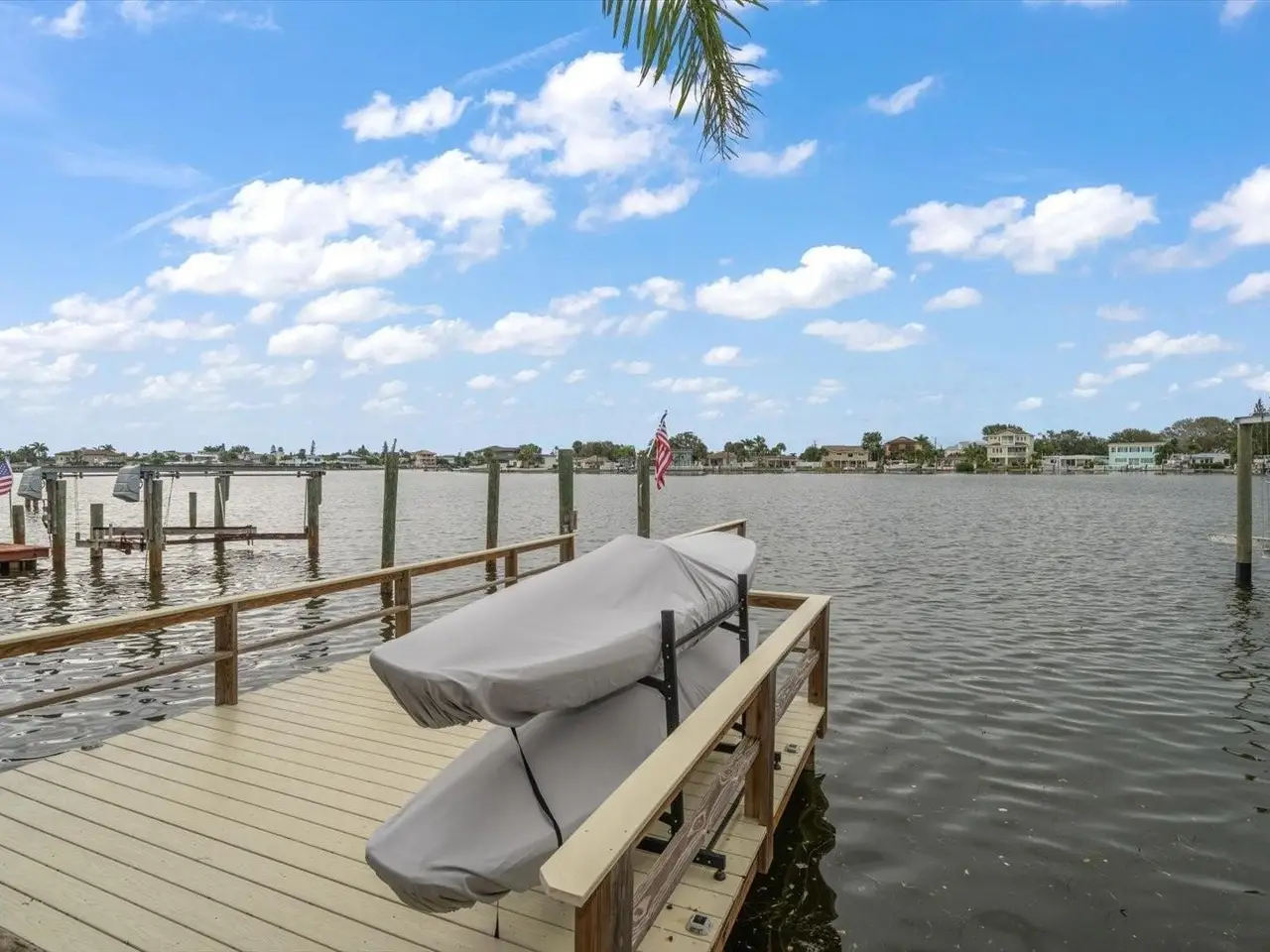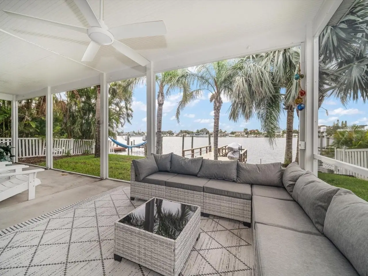 Beautifully remodeled and COMPLETELY furnished beach home located on a lovely protected cove offering wide water views from multiple areas. This is truly a beach charmer! Perfect location in the popular city of Indian Rocks Beach, known for its small-town atmosphere and pedestrian friendly environs, the spacious and open layout features two bedrooms, two full baths and additional living areas designed for easy carefree living! Exquisite kitchen! Chef’s will love this newer kitchen with neutral finishes, gleaming quartz counters, stainless appliances, large pantry and lots of cabinetry. Gathering with family or friends in the spacious dining area will create memories to last a life time with its captivating views. Appreciate the private dock area for fishing, launching your kayak or jumping on your paddle board, this charming beach property is also a fantastic investment with its sought-after community location that allows for short-term rentals, and its easy 2 minute walk to gorgeous beaches. This is not only a wonderful primary home but an ideal vacation retreat that can generate income thereby offsetting expenses where all the work is done! State of the art Nano folding doors, gorgeous ceramic tile flooring, beautifully remodeled kitchen, baths and impressive furnishing. Additional attributes include tankless hot water, oversized one car garage with laundry area and EV charger, plenty of additional parking for up to 6 vehicles in the low maintenance attractive driveway finished with pavers, and a completely fenced yard.