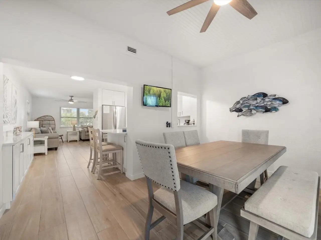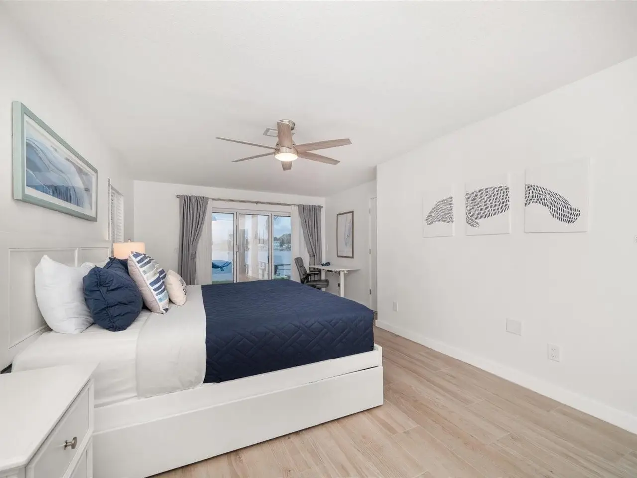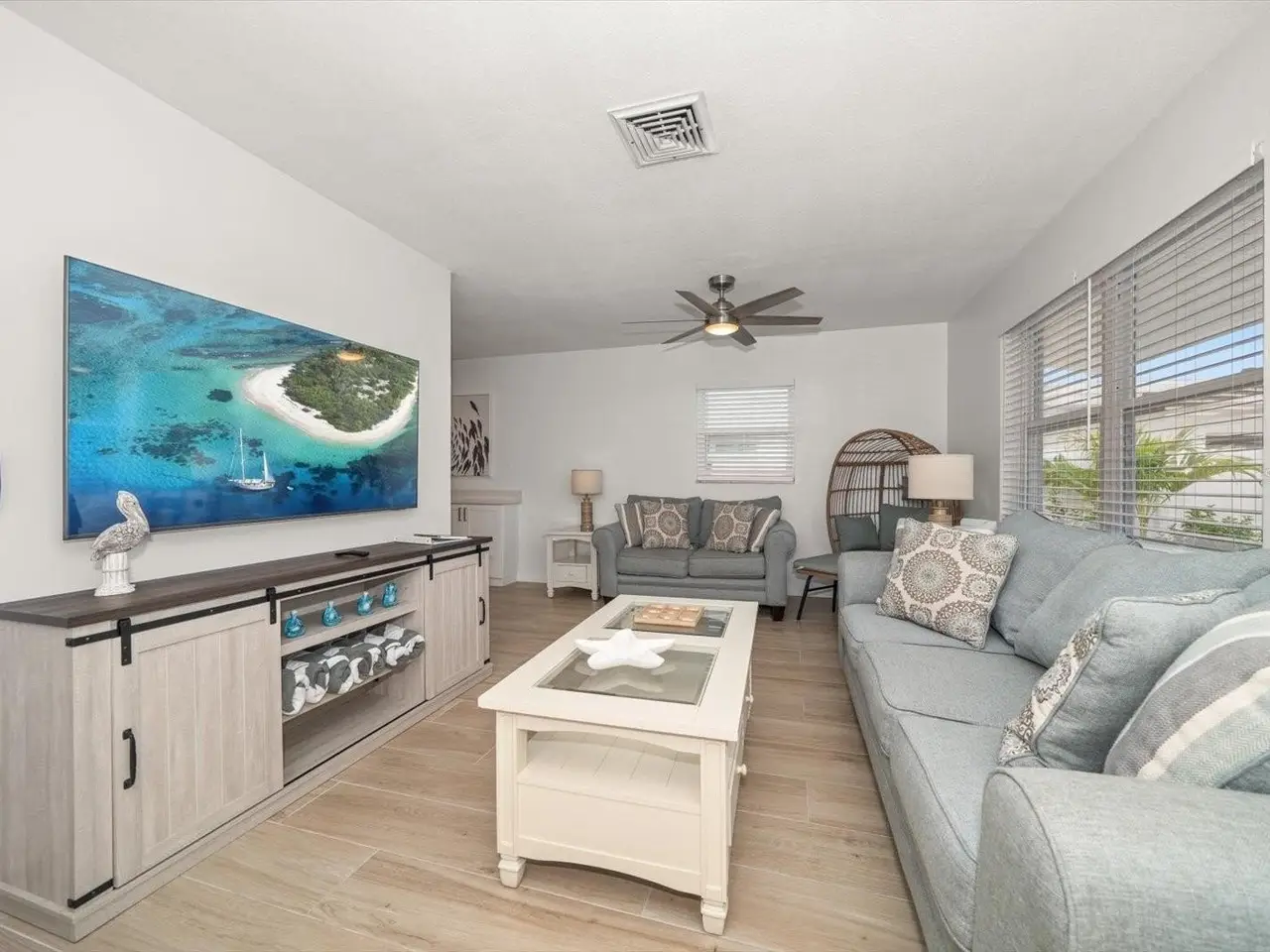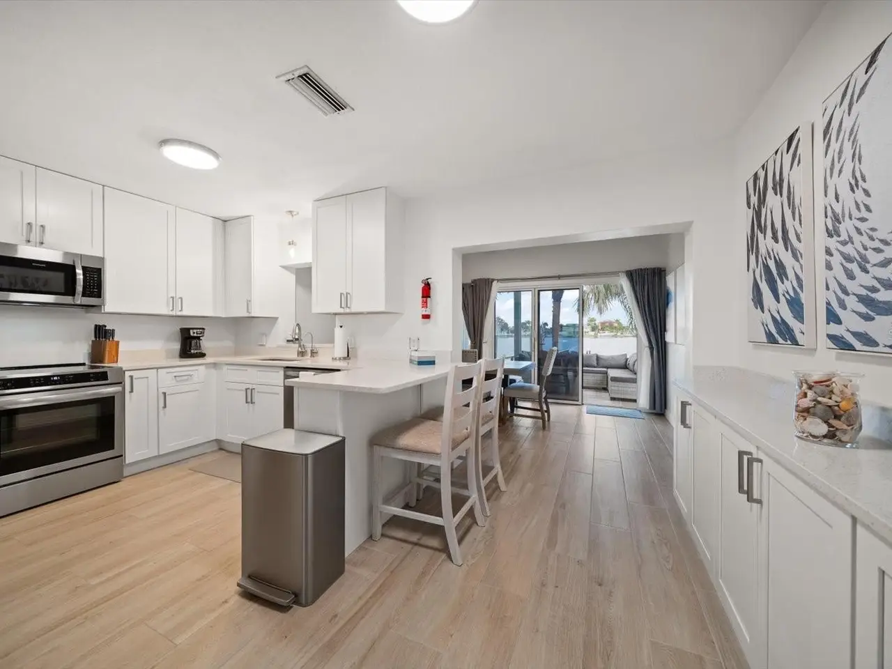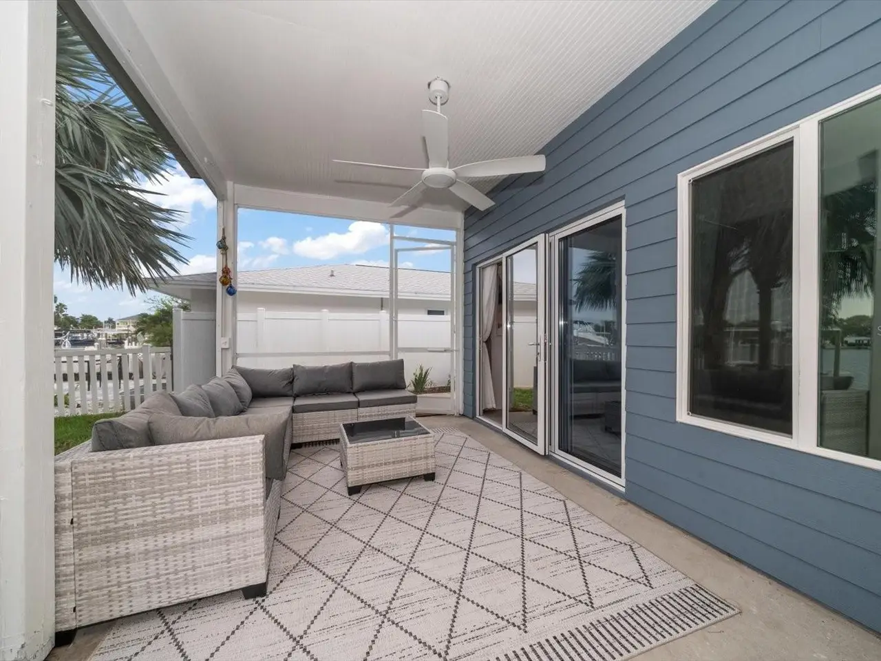 Beautifully remodeled and COMPLETELY furnished beach home located on a lovely protected cove offering wide water views from multiple areas. This is truly a beach charmer! Perfect location in the popular city of Indian Rocks Beach, known for its small-town atmosphere and pedestrian friendly environs, the spacious and open layout features two bedrooms, two full baths and additional living areas designed for easy carefree living! Exquisite kitchen! Chef’s will love this newer kitchen with neutral finishes, gleaming quartz counters, stainless appliances, large pantry and lots of cabinetry. Gathering with family or friends in the spacious dining area will create memories to last a life time with its captivating views. Appreciate the private dock area for fishing, launching your kayak or jumping on your paddle board, this charming beach property is also a fantastic investment with its sought-after community location that allows for short-term rentals, and its easy 2 minute walk to gorgeous beaches. This is not only a wonderful primary home but an ideal vacation retreat that can generate income thereby offsetting expenses where all the work is done! State of the art Nano folding doors, gorgeous ceramic tile flooring, beautifully remodeled kitchen, baths and impressive furnishing. Additional attributes include tankless hot water, oversized one car garage with laundry area and EV charger, plenty of additional parking for up to 6 vehicles in the low maintenance attractive driveway finished with pavers, and a completely fenced yard.