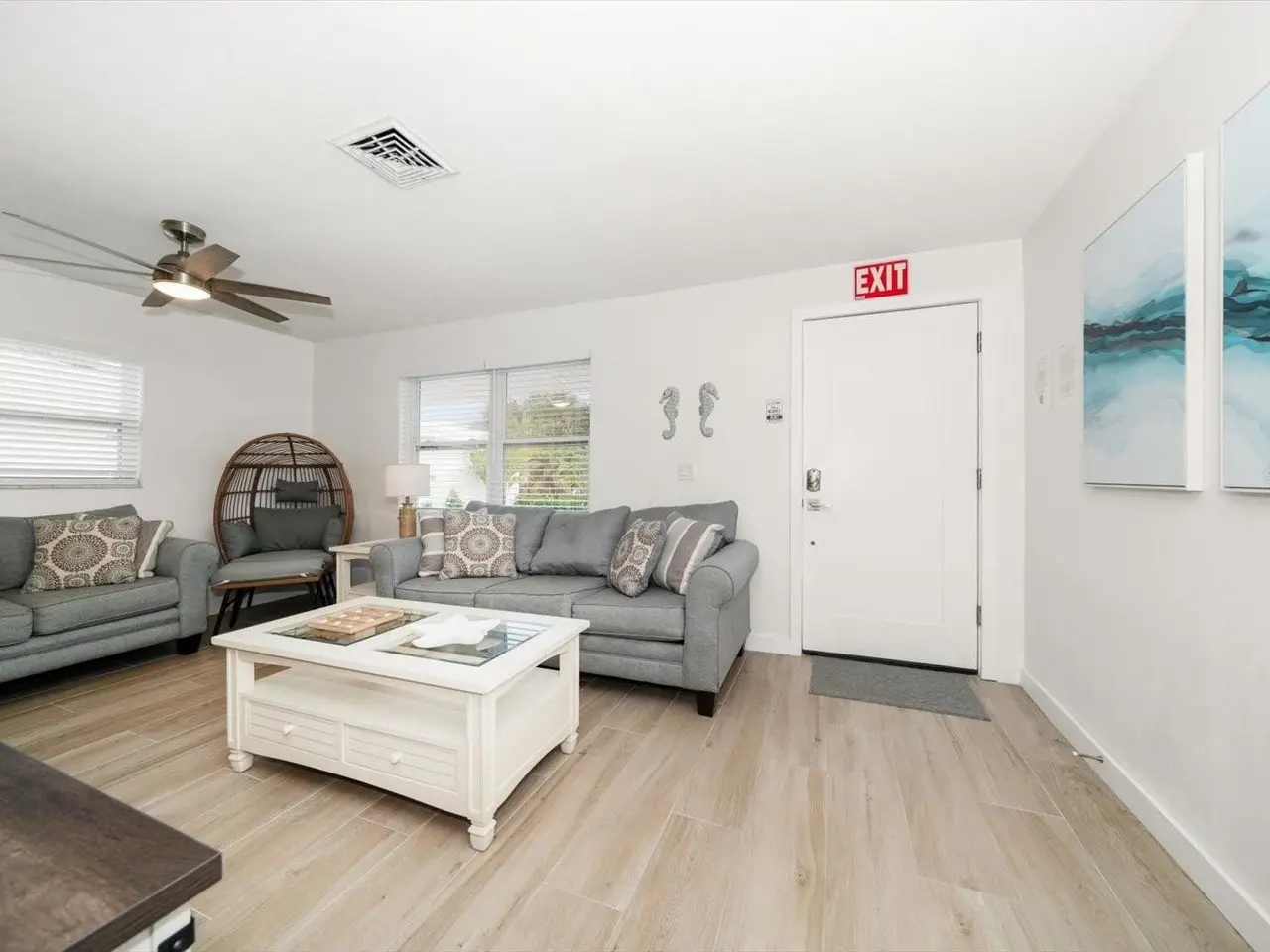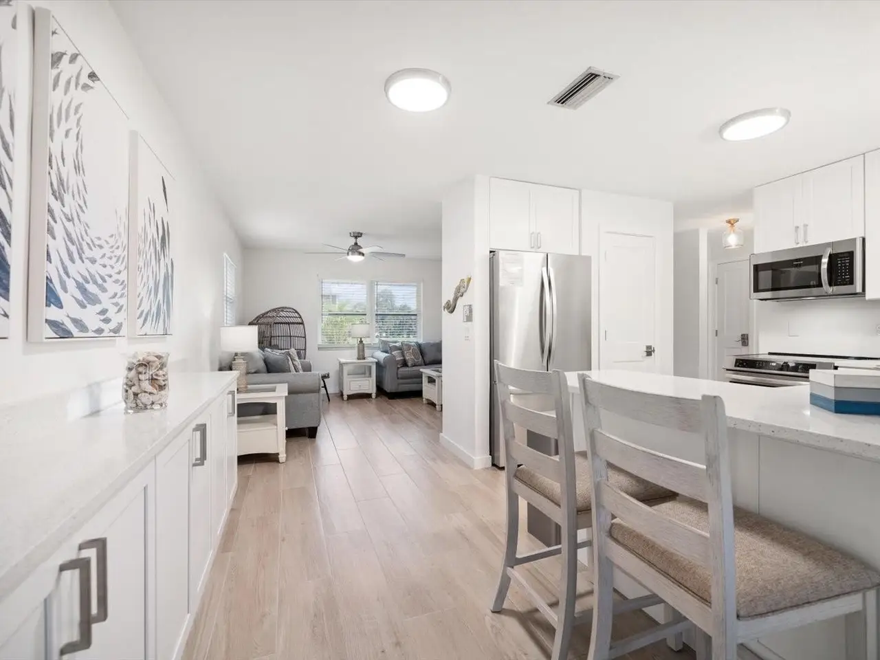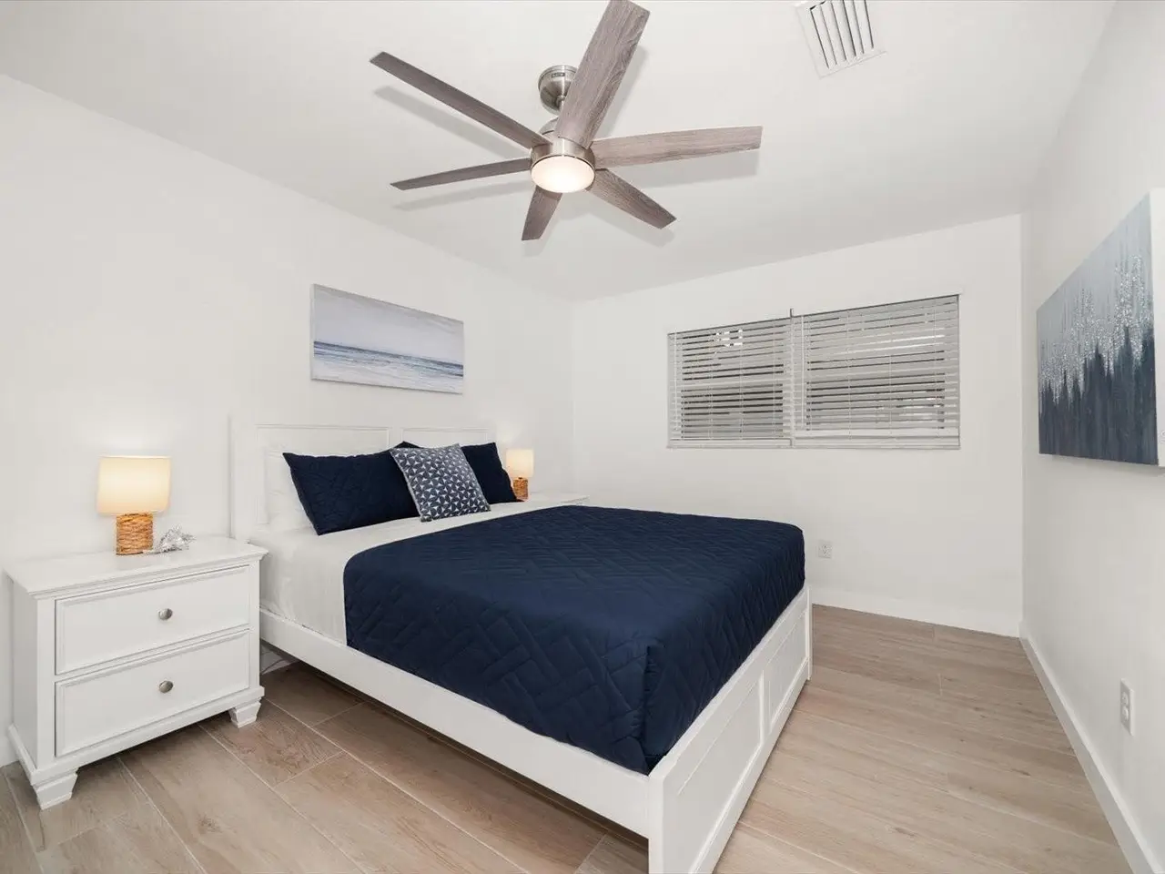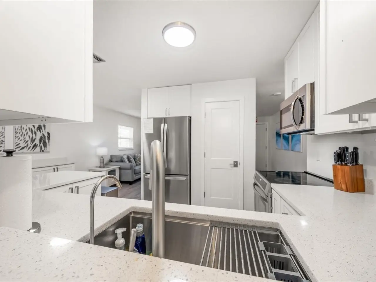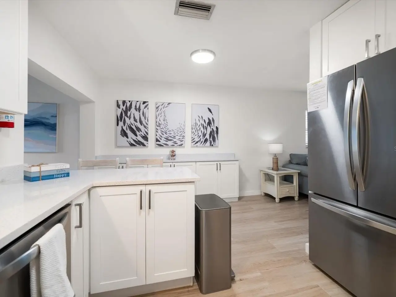 Beautifully remodeled and COMPLETELY furnished beach home located on a lovely protected cove offering wide water views from multiple areas. This is truly a beach charmer! Perfect location in the popular city of Indian Rocks Beach, known for its small-town atmosphere and pedestrian friendly environs, the spacious and open layout features two bedrooms, two full baths and additional living areas designed for easy carefree living! Exquisite kitchen! Chef’s will love this newer kitchen with neutral finishes, gleaming quartz counters, stainless appliances, large pantry and lots of cabinetry. Gathering with family or friends in the spacious dining area will create memories to last a life time with its captivating views. Appreciate the private dock area for fishing, launching your kayak or jumping on your paddle board, this charming beach property is also a fantastic investment with its sought-after community location that allows for short-term rentals, and its easy 2 minute walk to gorgeous beaches. This is not only a wonderful primary home but an ideal vacation retreat that can generate income thereby offsetting expenses where all the work is done! State of the art Nano folding doors, gorgeous ceramic tile flooring, beautifully remodeled kitchen, baths and impressive furnishing. Additional attributes include tankless hot water, oversized one car garage with laundry area and EV charger, plenty of additional parking for up to 6 vehicles in the low maintenance attractive driveway finished with pavers, and a completely fenced yard.