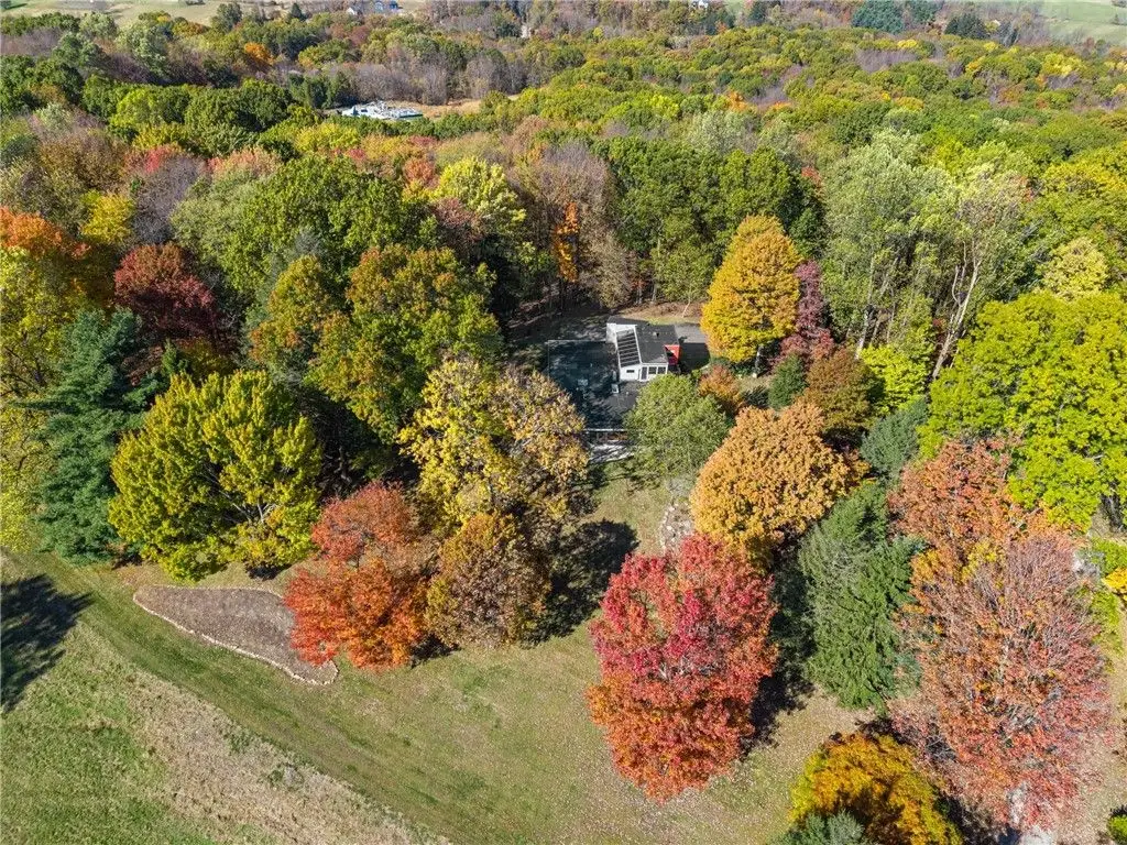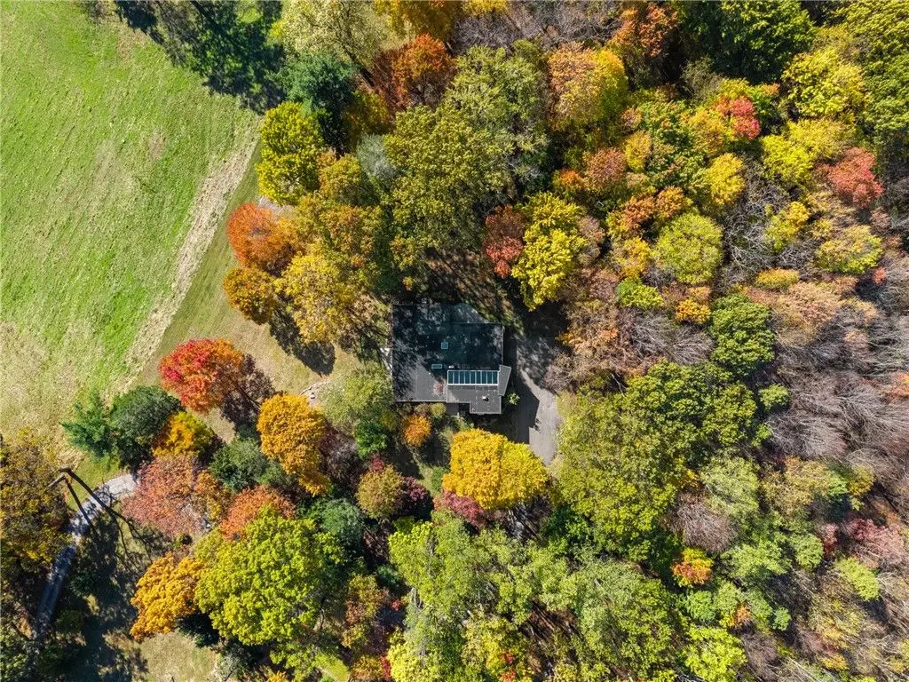 Secluded 17-acre retreat bordering Hartwood Acres Park with direct trail access and spectacular views! This unique property blends timeless charm with modern upgrades, including natural gas, city water, whole-house filtration, new septic and water lines, back-up generator, and dual HVAC systems. Custom cherry floors, built-in cabinetry, automatic blinds, and a whole-house audio system add warmth and functionality. Enjoy a professionally installed sauna, outdoor shower, fenced dog pen, and tranquil water features. The second-floor studio with full plumbing offers flexible living space - ideal for a guest suite or home office. With room to build a barn, this property is perfect for equestrians who dream of riding directly into Hartwood Acres. Whether you're seeking peace, creativity, or adventure, this move-in-ready home offers a lifestyle of comfort, privacy, and possibility. Access via a quiet private road. Split across 10 and 7 acre parcels.