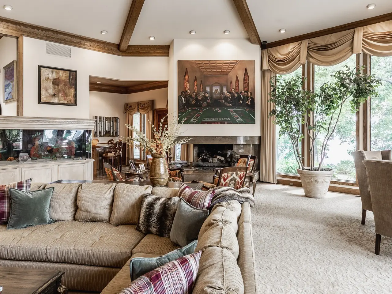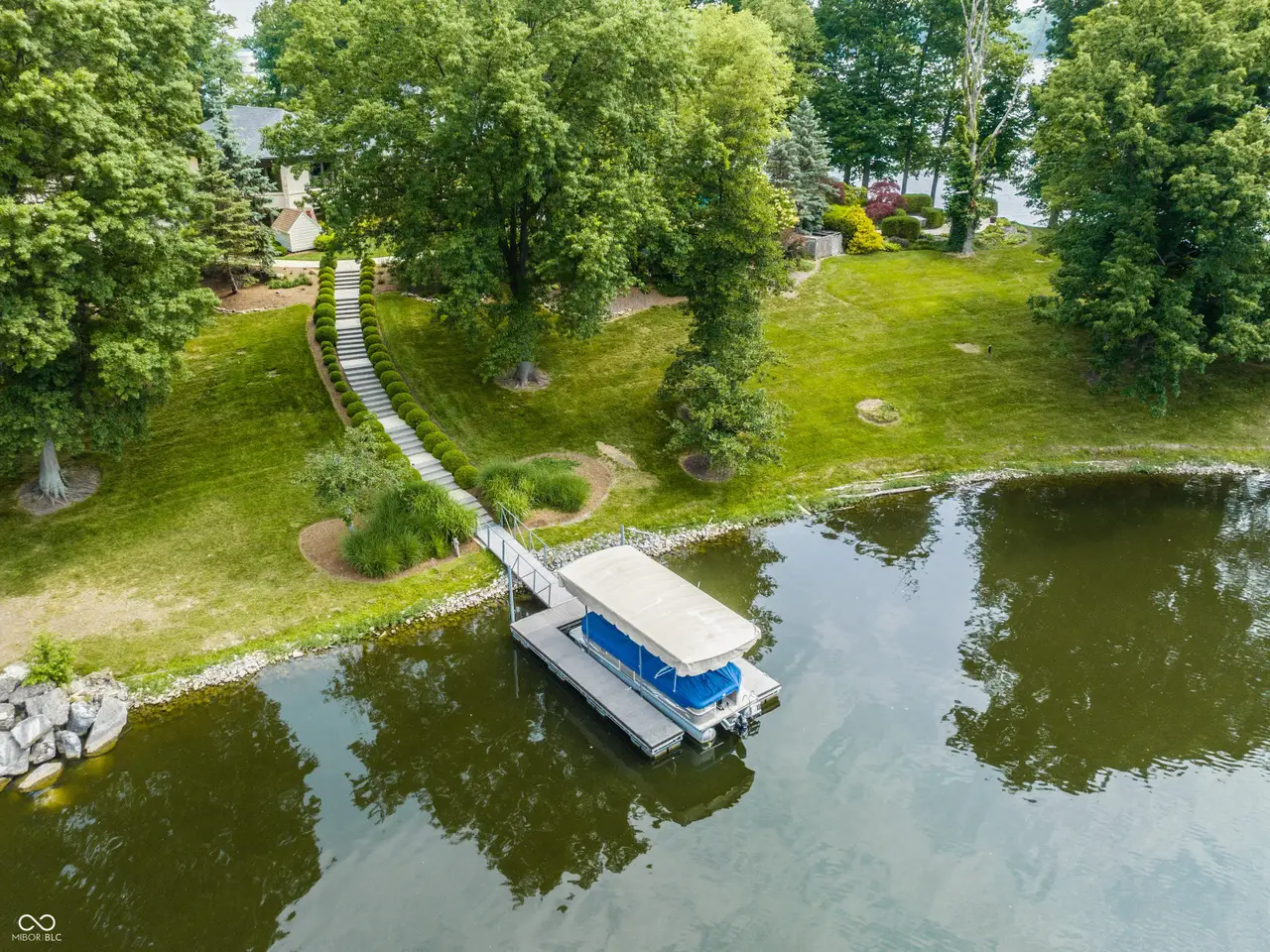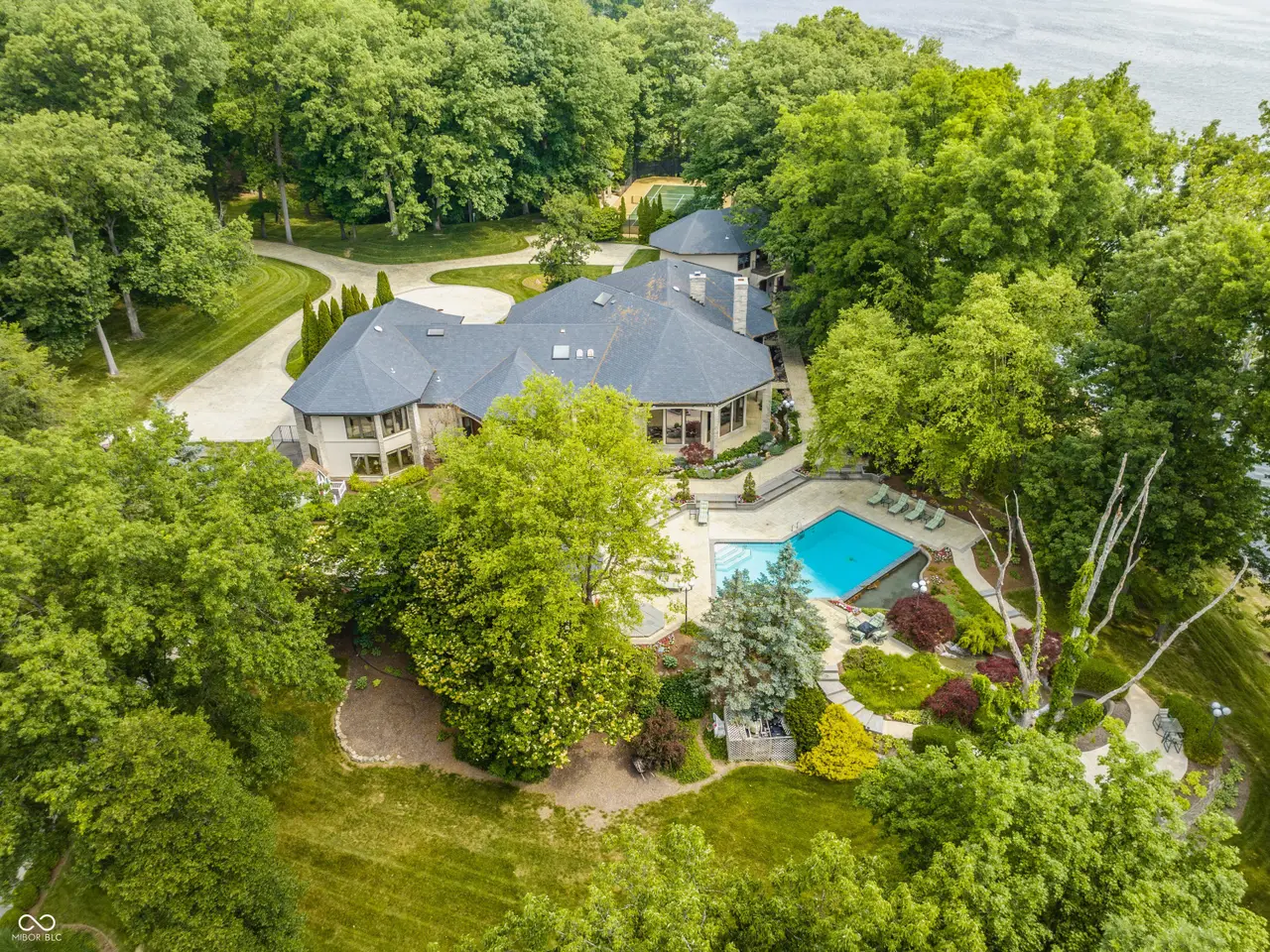 Exclusivity at its finest, this gated estate expands over 5.5 acres and is perfectly situated to capture breathtaking, panoramic views with 1,250 feet of water frontage on Eagle Creek Reservoir. The lush oasis creates the feeling of a serene, private sanctuary featuring a koi pond that spans the back of the home, Gunite swimming pool & spa w/cabana & tennis court w/cabana. A spacious great room welcomes guests w/expansive bay windows that brighten the room, which also features a vaulted ceiling w/exposed wooden beams, built-in aquarium, fireplace & adjoining bar area with access to the backyard retreat. Cozy den embellished with wood-paneled walls, built-ins & marble fireplace. Gourmet kitchen boats upscale appliances and a sun-washed breakfast area.