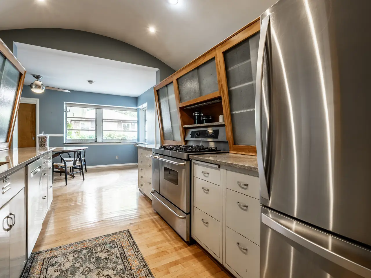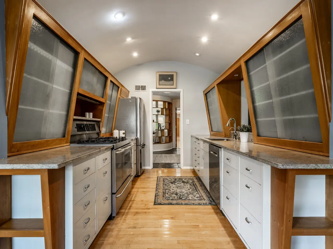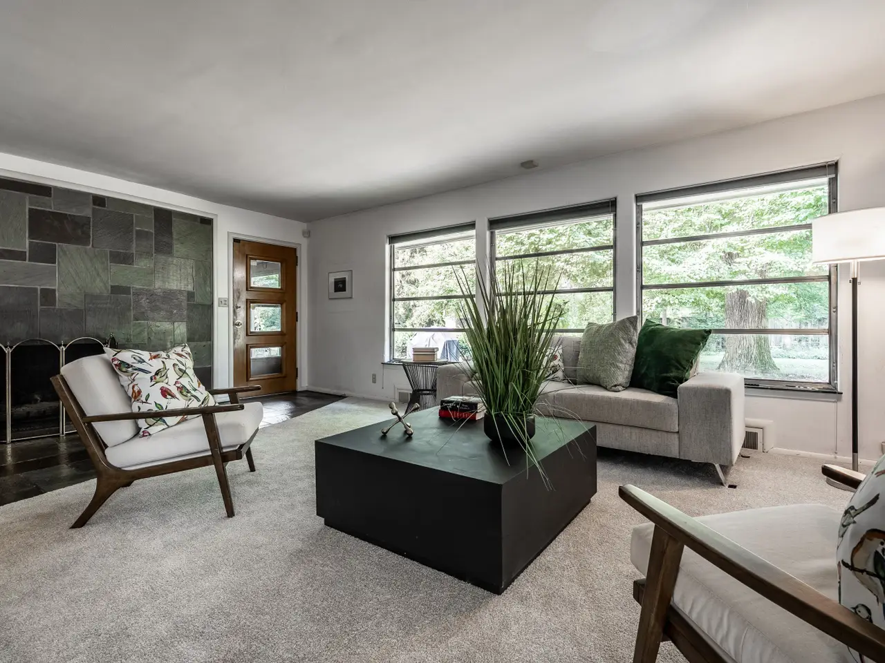Mid-century modern masterpiece, unique design, fine craftmanship, open floor plan and quality construction featuring curved windows and walls, solid oak doors, marble window sills and slate entrance foyer, hallway and gas fireplace. Updated kitchen with stainless steel appliances, arched ceiling, hardwood maple floors and granite countertops - yet mid-century elements have been maintained with original sliding glass doors and Jamestown steel cabinets. Bathroom plumbing has been updated, but again the stylistic integrity of the house has been maintained with ceramic tile and solid wooden cabinets. Large spacious bedrooms with an abundance of windows and light. Full 3500 square foot basement, with a finished study and playroom. House lies on close to an acre, immediately across from Indianapolis jewel, Holliday Park, currently undergoing a $6,000,000 renovation to what will soon be a state-of-the-art playground. Centrally located, only 20 minutes from downtown, this house seeks buyers who appreciate fine craftmanship, excellence in home-building, architectural integrity and materials and style that are rarely found in contemporary homes: Indiana limestone, slate, solid oak and steel.