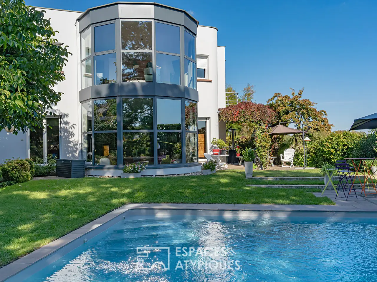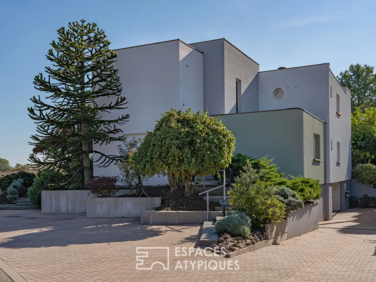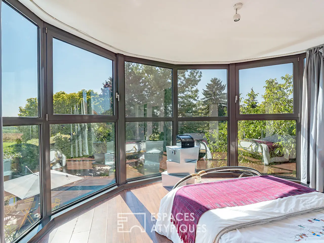 Located between Strasbourg and Obernai, this architect-designed house with a surface area of 394 m2 was built in 1995 on a wooded plot of over 11 acres. Its location on the edge of the village, its generous proportions, its separate professional space and its landscaped garden make it a rare property in a peaceful setting.The ground floor features a vast 150 m2 living space bathed in light, thanks in particular to an impressive glass roof offering a soothing view of the garden and swimming pool. The kitchen is subtly separated by a rounded glass brick wall, illustrating the interplay of curves and angles that makes this place so unique. An office adjoining the living room and a pantry complete this level.In the center of the living room, a beautiful spiral staircase topped by a skylight leads to the upper floor. The centerpiece of this level, the master suite benefits from the glass roof, offering an exceptional view of the garden, pool, and orchards. The upper floor is completed by an office, four other bedrooms, and several bathrooms, creating a sleeping area that is as spacious as it is functional.The basement houses a three-car garage, a wine cellar, a laundry room, a storage room, a spacious recreation room, and a wellness area with a sauna. Perfectly integrated and with its own entrance, the professional space consists of a waiting room and an office, an ideal layout for a liberal profession.The landscaped garden with trees, bordered by fields and orchards, is a true haven of peace. Surrounding the swimming pool, several terraces invite you to relax and enjoy good company. The combination of bold architecture, high-quality amenities, and a privileged environment gives this place a decidedly unique character.Shops 5 minutes' walk awaySchools 5 minutes' walk awayBus stop 5 minutes' walk awayNet seller price €1,332,697Fees of 4.75% payable by the buyer, i.e. €63,303REF. 1657Additional information* 12 rooms* 5 bedrooms* 2 bathrooms* 4 shower rooms* Floor : 3* 3 floors in the building* Outdoor space : 1126 SQM* Parking : 3 parking spaces* Property tax : 2 738 €Energy Performance CertificatePrimary energy consumptiond : 147 kWh/m2.yearHigh performance housing*A*B*C*147kWh/m2.year45*kg CO2/m2.yearD*E*F*GExtremely poor housing performance* Of which greenhouse gas emissionsd : 45 kg CO2/m2.yearLow CO2 emissions*A*B*C*45kg CO2/m2.yearD*E*F*GVery high CO2 emissionsEstimated average annual energy costs for standard use, indexed to specific years 2021, 2022, 2023 : between 5900 € and 8020 € Subscription IncludedAgency fees* Fees charged to the purchaser : 63 303 €MediatorMediation Franchise-Consommateurswww.mediation-franchise.com29 Boulevard de Courcelles 75008 ParisInformation on the risks to which this property is exposed is available on the Geohazards website : www.georisques.gouv.fr