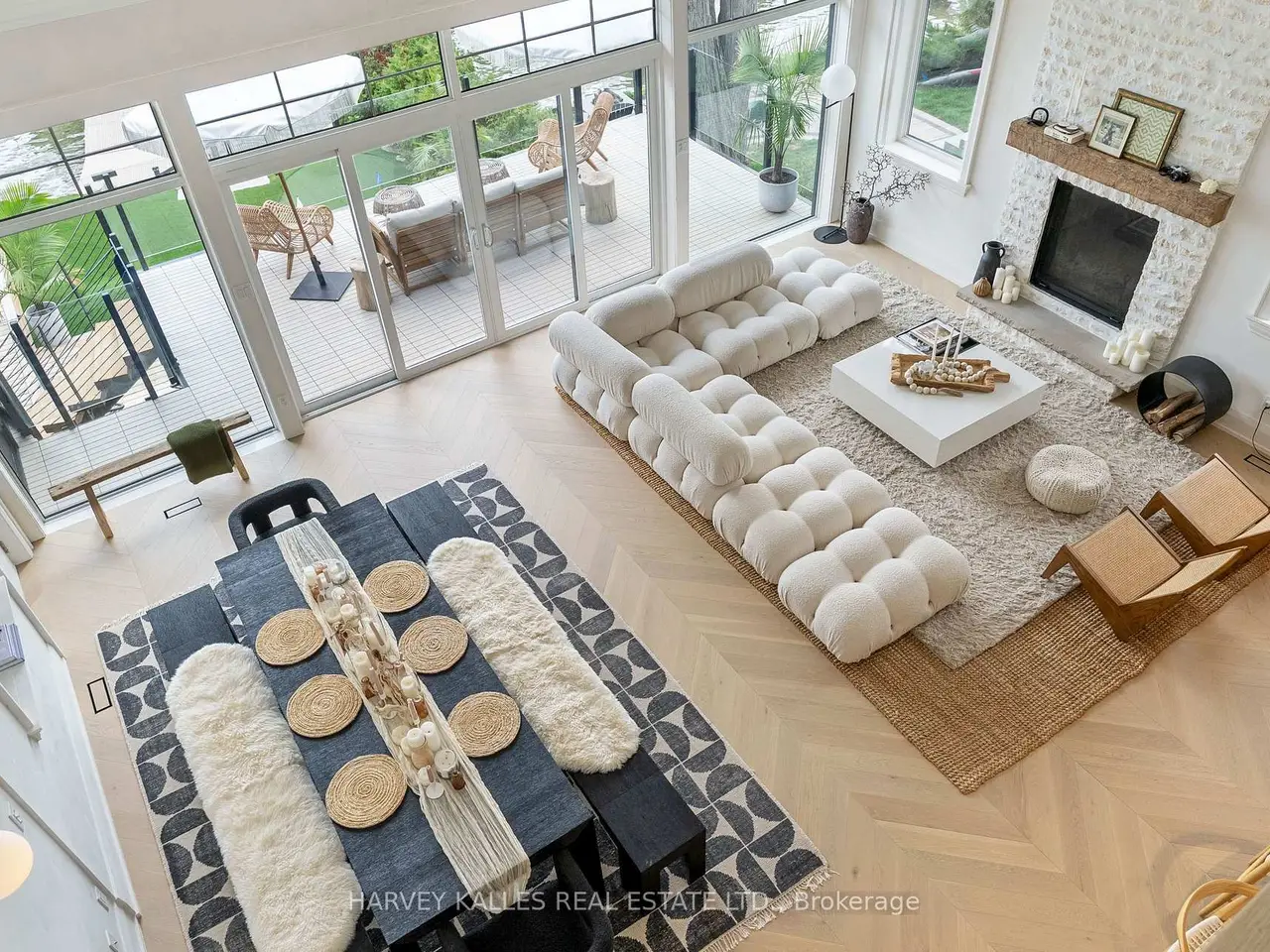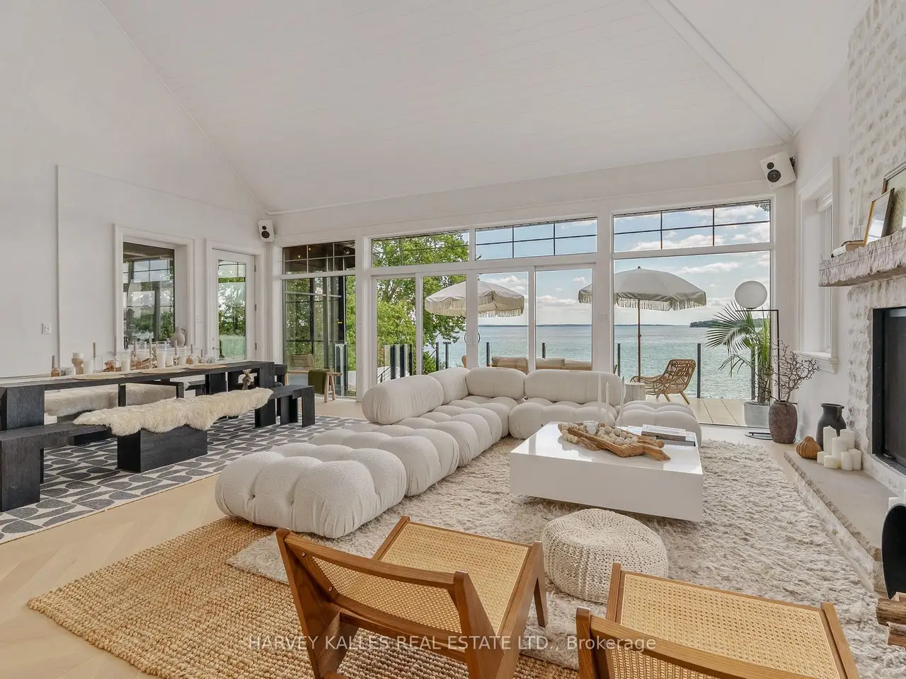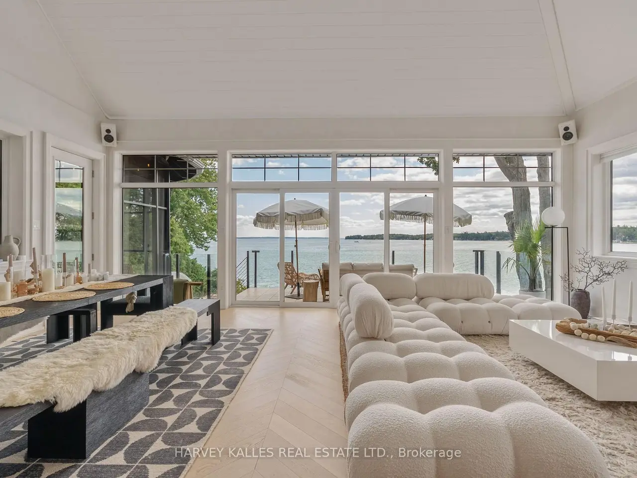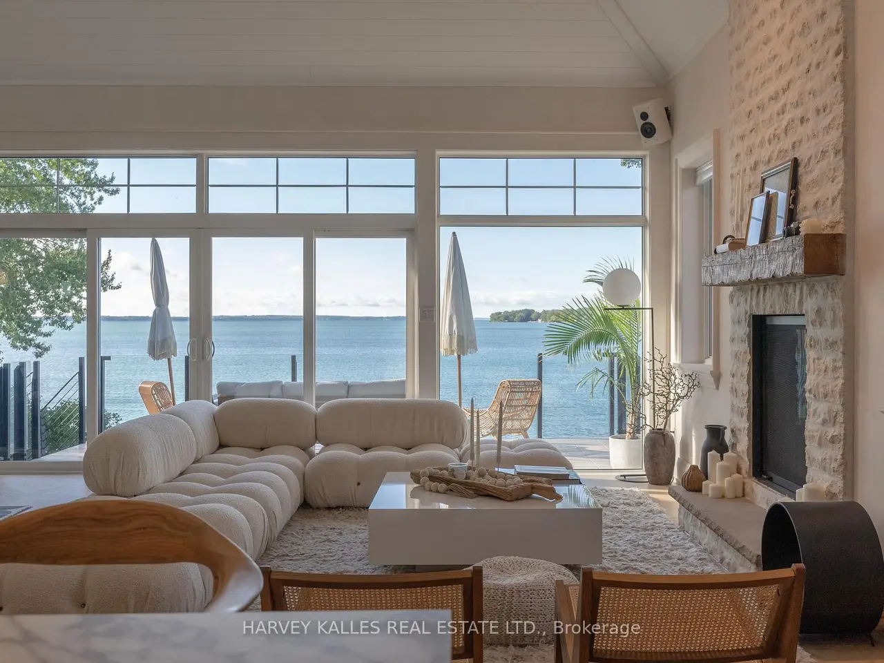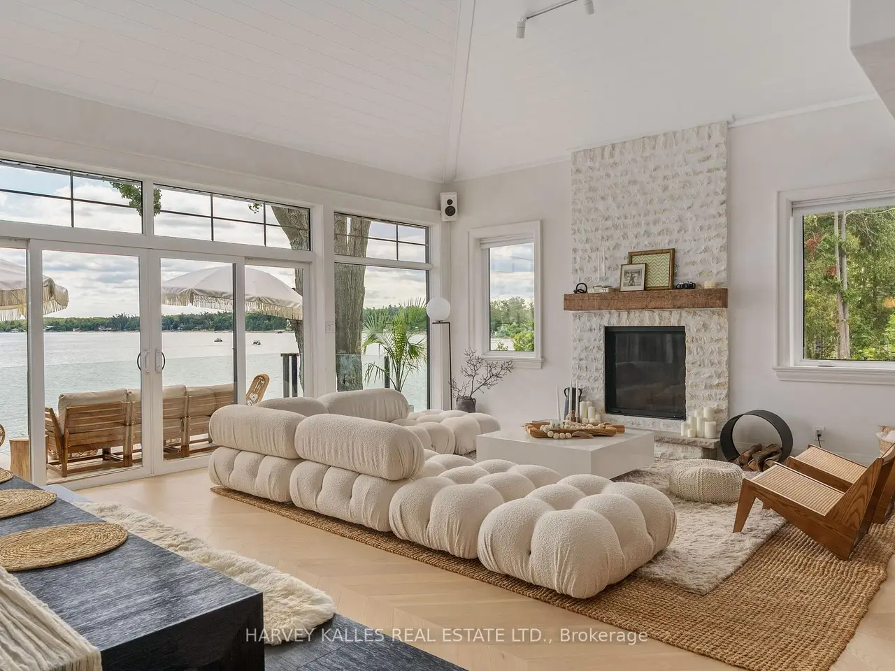 A rare architectural luxury waterfront residence blends concrete, glass, steel, and warm wood to create a one-of-a-kind Boho-modern retreat. Privately set off one of the finest sought after lakefront streets in Innisfil on Lake Simcoe, the home opens with a grand custom wood entry door into a dramatic space with polished concrete floors and soaring 20-foot ceilings layered in custom hung chandeliers. Walls of floor-to-ceiling glass and accordion-style doors blur the line between indoors and out, flooding the home with natural light and showcasing unobstructed lake views.A floating wood staircase /glass railings and custom finishes throughout reinforce the homes refined modern aesthetic. The gourmet kitchen is a showpiece with bespoke cabinetry, a large waterfall centre island, full service butlers pantry, and designer lighting. The expansive great room, with vaulted ceilings and statement fireplace, serves as the heart of the home framed by wall to wall south-facing windows capturing a panoramic lake view. Resort-style outdoor living is second to none. A two-story screened-in porch with glass, walk out to terrace lead to tiered entertainment spaces: a sun deck, custom wrought-iron stairway, built-in wood fire pit, hot tub, covered lounge areas, boathouse and putting green. Flagstone steps provide a gentle slope to the waters edge for seamless lake access.The lower level was designed for entertaining, featuring a recreation room with bespoke paneling, a backlit glass staircase, spa-inspired bath, and a concrete sit-up bar. With five bedrooms and multiple living and lounging areas, this property offers unparalleled space for family and guests.A truly rare offering modern design, resort amenities, and a world-class waterfront lifestyle converge in this extraordinary estate. ONE OF A KIND SHOWS A 10! (id:6370)