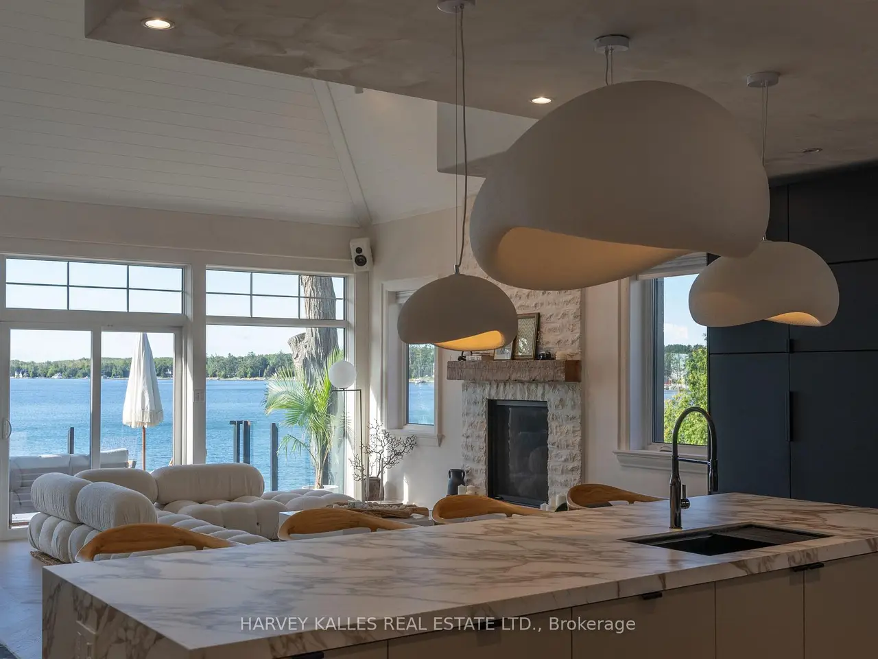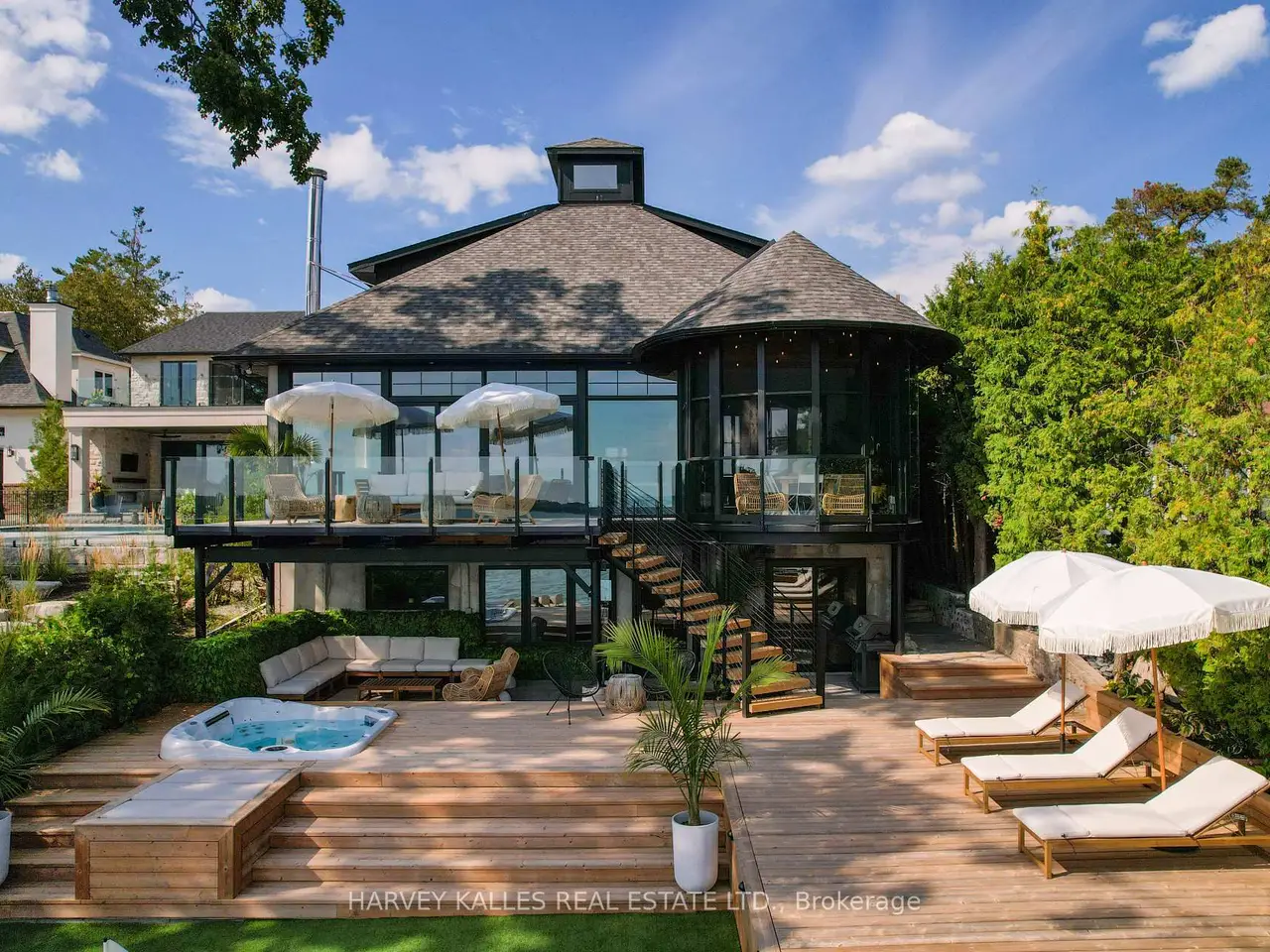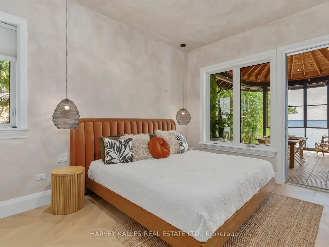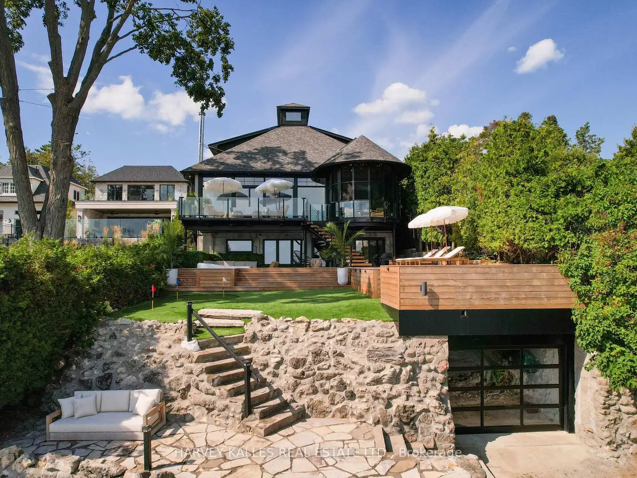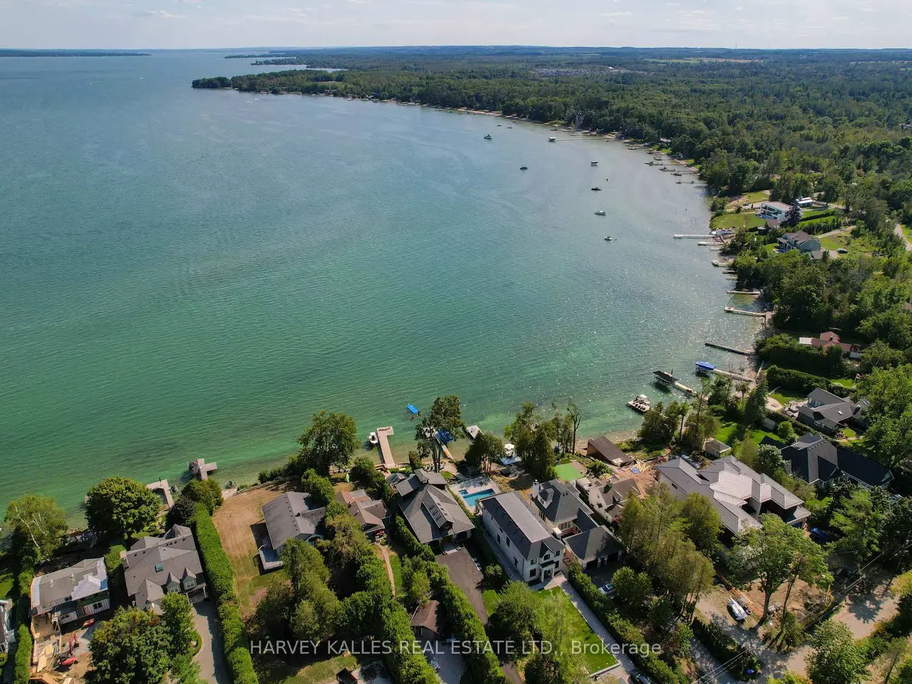 A rare architectural luxury waterfront residence blends concrete, glass, steel, and warm wood to create a one-of-a-kind Boho-modern retreat. Privately set off one of the finest sought after lakefront streets in Innisfil on Lake Simcoe, the home opens with a grand custom wood entry door into a dramatic space with polished concrete floors and soaring 20-foot ceilings layered in custom hung chandeliers. Walls of floor-to-ceiling glass and accordion-style doors blur the line between indoors and out, flooding the home with natural light and showcasing unobstructed lake views.A floating wood staircase /glass railings and custom finishes throughout reinforce the homes refined modern aesthetic. The gourmet kitchen is a showpiece with bespoke cabinetry, a large waterfall centre island, full service butlers pantry, and designer lighting. The expansive great room, with vaulted ceilings and statement fireplace, serves as the heart of the home framed by wall to wall south-facing windows capturing a panoramic lake view. Resort-style outdoor living is second to none. A two-story screened-in porch with glass, walk out to terrace lead to tiered entertainment spaces: a sun deck, custom wrought-iron stairway, built-in wood fire pit, hot tub, covered lounge areas, boathouse and putting green. Flagstone steps provide a gentle slope to the waters edge for seamless lake access.The lower level was designed for entertaining, featuring a recreation room with bespoke paneling, a backlit glass staircase, spa-inspired bath, and a concrete sit-up bar. With five bedrooms and multiple living and lounging areas, this property offers unparalleled space for family and guests.A truly rare offering modern design, resort amenities, and a world-class waterfront lifestyle converge in this extraordinary estate. ONE OF A KIND SHOWS A 10! (id:6370)