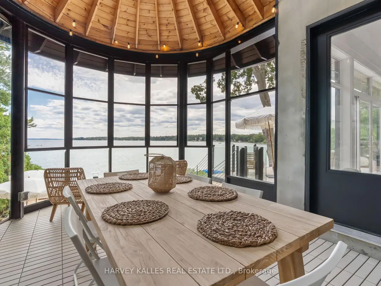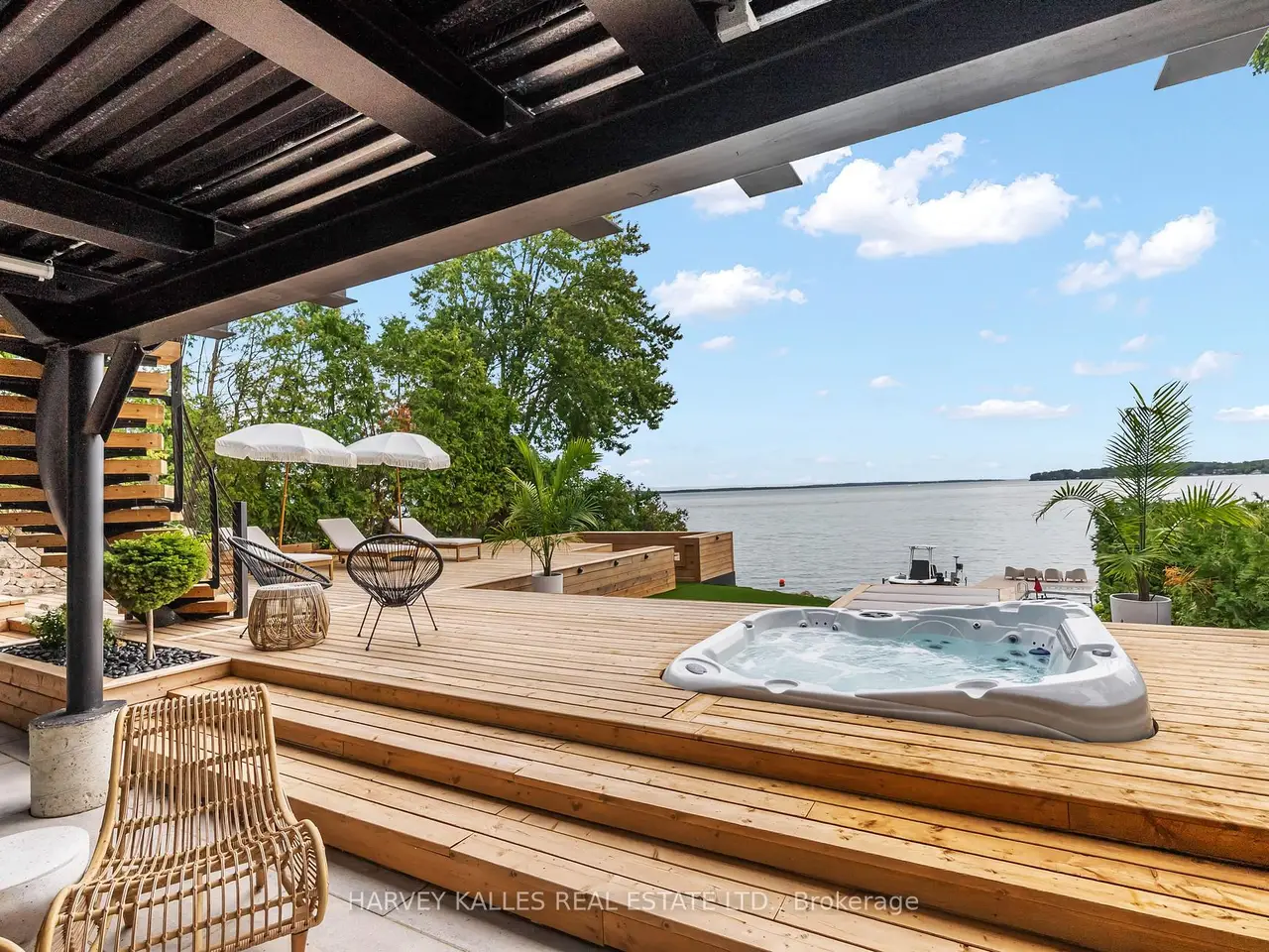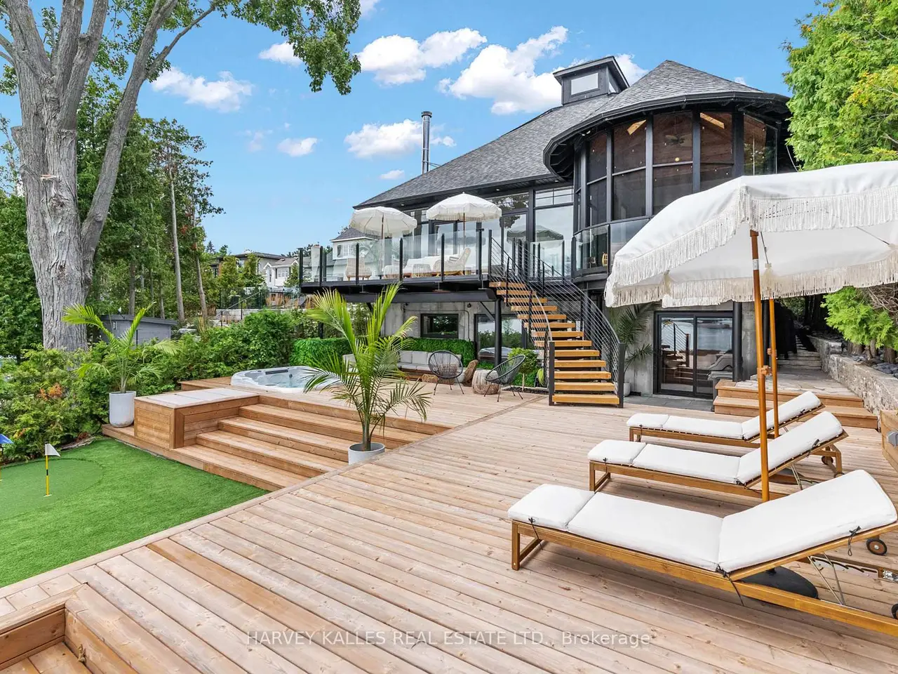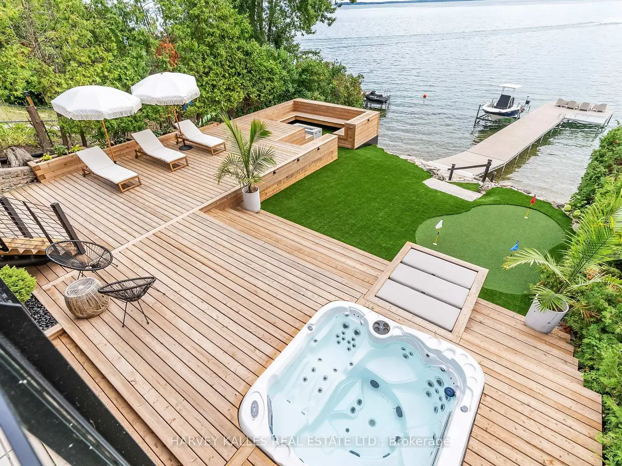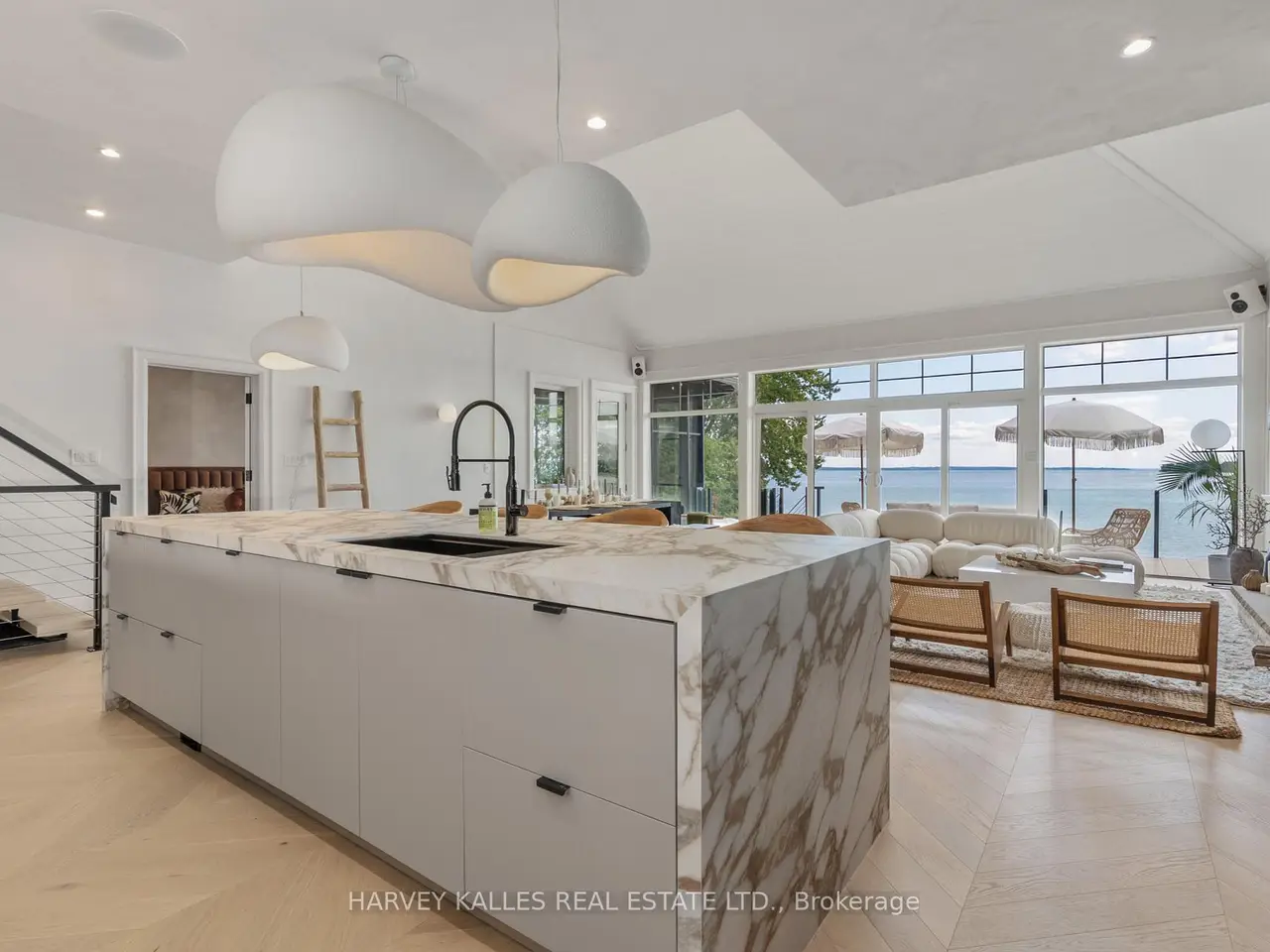 A rare architectural luxury waterfront residence blends concrete, glass, steel, and warm wood to create a one-of-a-kind Boho-modern retreat. Privately set off one of the finest sought after lakefront streets in Innisfil on Lake Simcoe, the home opens with a grand custom wood entry door into a dramatic space with polished concrete floors and soaring 20-foot ceilings layered in custom hung chandeliers. Walls of floor-to-ceiling glass and accordion-style doors blur the line between indoors and out, flooding the home with natural light and showcasing unobstructed lake views.A floating wood staircase /glass railings and custom finishes throughout reinforce the homes refined modern aesthetic. The gourmet kitchen is a showpiece with bespoke cabinetry, a large waterfall centre island, full service butlers pantry, and designer lighting. The expansive great room, with vaulted ceilings and statement fireplace, serves as the heart of the home framed by wall to wall south-facing windows capturing a panoramic lake view. Resort-style outdoor living is second to none. A two-story screened-in porch with glass, walk out to terrace lead to tiered entertainment spaces: a sun deck, custom wrought-iron stairway, built-in wood fire pit, hot tub, covered lounge areas, boathouse and putting green. Flagstone steps provide a gentle slope to the waters edge for seamless lake access.The lower level was designed for entertaining, featuring a recreation room with bespoke paneling, a backlit glass staircase, spa-inspired bath, and a concrete sit-up bar. With five bedrooms and multiple living and lounging areas, this property offers unparalleled space for family and guests.A truly rare offering modern design, resort amenities, and a world-class waterfront lifestyle converge in this extraordinary estate. ONE OF A KIND SHOWS A 10! (id:6370)