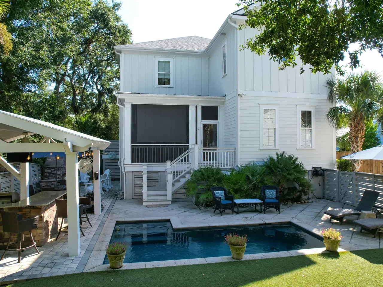 Coastal Luxury with Pool & Beach Access This 5-bedroom, 4.5-bath home combines refined design with thoughtful functionality, just steps from the sand. The open floor plan showcases rich hickory flooring, abundant natural light, and attention to detail throughout. At the heart of the home is the spacious kitchen with marble counters, abundant cabinetry, gas range, a butler's pantry with sink and beverage station that seamlessly flows into the family and dining areas. The first floor also features a private study/office, a separate dining room, and one of two expansive primary suites--ideal for multigenerational living. Upstairs, you'll find the second primary suite plus additional bedrooms for family and guests. The 2nd level also features an open area for gathering,a laundry room withplentiful storage and laundry sink. All of the guest bedrooms feature walk-in closets. One of these has a private bath the other two share a nicely done hall bath. The upstairs primary offers a handsome coffered ceiling, double walk-in closets and a well appointed bath. Then, just step outside where outdoor living takes center stage with a fabulous oasis featuring an in-ground pool, covered patio with a built-in grill, refrigerator, dining bar, tv, and an additional patio area with a true wood-burning fireplacperfect for entertaining year-round. The oversized detached garage includes finished space above, offering endless possibilities for an office, gym, playroom, or studio. All this, with convenient beach access (just through the back gate and less than a block away), makes this property the ultimate blend of elegance, comfort, and coastal convenience.