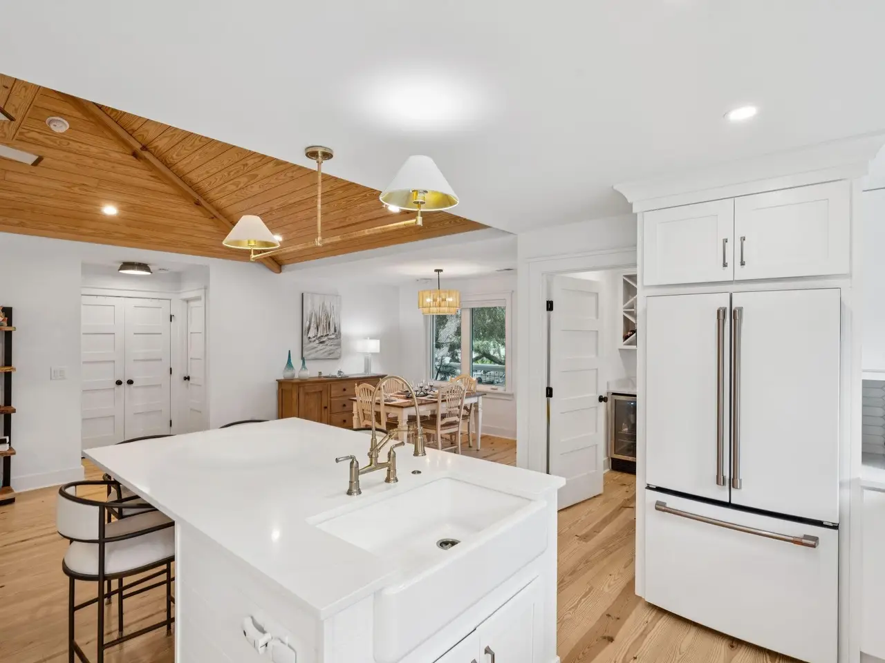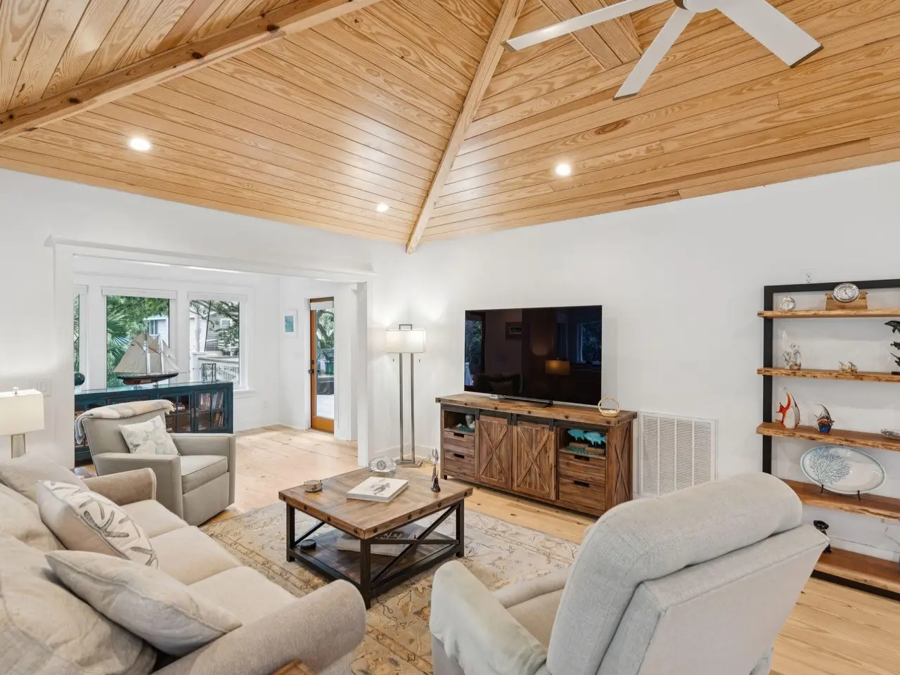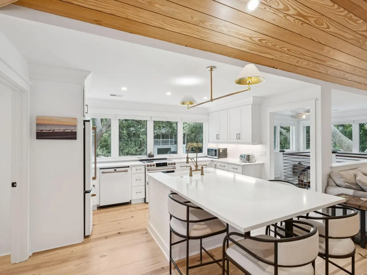 Experience the best of coastal living in this stunning and beautifully renovated beach cottage on the desirable south end of Isle of Palms. Located just two blocks from the beach access, this home has been meticulously updated from the studs out, ensuring modern comfort and peace of mind.Inside, the light-filled interior is a testament to sophisticated design. The open-concept main floor features beautiful new pine flooring and a vaulted pine ceiling in the living area, creating an airy and inviting atmosphere. The gourmet kitchen is a chef's dream, with a large island, custom cabinetry, quartz countertops, a Brizo kitchen faucet, and top-of-the-line GE Cafe series appliances, including a convection double oven.Main level includes a spacious primary suite with an en-suite bathroom, a guest bedroom, a full bathroom, and a large pantry for beach life entertaining. A beautiful wood spiral staircase leads to the lower level, which offers a versatile second living or play area, two additional bedrooms, and a large full bathroom. Outdoor living is a breeze with a large, private porch and a private outdoor shower. This wonderful home provides ample parking with six off street spaces and a one car garage. The home is equipped with new cement plank siding, impact-rated windows and doors, and new plumbing, electrical, and HVAC systems. Additional features include hurricane shutters, gutter guards, climate controlled storage room and new window treatments by Seaside Window Treatment. Only a short walk to island shops and restaurants and only a short drive to Downtown Charleston. This is an incredible opportunity to experience true beach life in the Lowcountry.