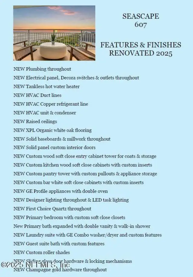 Be the first to live in this completely renovated unit! Stripped to the concrete floors & ceiling 2025 this 2BR/2BA boasts light & bright coastal vibes. Floor to ceiling glass w/ocean views from main areas & bedrooms. NEW raised ceilings, NEW XPL white oak flooring, NEW millwork, NEW solid panel interior doors, NEW custom coat closet, NEW custom bar, NEW custom pantry w/pullouts & small appliance storage, NEW custom kitchen w/cutlery & utensil inserts, regular & recycle trash cabinet, NEW GE Profile appliances including double oven, NEW designer & LED task lighting, NEW custom walk-in closets, NEW expanded primary bath, NEW custom laundry suite w/GE combo W/D, NEW custom automated shades, NEW first choice quartz counter tops, NEW champagne gold hardware, NEW sliding glass doors hardware & locking mechanisms, NEW plumbing, NEW electrical panel, Decora switches & outlets, USBC outlets, NEW HVAC duct lines, NEW HVAC air handler & condenser, NEW copper refrigerant line, NEW tankless HWH. Seascape completed a $7 million restoration May 2025 and the assessment has been paid in full. HOA dues include (2) pools, pool kitchen, fitness center, BBQ area, children's pool, bike storage, building insurance, grounds maintenance, on-site property management, water, sewer and trash. SELLER REQUIRES pre-approval or POF letter to tour this unit